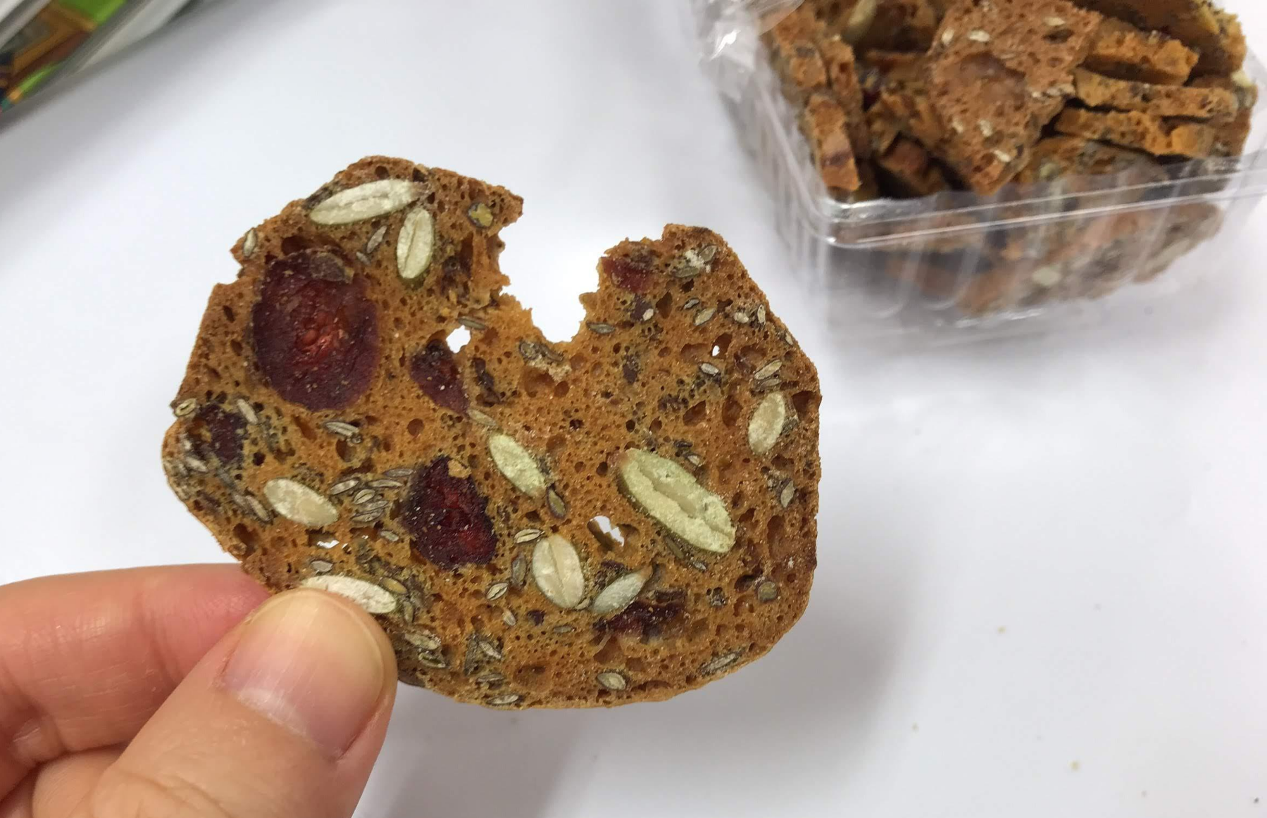 크랜베리와 호박씨가 팍팍 박혀 있는데, 한 개 한 개가 꽤 얇다. 얇아서 더 크래커 식감을 잘 느낄 수 있다. 바삭바삭하면서 크랜베리의 쫄깃하고 달콤한 맛과 호박씨의 고소함이 혓바닥 위에서 춤을 춘다. 춤도 왈츠가 아니고 룸바쯤은 되는 것 같다.