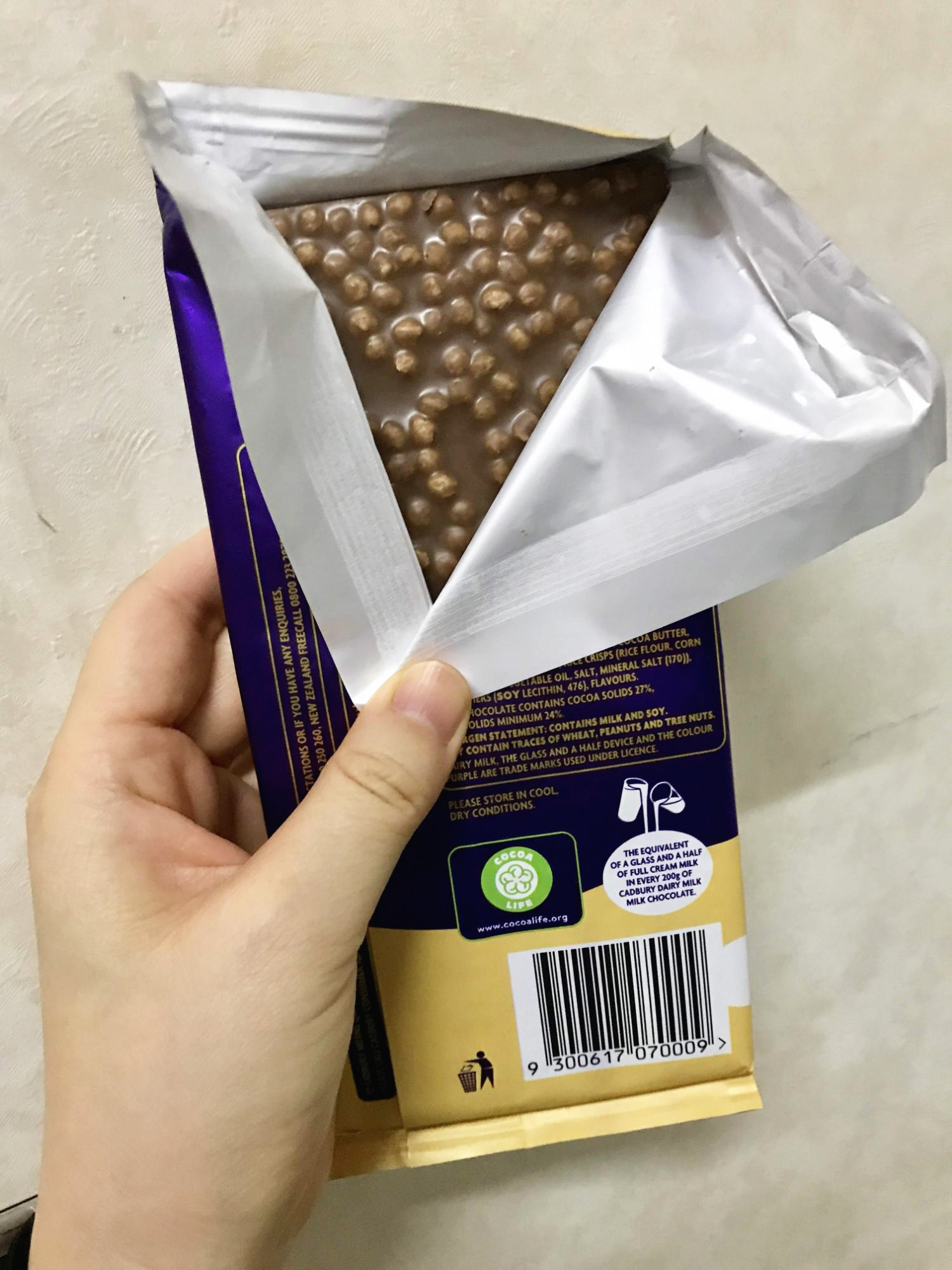 맛은 진한 밀크 초콜릿이고 rice crisp 라는 말 답게 쌀뻥튀기 같은 게 초콜릿 안에 박혀 있는 거다.