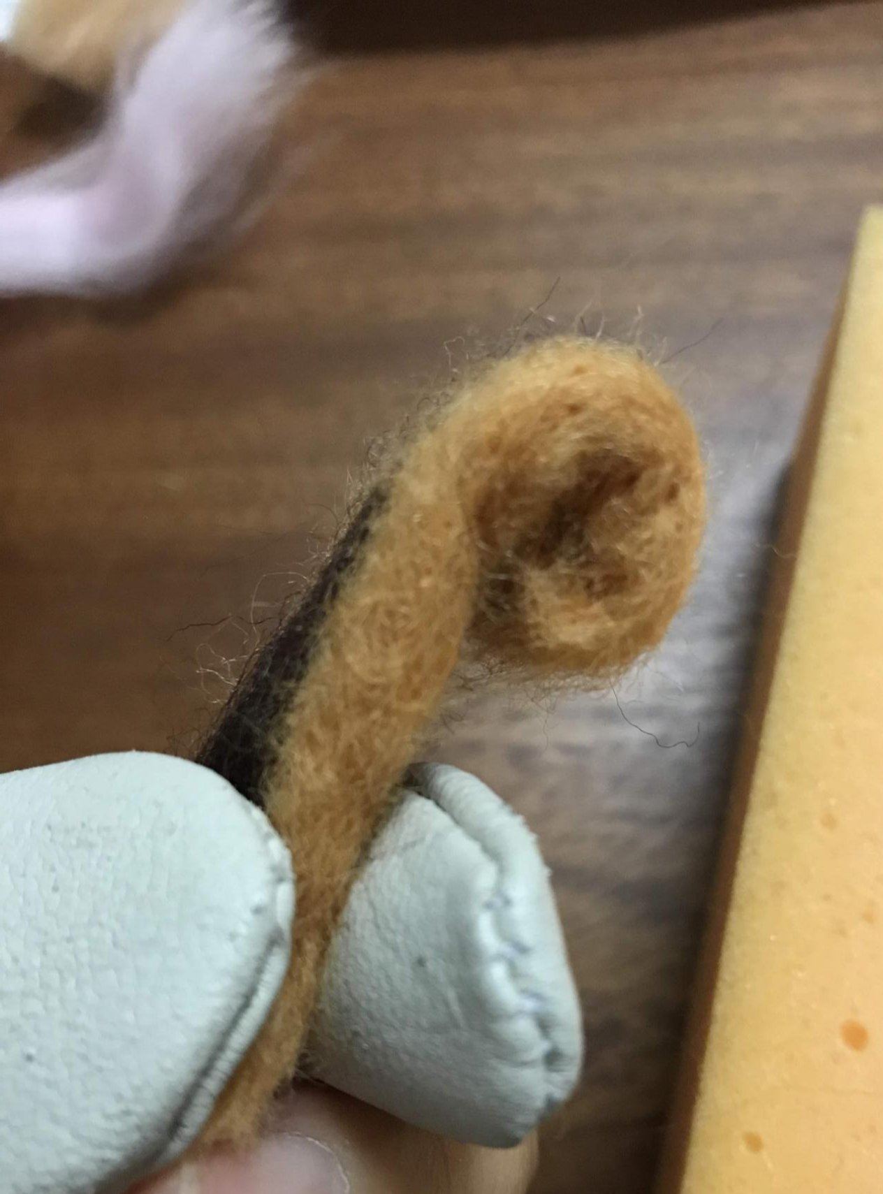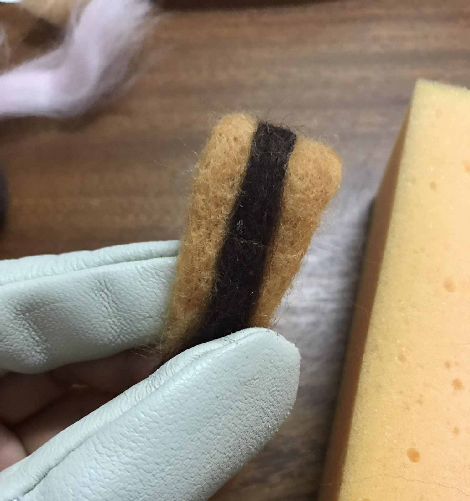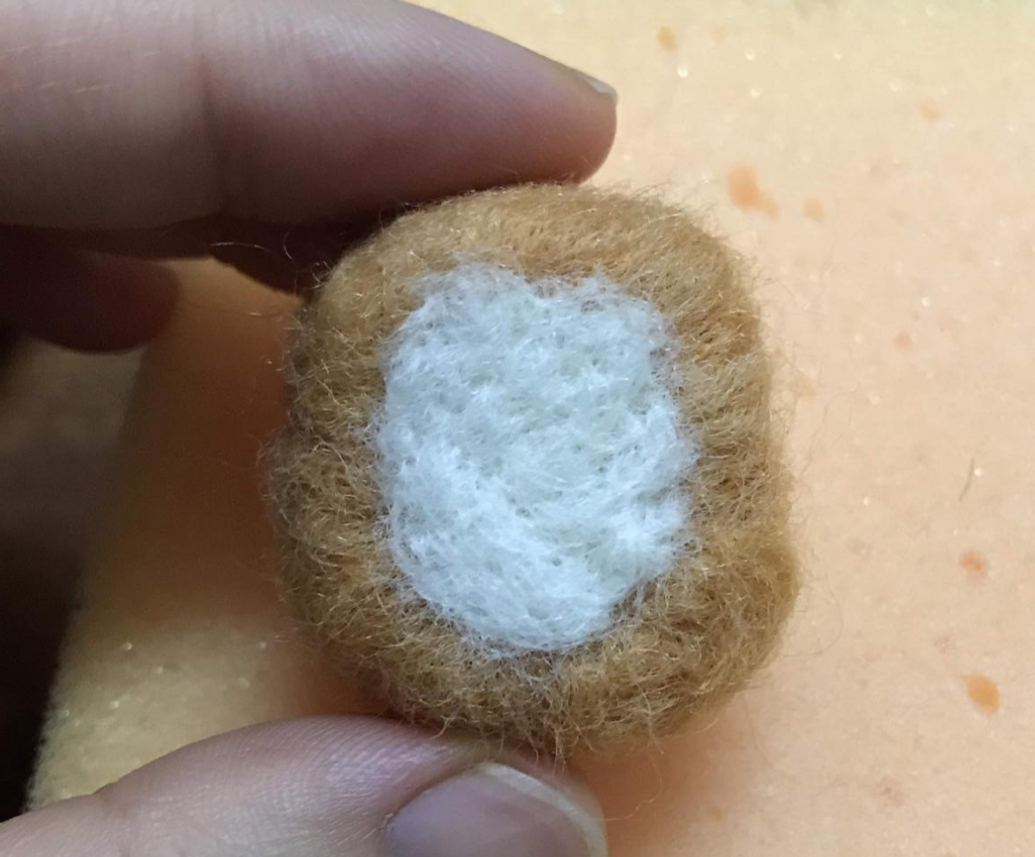 갈색 양모를 편편하게 만들고 흰색 양모를 덧대서 귀를 만들어 붙였다.