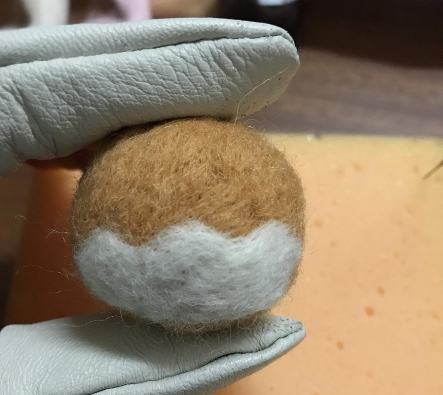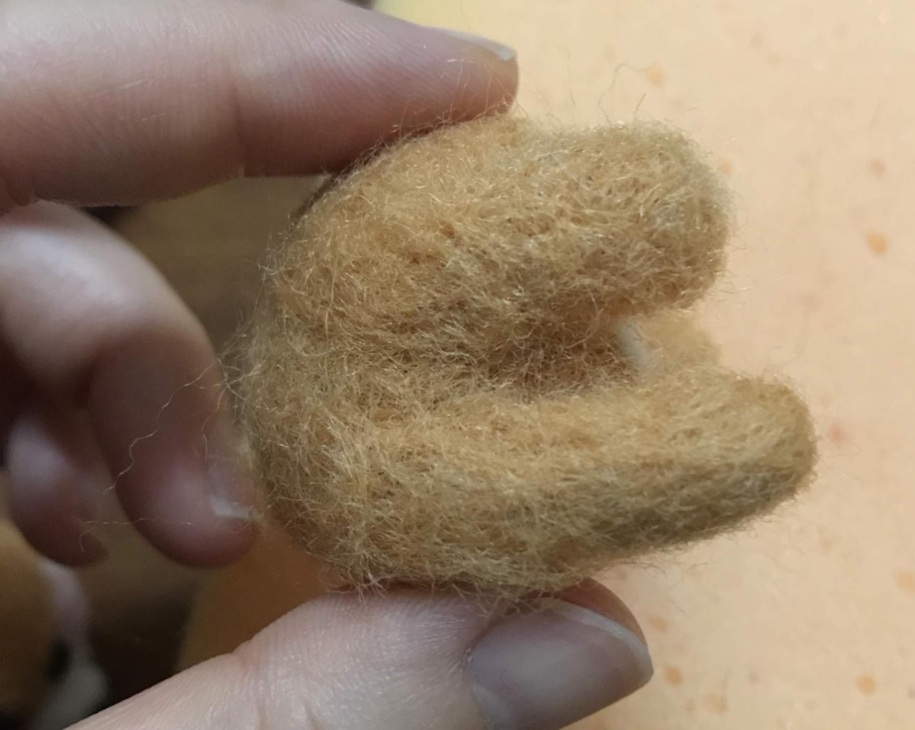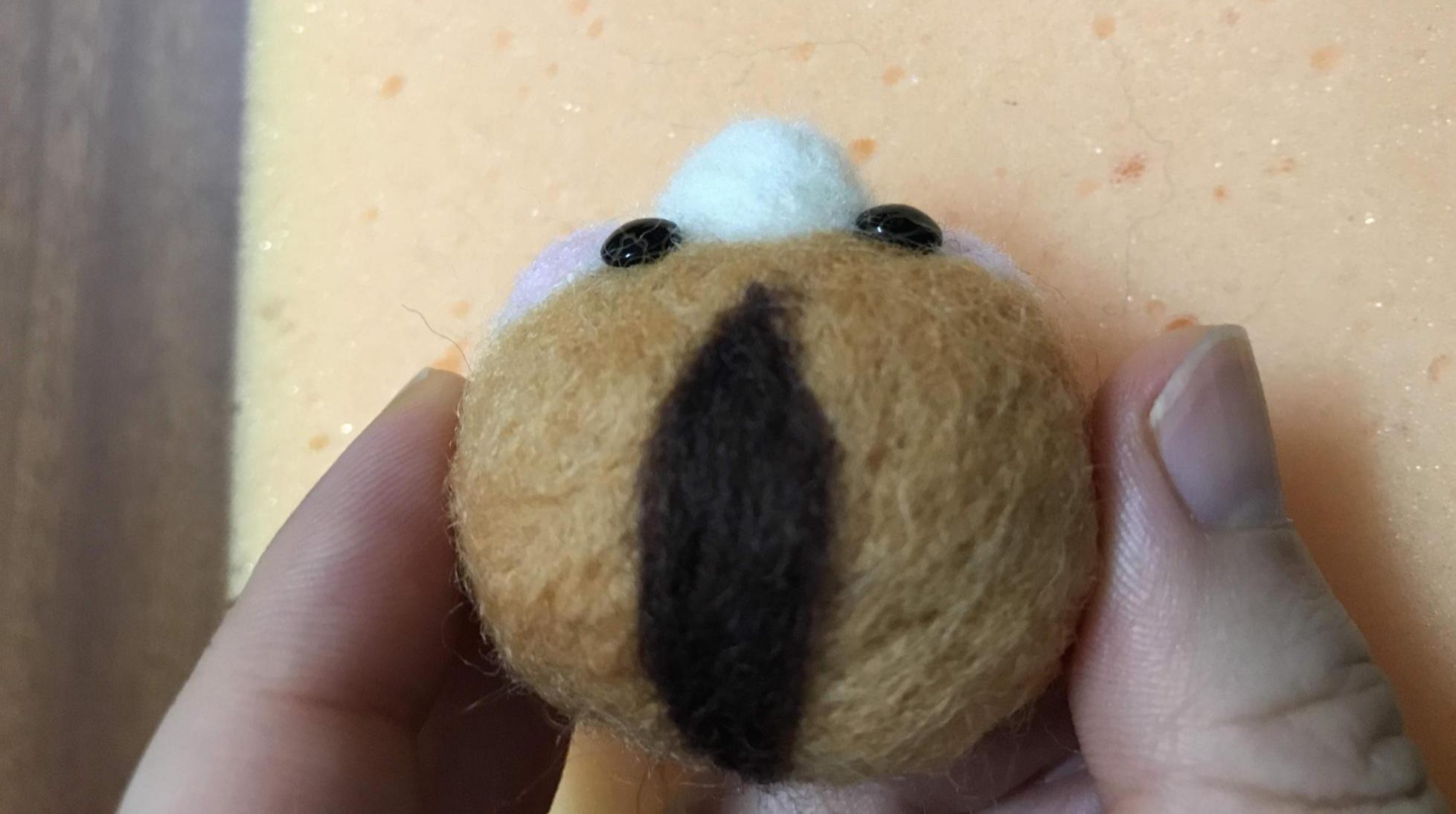 갈색 양모를 편편하게 만들고 흰색 양모를 덧대서 귀를 만들어 붙였다.