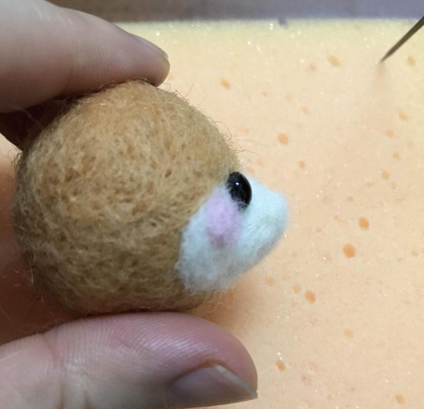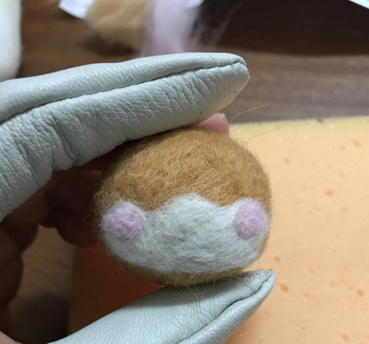 그다음 입과 뺨 부분이 될 곳에 하얀 양모를 덧씌운다.