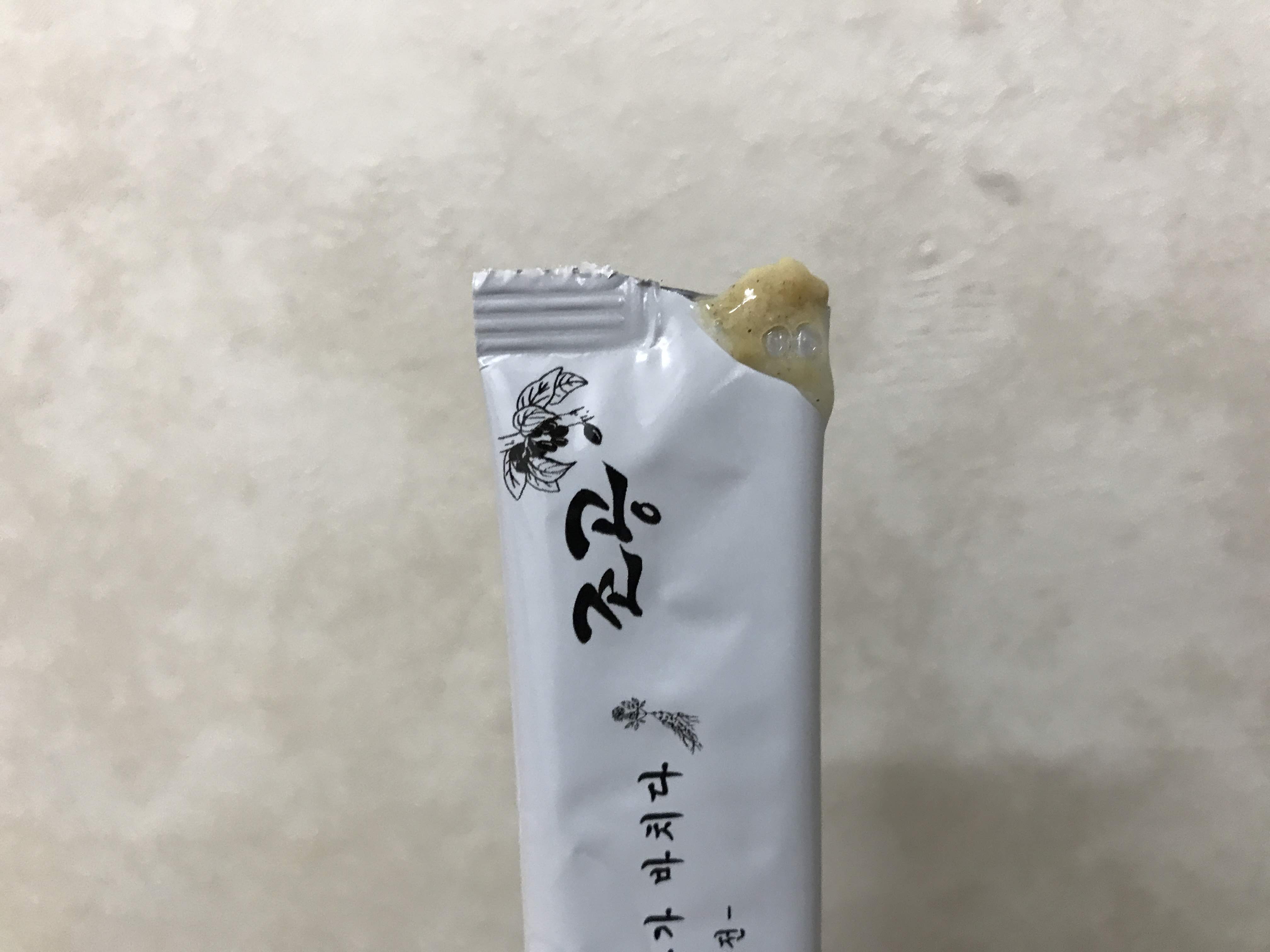 이것은 옐로우 대구인데 면역력에 좋은 스틱이다. 손가락으로 가려진 곳에 주재료가 써 있다. 주 재료는 대구, 단호박, 늙은 호박, 황태, 파인애플, 강황이다.