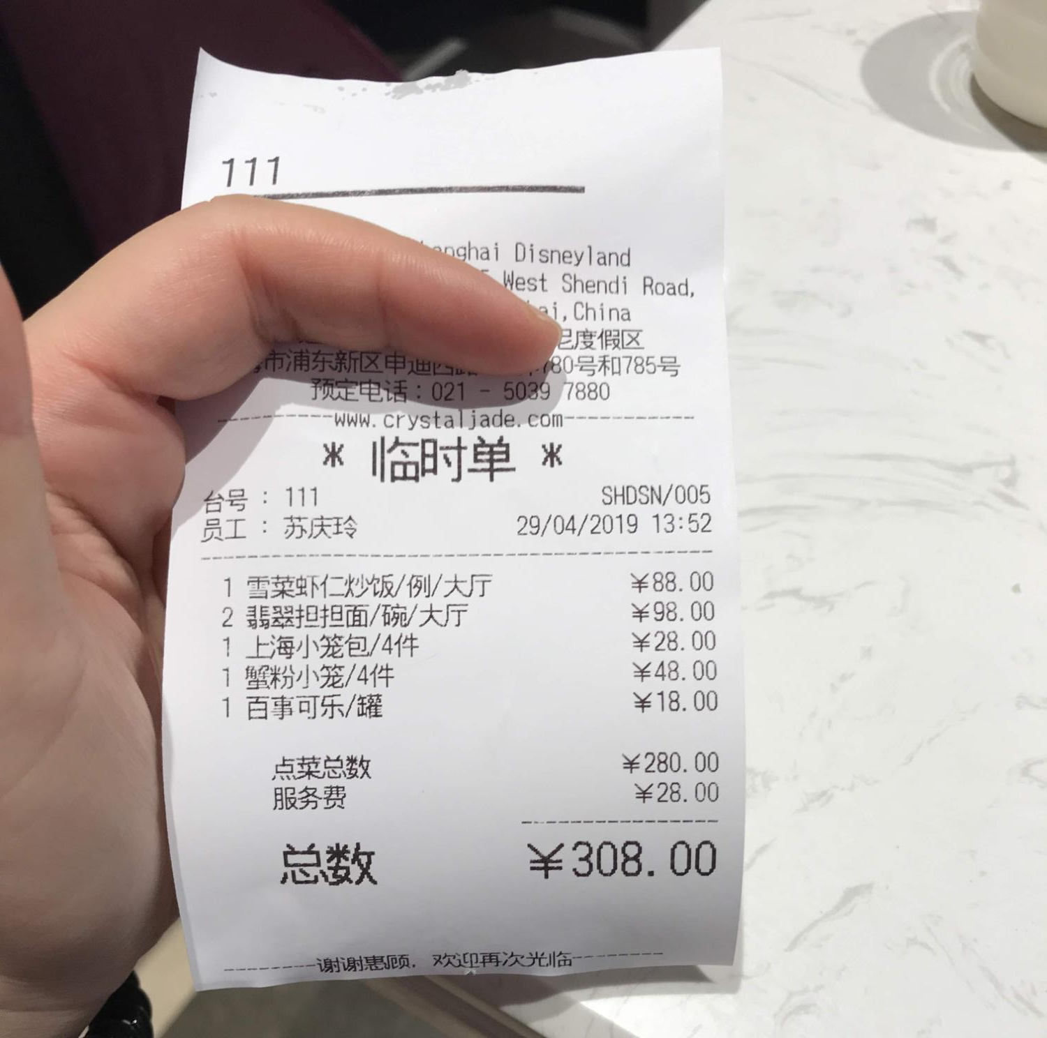 다 먹었더니 308위안이었다. 예상 가격보다 많이 나와서 보니까 팁이 10퍼센트 붙은 가격이었다.