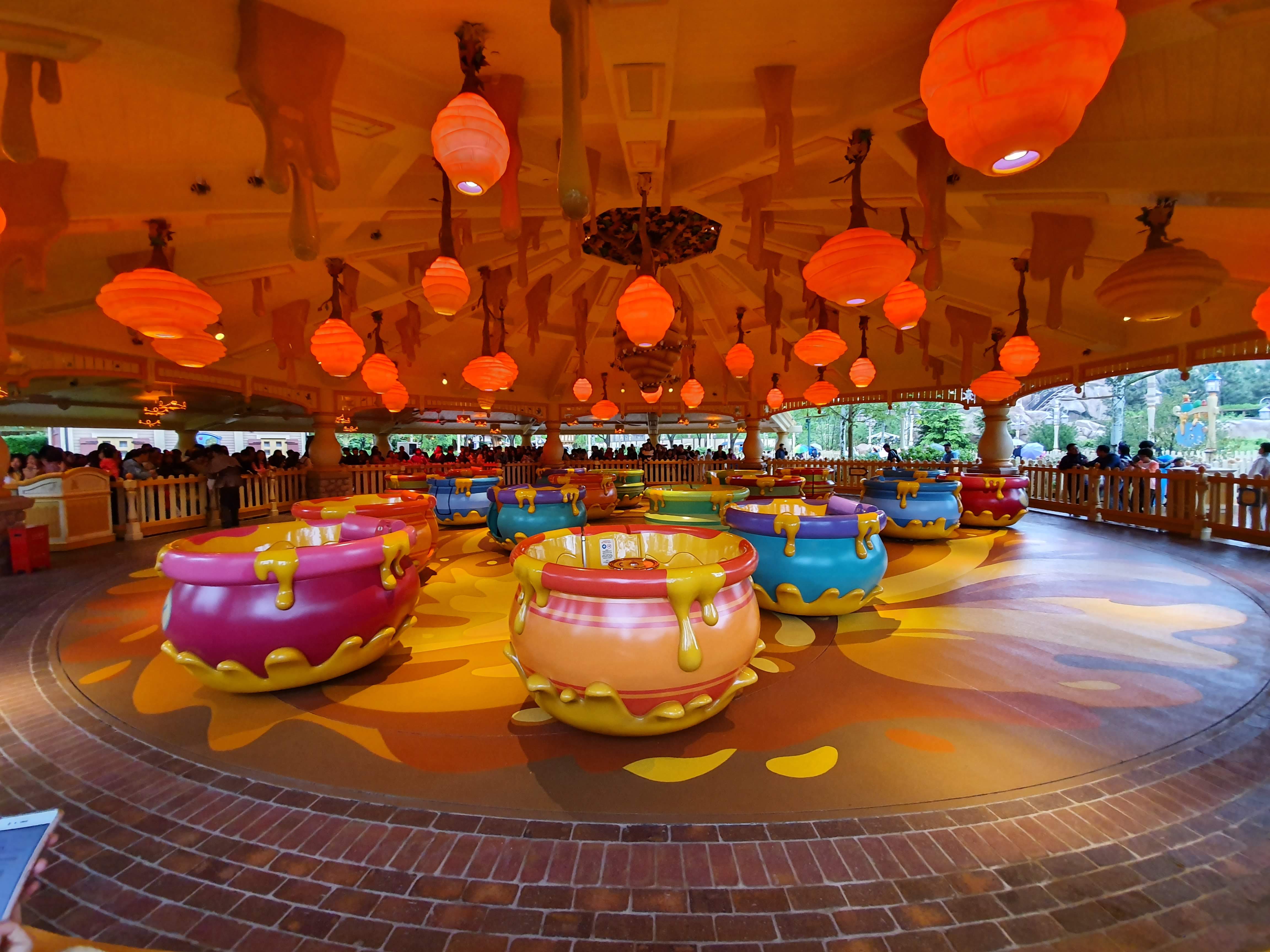열심히 걸어서 판타지랜드로 넘어갔고, 푸우의 꿀단지를 타는 놀이기구를 탔다. 가운데 핸들 같은 걸 돌려서 속도를 올릴 수 있었는데 미친 듯이 돌리게 되더라.