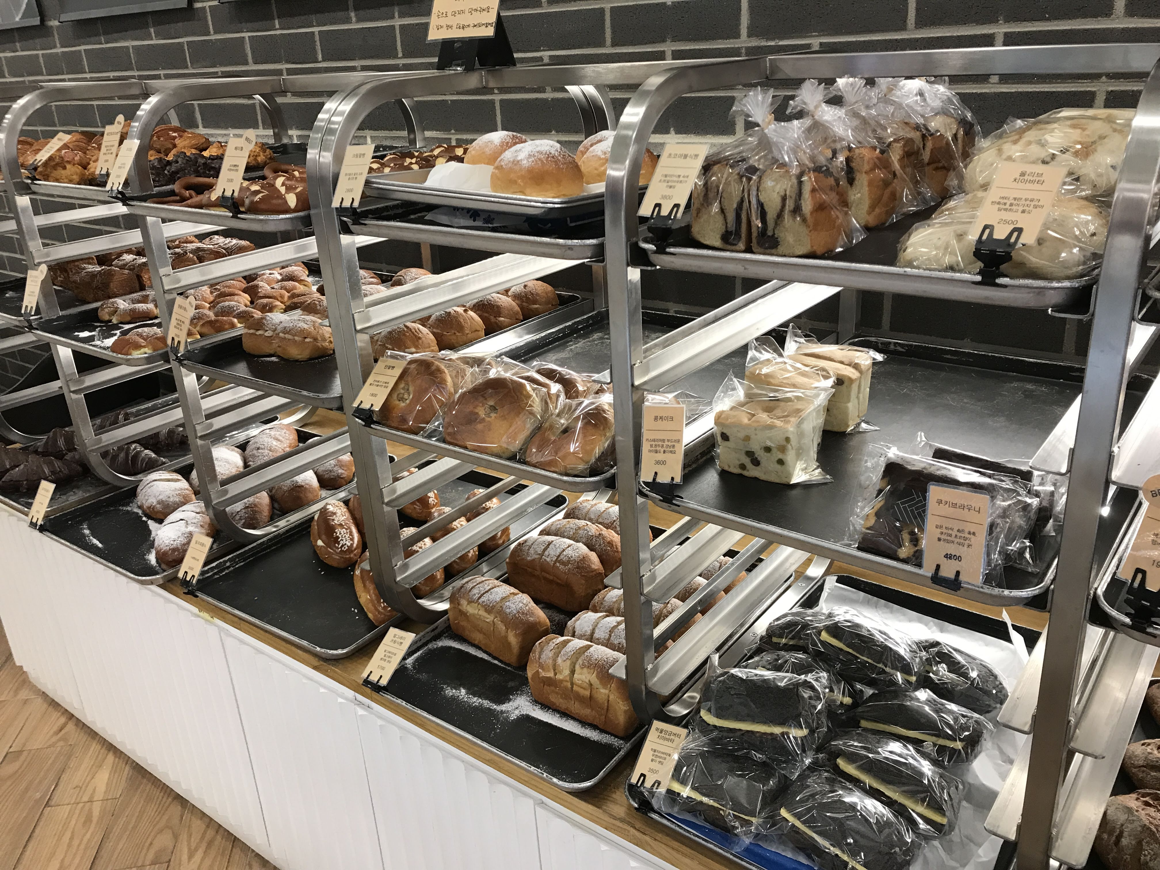 일단 들어가서 찍은 빵 진열대. 밝은 갈색을 띠는 빵도 맛있어 보이지만 개인적으로 진한 고동색을 띠는 빵들이 더 맛있어 보인다. 뭔가 더 짭짤하고 식감이 질기거나 투박한 빵을 좋아해서 그런 것 같다.