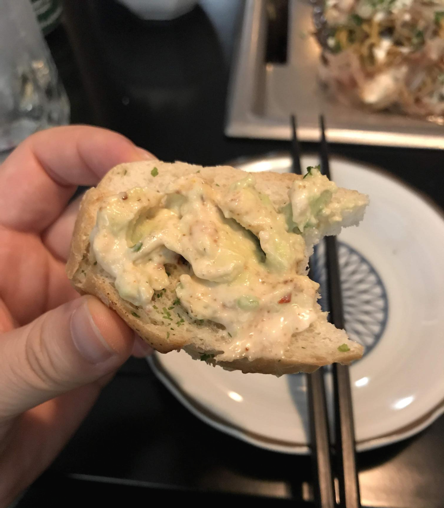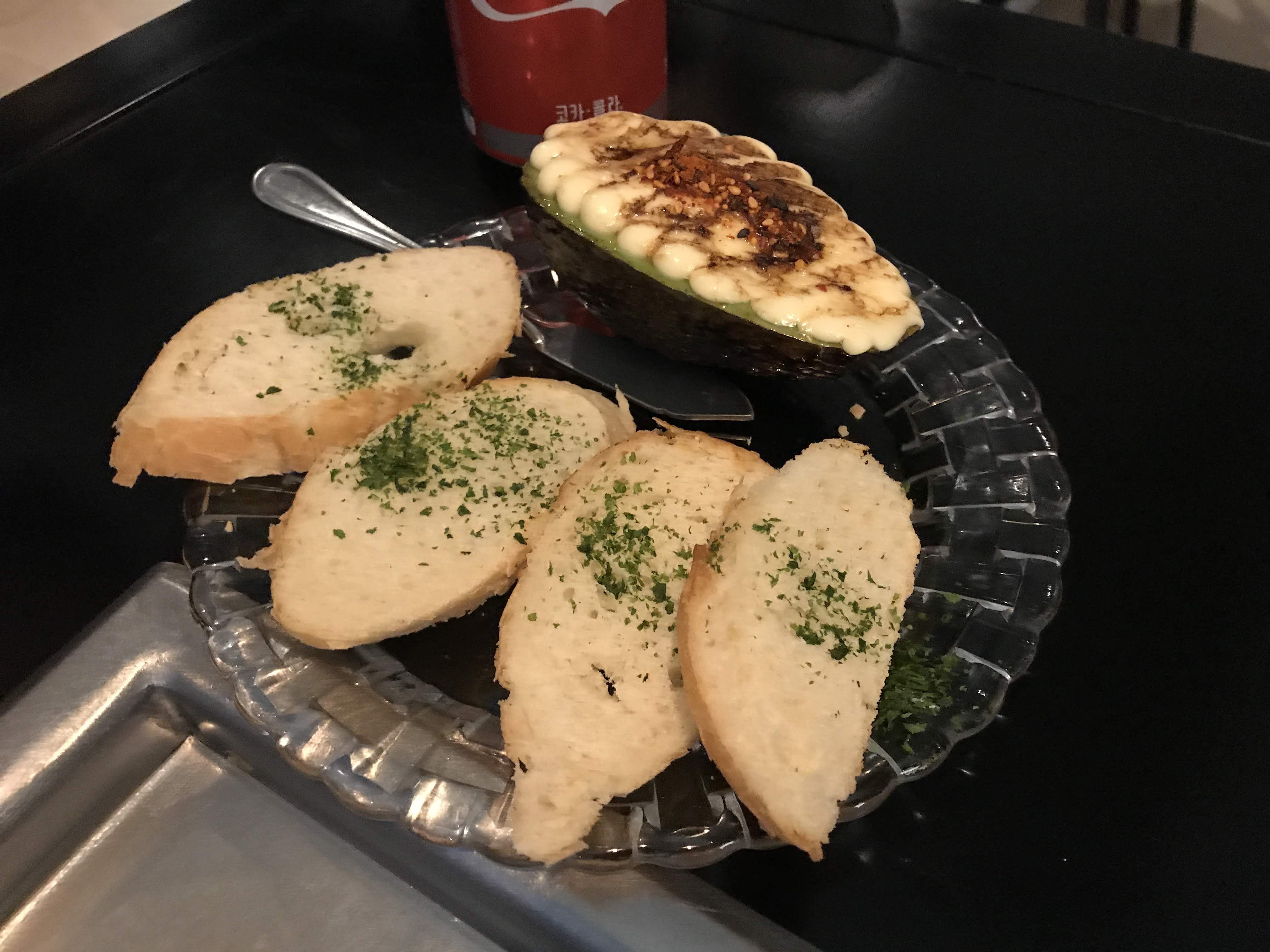 가장 먼저 아보카도멘타마요&바게트가 나왔다. 요런 비주얼이다. 3개라고 써 있었지만 4조각이다. 아보카도 안에 명란이 들어 있고 아보카도와 명란을 슥슥 비벼서 빵 위에 올려 먹으면 된다.