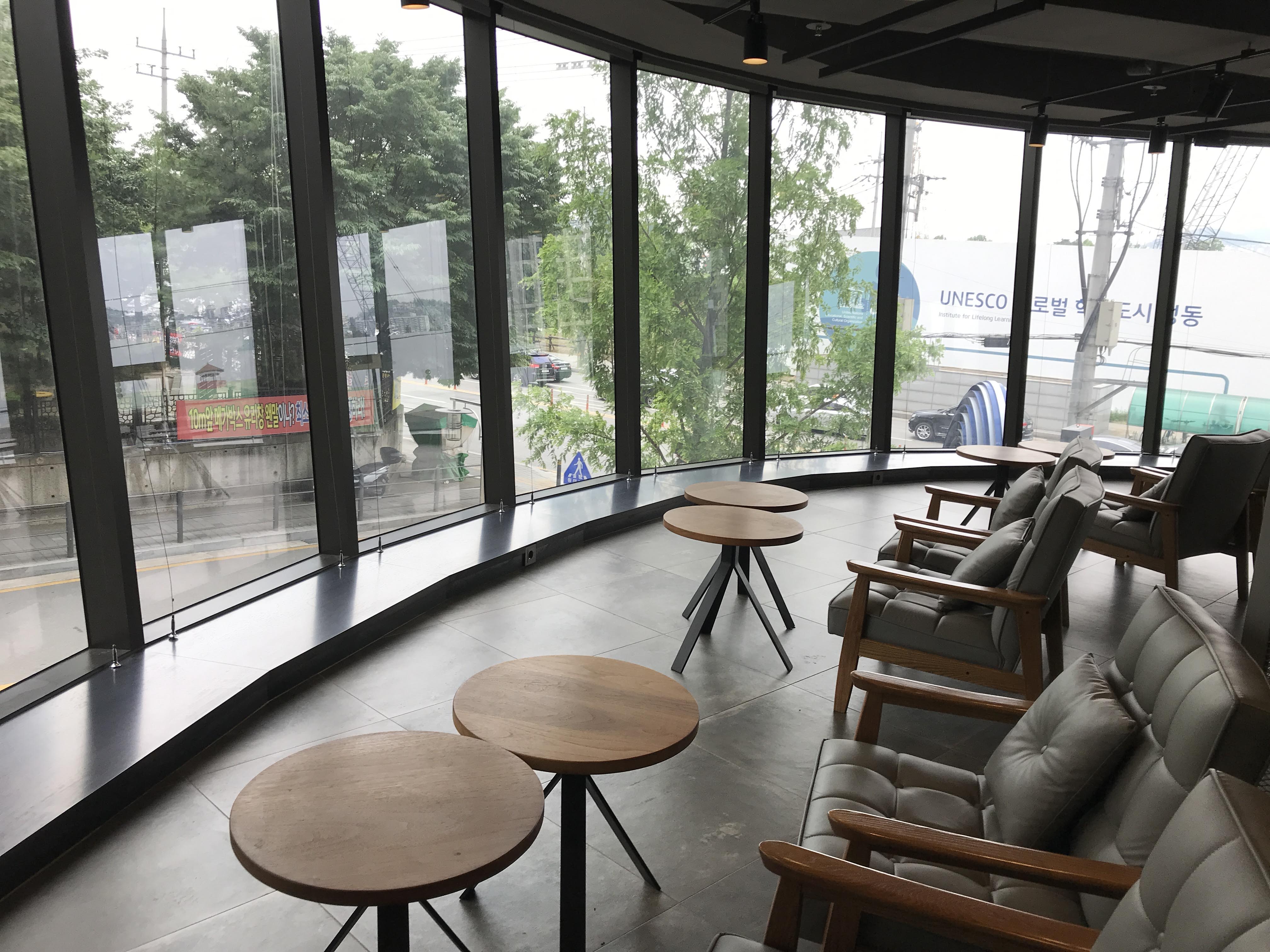 2층은 이런 느낌. 여기도 통유리고 창쪽으로 의자가 있는 자리도 많아서 바깥 풍경을 즐길 수 있다.