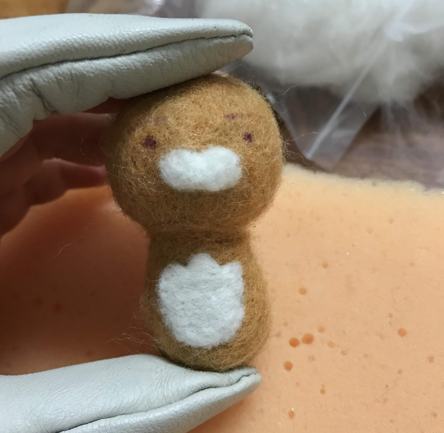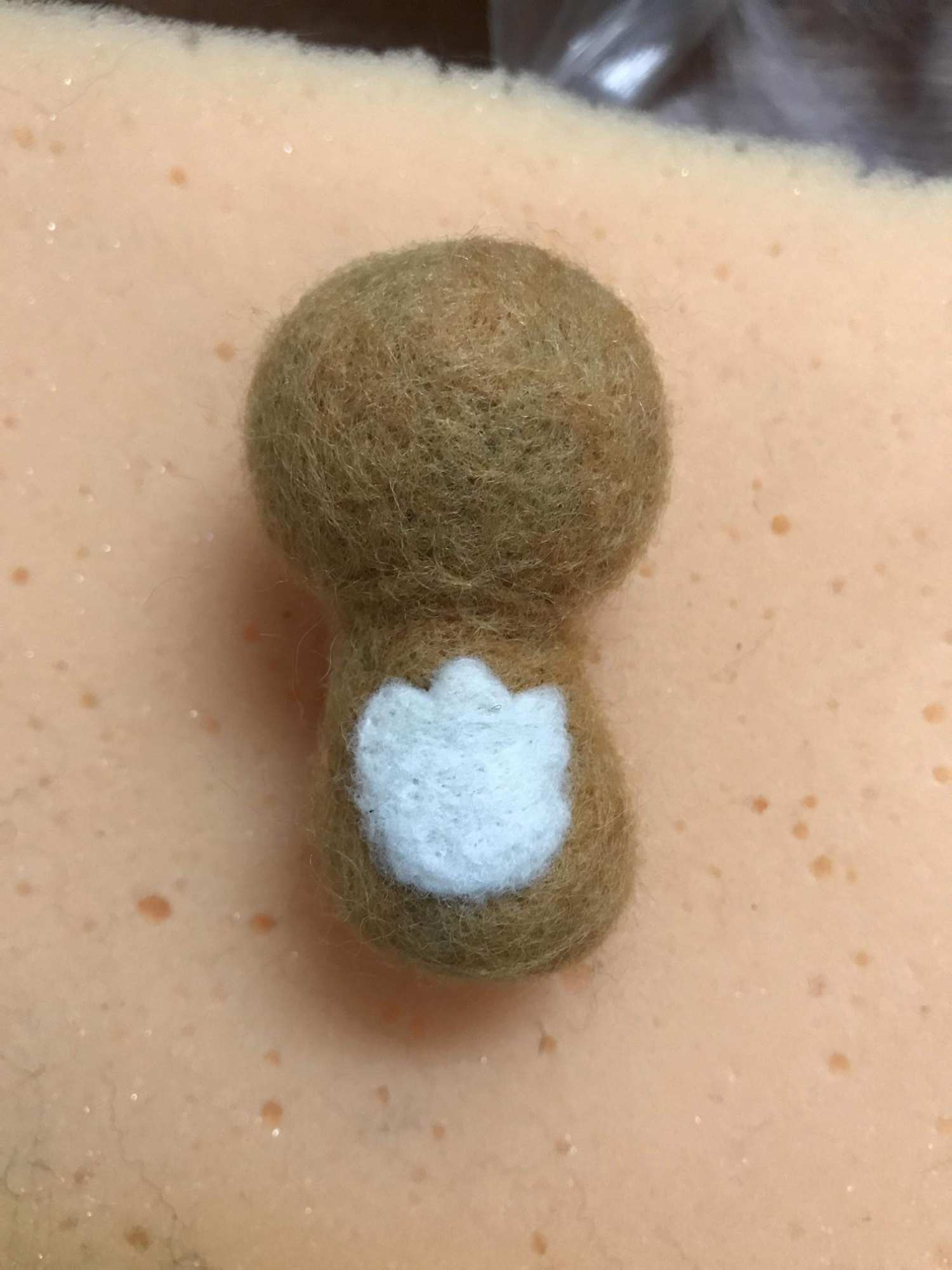 베이스울 머리통과 몸통에 각각 밝은 갈색 양모를 씌우는데, 몸통 쪽에는 머리통과 합칠 때를 위해 양모를 부숭부숭하게 남겨 두자.