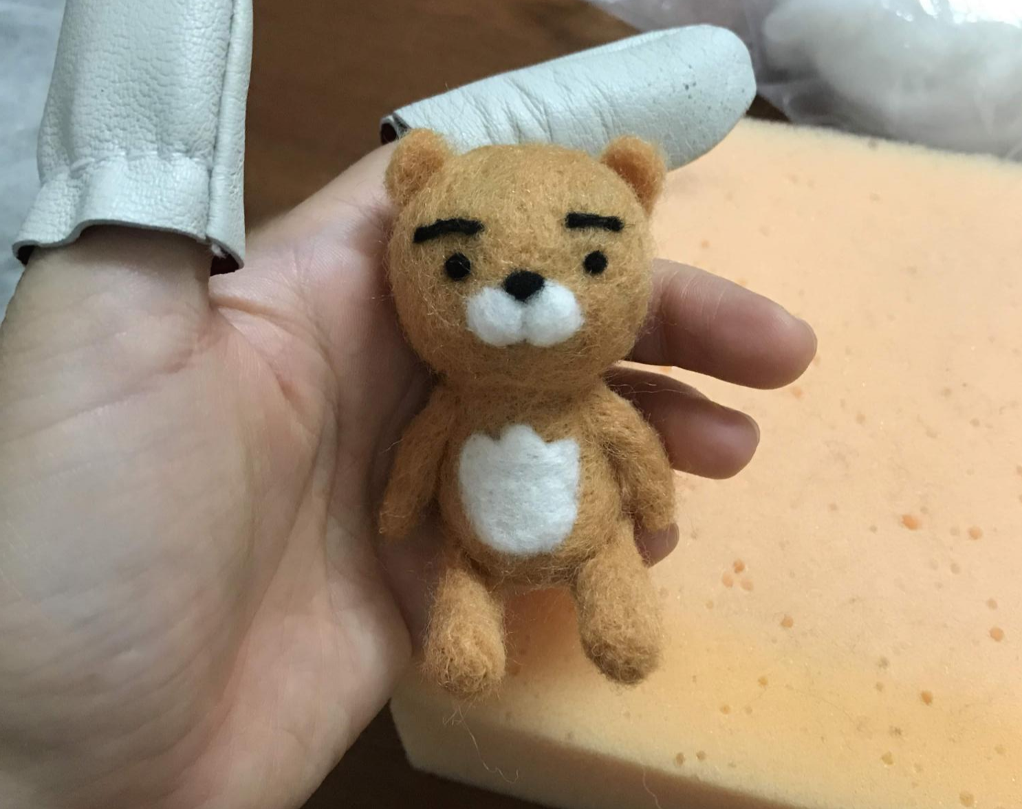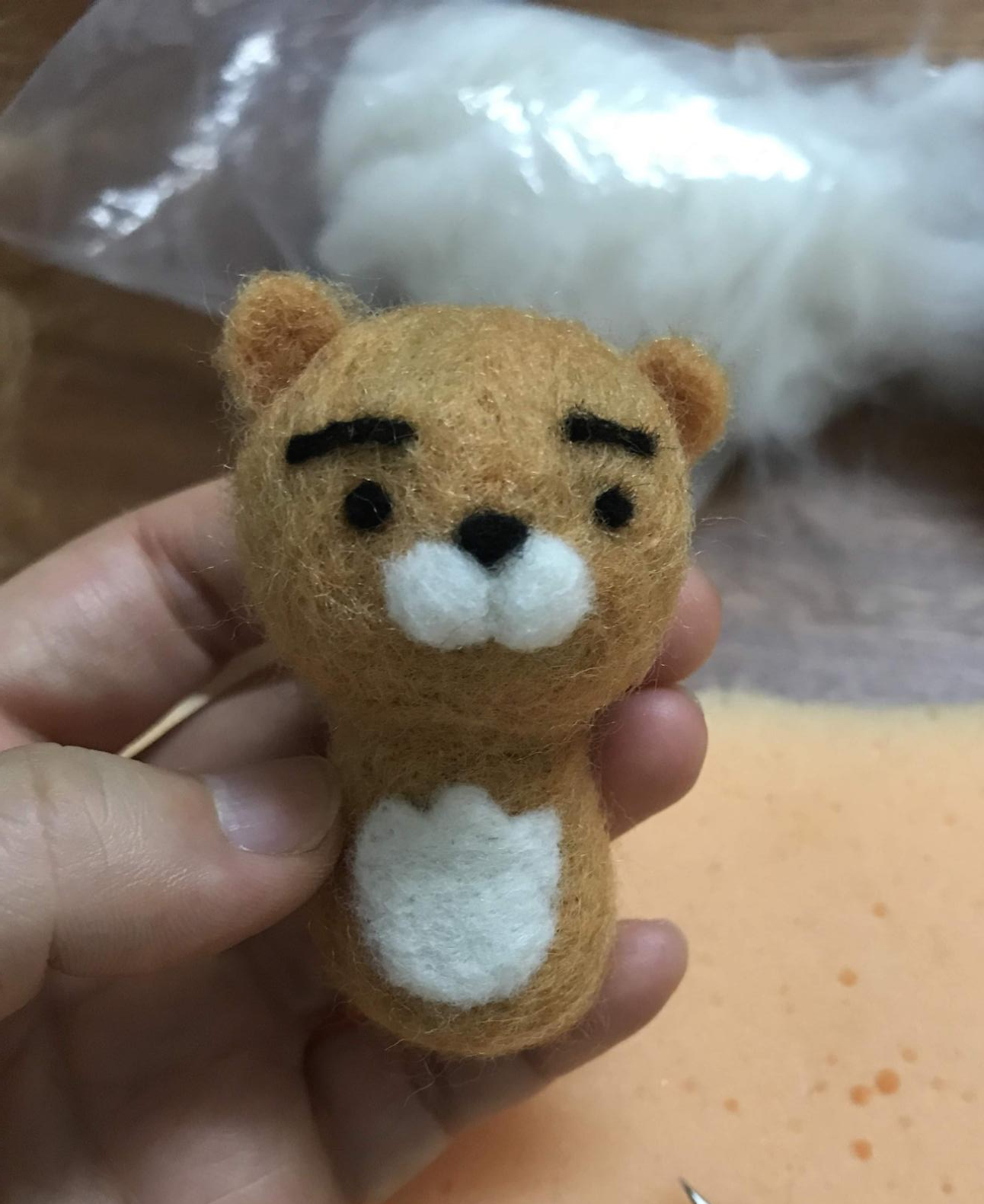 그다음 흰색 양모로 라이언 배에 들어갈 튤립무늬를 만든다. 튤립무늬는 흰색 양모를 얇게 펴서 열심히 찌르면서 뾰족뾰족 들어가고 나온 부분은 바늘로 인내심을 갖고 찔러준다. 들어가야 할 부분을 찔러주면서 다듬다 보면 된다.