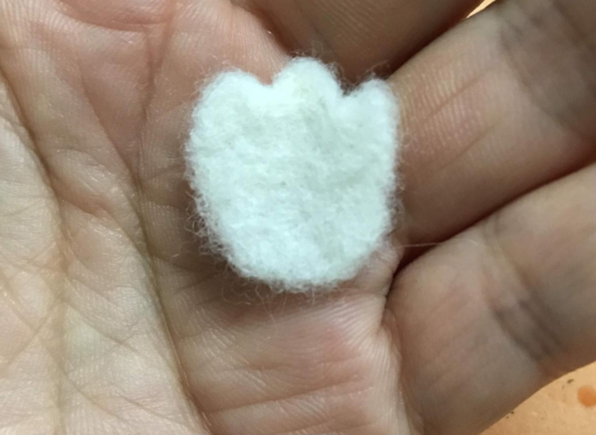기화성펜으로 눈코입 자리를 본 뒤 흰색 양모를 아주 작은 조랭이떡 모양으로 만들어서 붙인다.