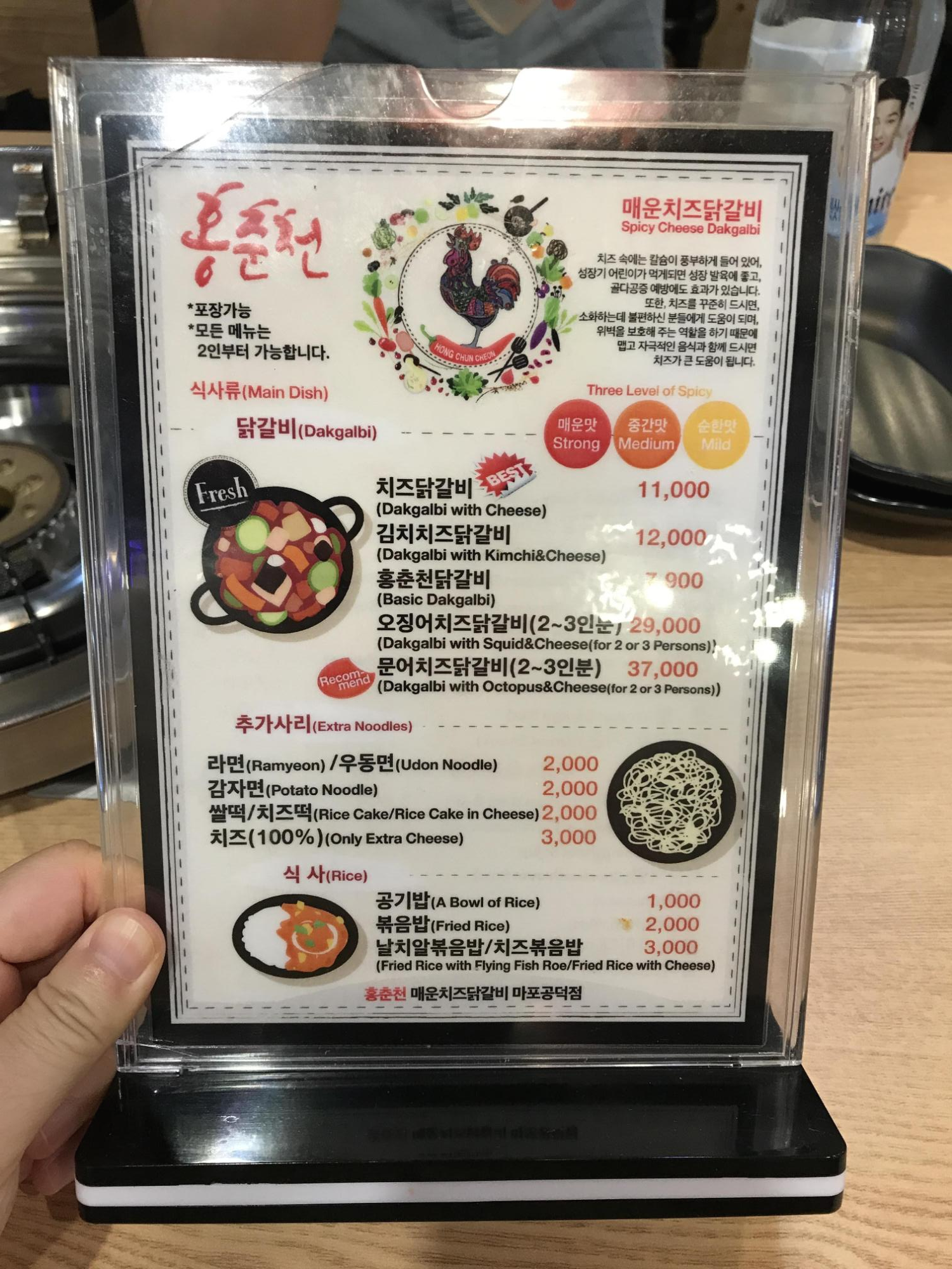 꽤 다양한 메뉴가 있다. 가장 기본인 홍춘천 닭갈비(7900원)에 치즈 사리와 우동 사리를 추가했다.