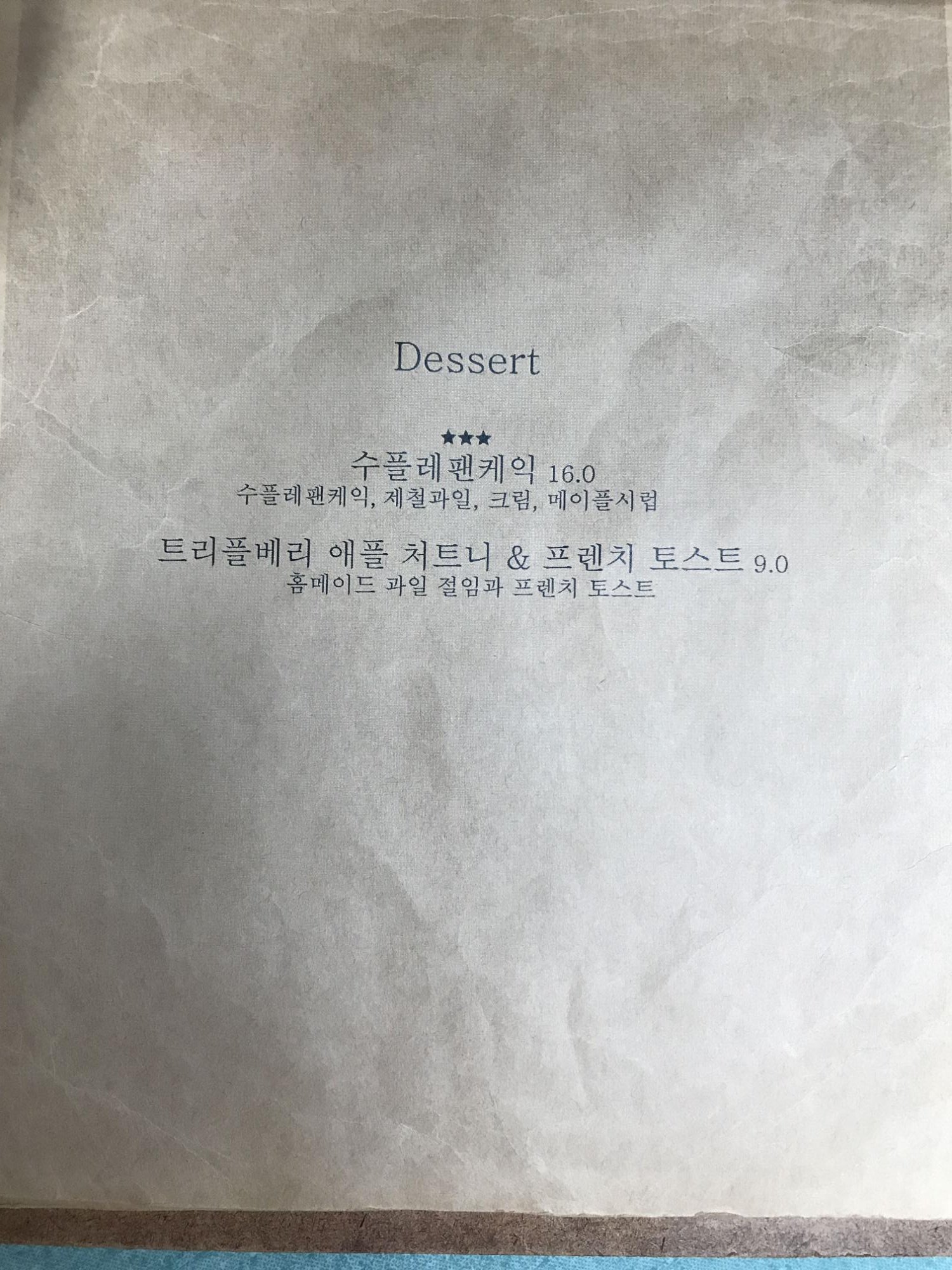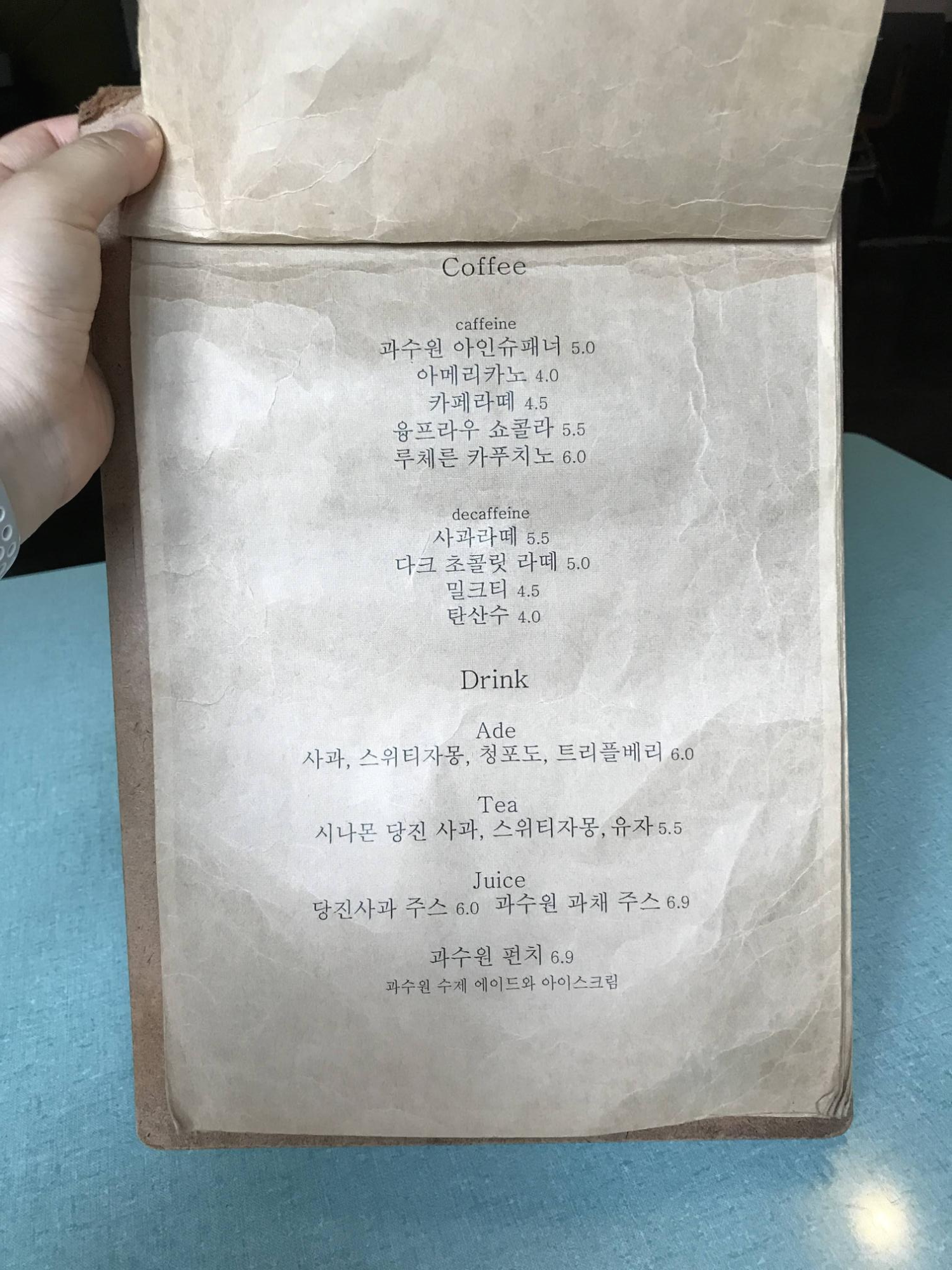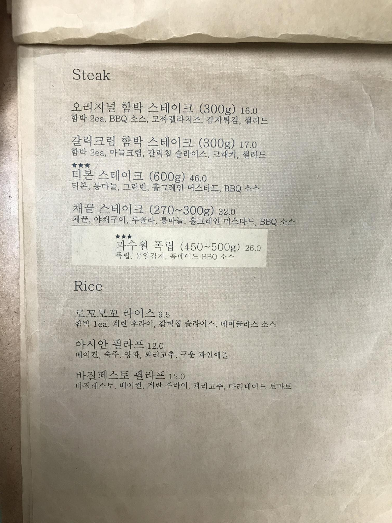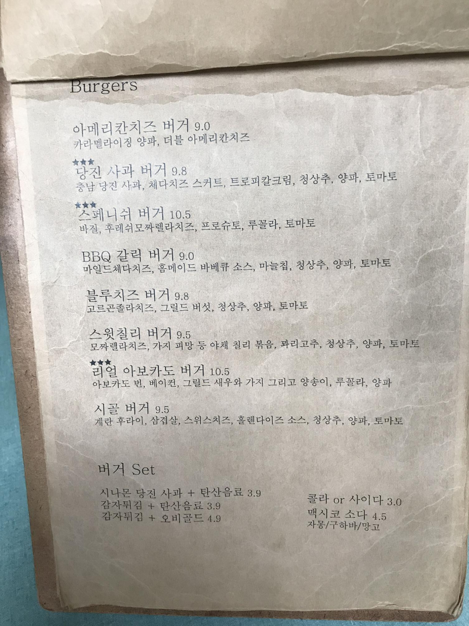 메뉴가 생각보다 무척 다양했다. 수제버거뿐만 아니라, 수플레, 독일식 족발인 학센, 스테이크 등 맛있어 보이는 게 많았다. 하지만 여기 오기 전부터 먹을 메뉴는 이미 마음속에서 정해 뒀다. 바로 당진 사과 버거(9800원)! 3900원을 추가하면 탄산음료와 시나몬 당진 사과 또는 감자튀김을 함께 먹을 수 있다. 감자튀김 시키려다가 친구가 감자튀김을 주문한다길래, 나는 시나몬 당진 사과를 골랐다. 시나몬 당진 사과는 썰은 사과를 시나몬에 절여 구운 것이라고 했다. 다른 친구는 스페니쉬 버거와 감자튀김+탄산음료 세트를 시켰다.