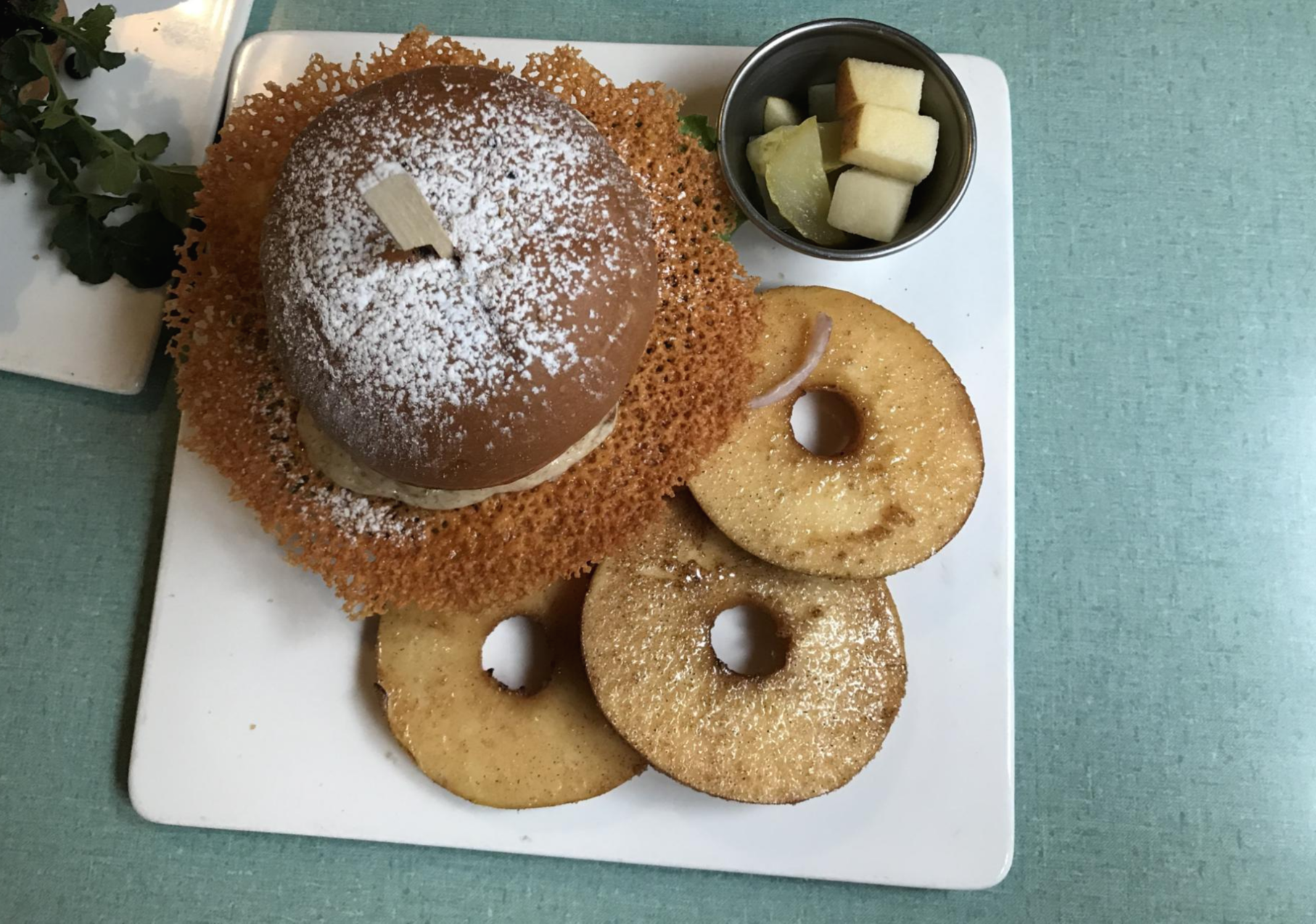 약간의 기다림 끝에 나온 당진 사과버거. 생김새가 정말 훌륭하다. 버거에 보이는 갈색 둥그런 것은 치즈 구운 것이다. 풍미가 좋았다. 그리고 동그라미 세 개 늘어선 게 시나몬 당진 사과다.