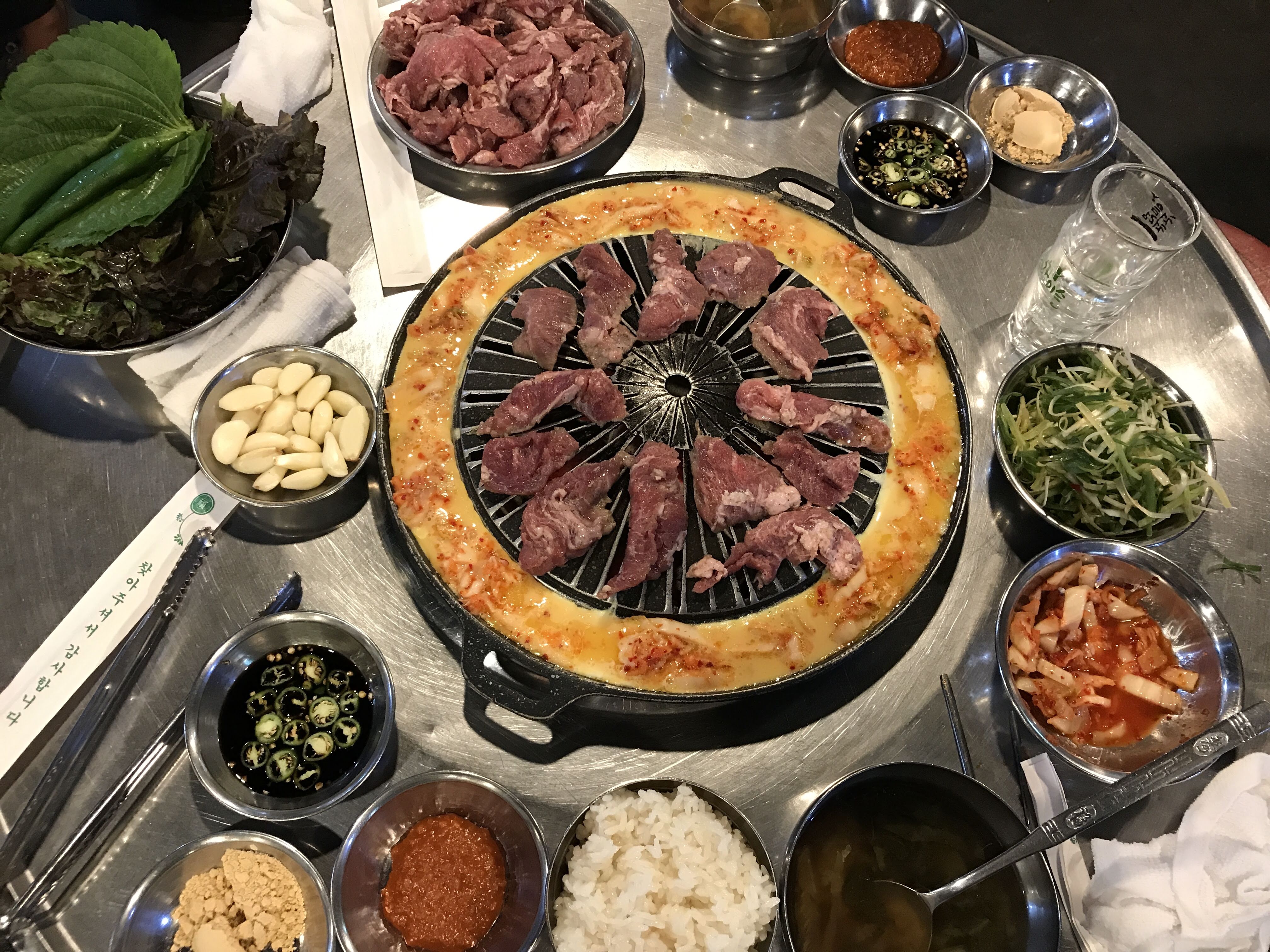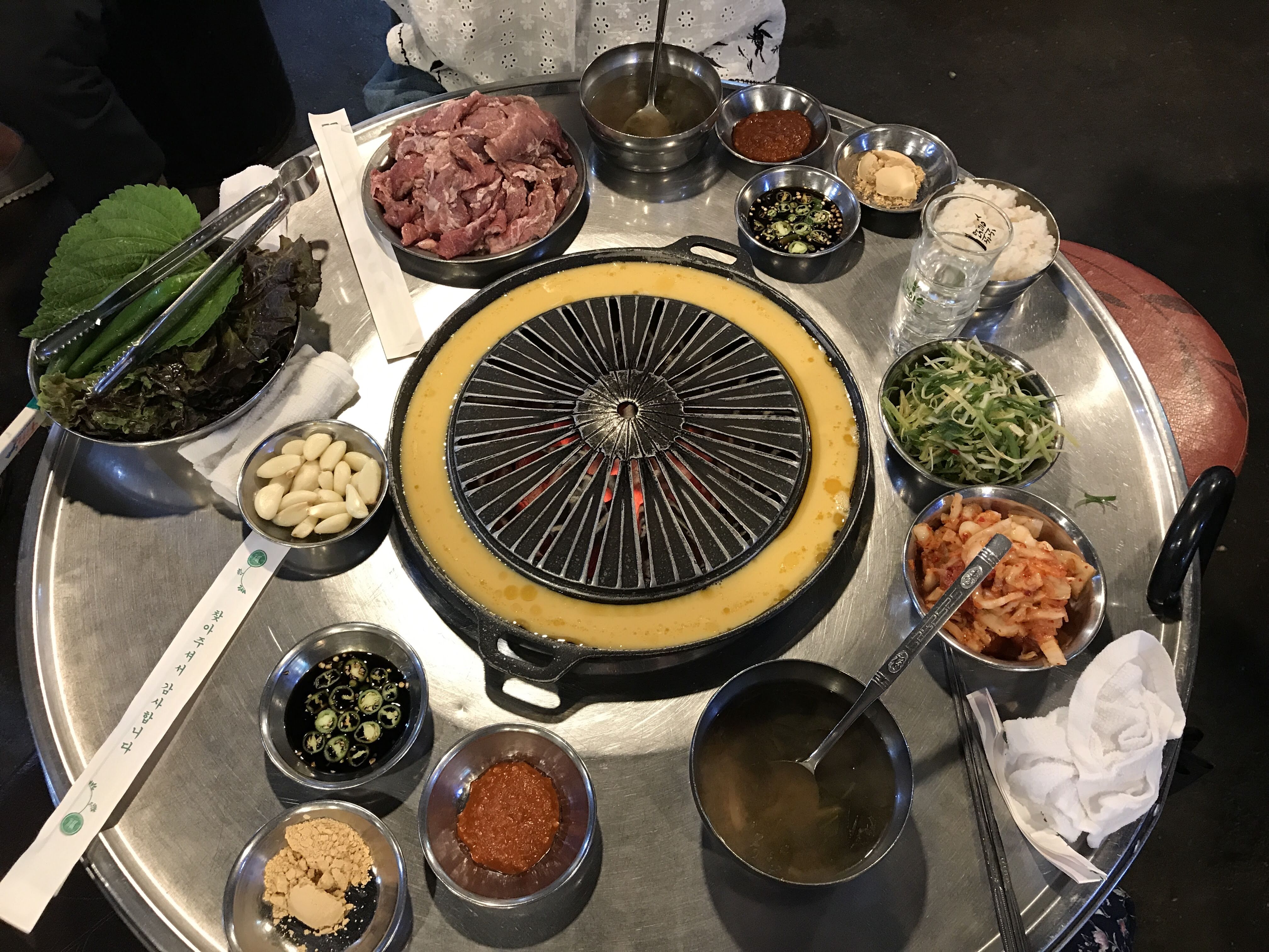 여기도 달걀물을 고기판 둘레에 부어 줘서 달걀 부침을 만들어 먹을 수 있다. 이게 갈매기살 먹을 때 은근 별미다. (사진에 보이는 노란 부분이 달걀물이다.)