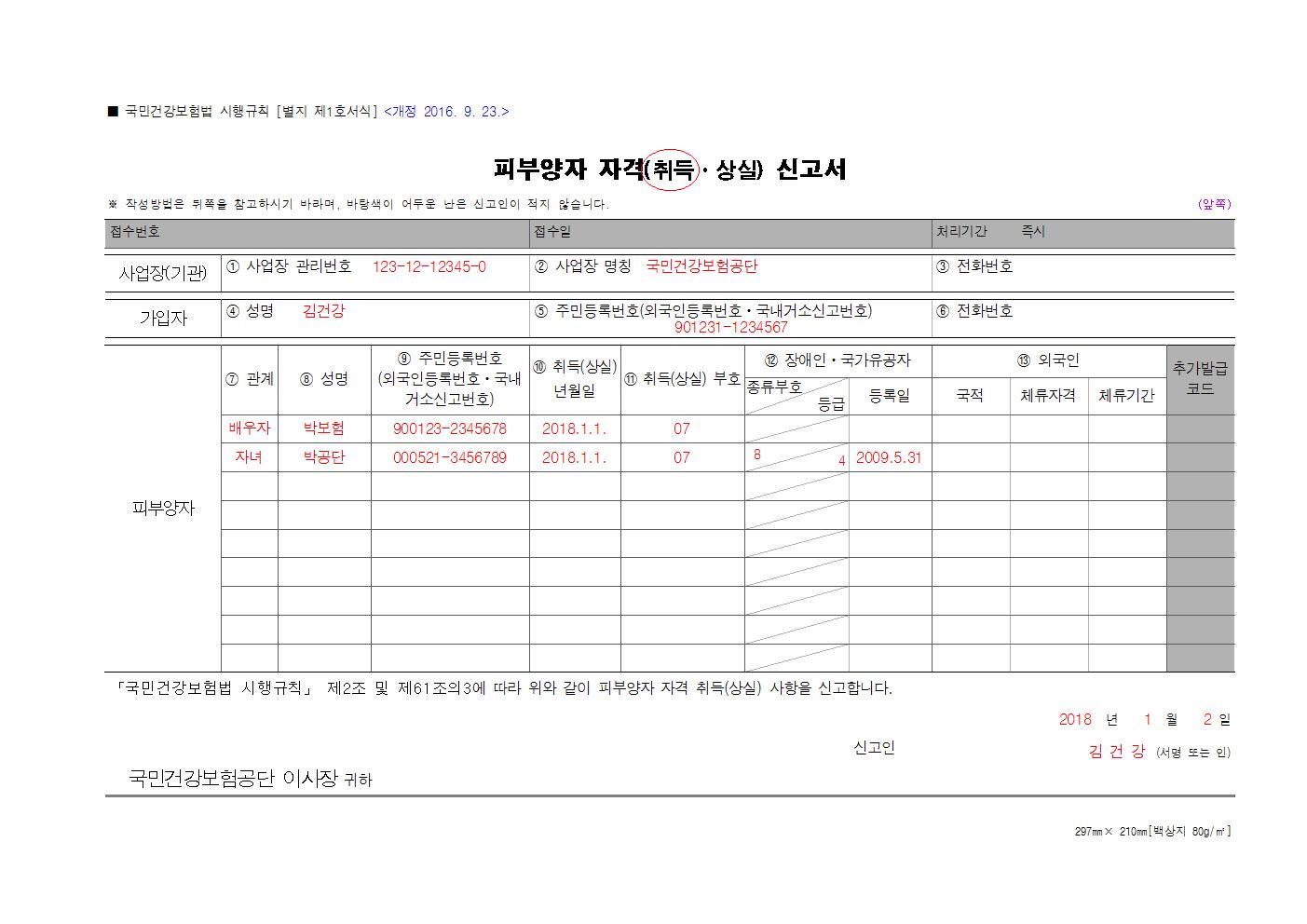 피부양자 등록란에 등록할 가족의 정보를 적으면 된다. 7 관계란에 형제면 형제, 자녀라면 자녀 부모라면 부모 등의 관계를 적고 8 성명에는 피부양자의 이름을 적는다. 9 주민등록번호에는 피부양자의 주민등록번호를 쓴다. 10 취득(상실) 년월일은 이 서류를 제출하는 날짜를 적는다. 11 취득상실 부호는 비워 두면 되고 12번이나 13버은 해당이 있다면 적는다. 그리고 밑에 날짜와 서명을 적고 미리 안내 받았던 팩스로 보낸다. 그 뒤 다시 고객센터에 전화해서 팩스를 보냈다고 알려 주자. 아, 알려 주기 전에 내가 보낸 팩스의 번호를 알아 두고 전화하자. 내가 보낸 팩스기의 번호를 알아야 서류 조회를 쉽게 해서 일이 빠르게 진행된다. 고객센터에 전화해서 팩스가 잘 도착했는지 확인하고 나면 보통 하루 안에 피부양자 등록이 완료되고 새 건강보험증이 발급된다.