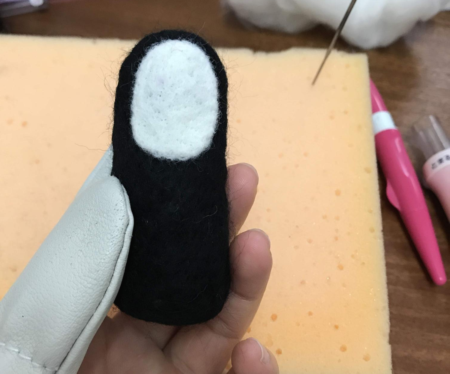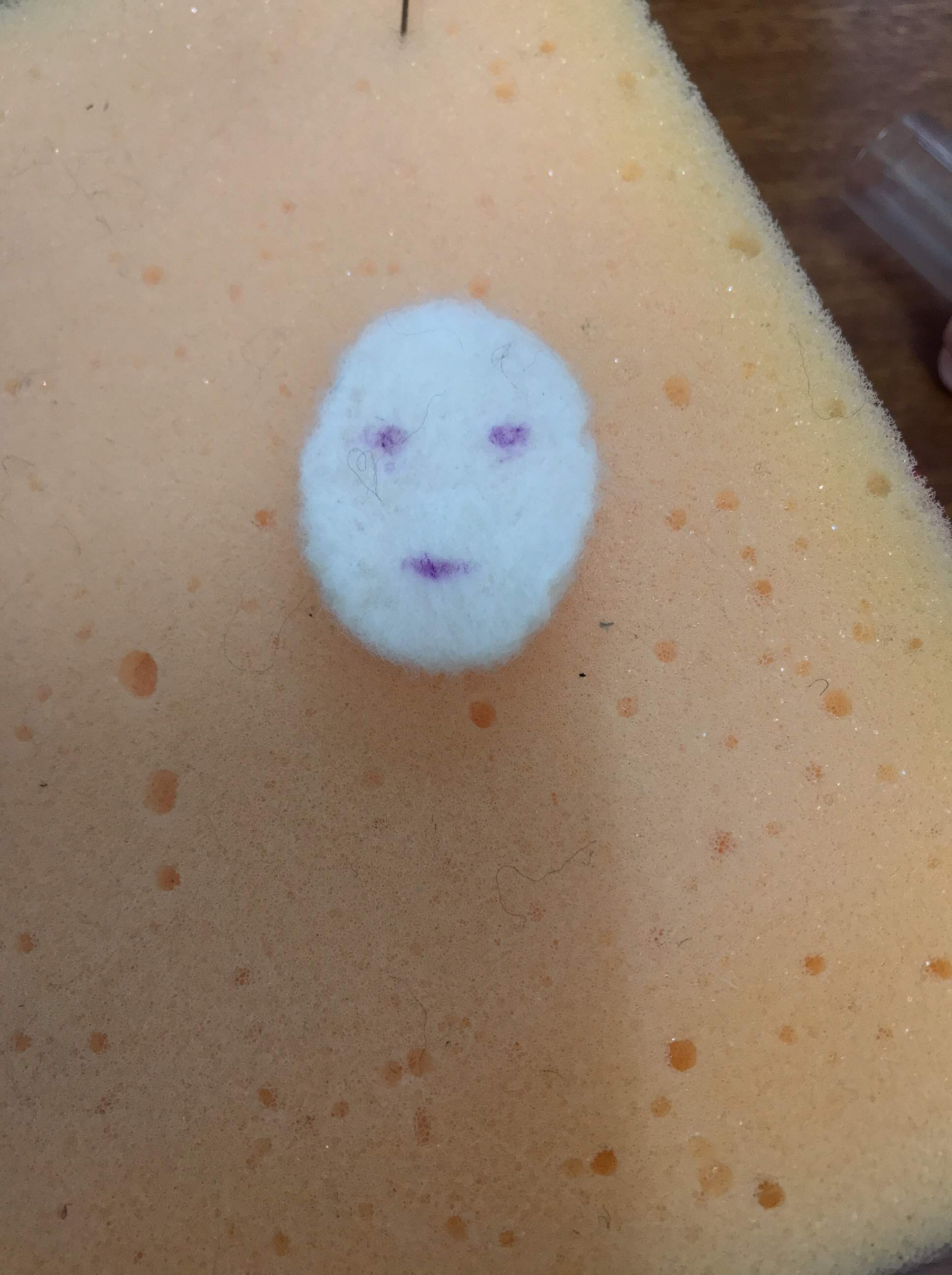 이제 얼굴을 만들 차례다. 하얀색 양모를 적당량 뜯은 다음 마음에 타원형으로 주섬주섬 만들어 놓고 열심히 찔러서 평평하게 만든다. 적당히 펴졌다 싶다면 기화성 펜으로 눈과 입을 대충 그린다.