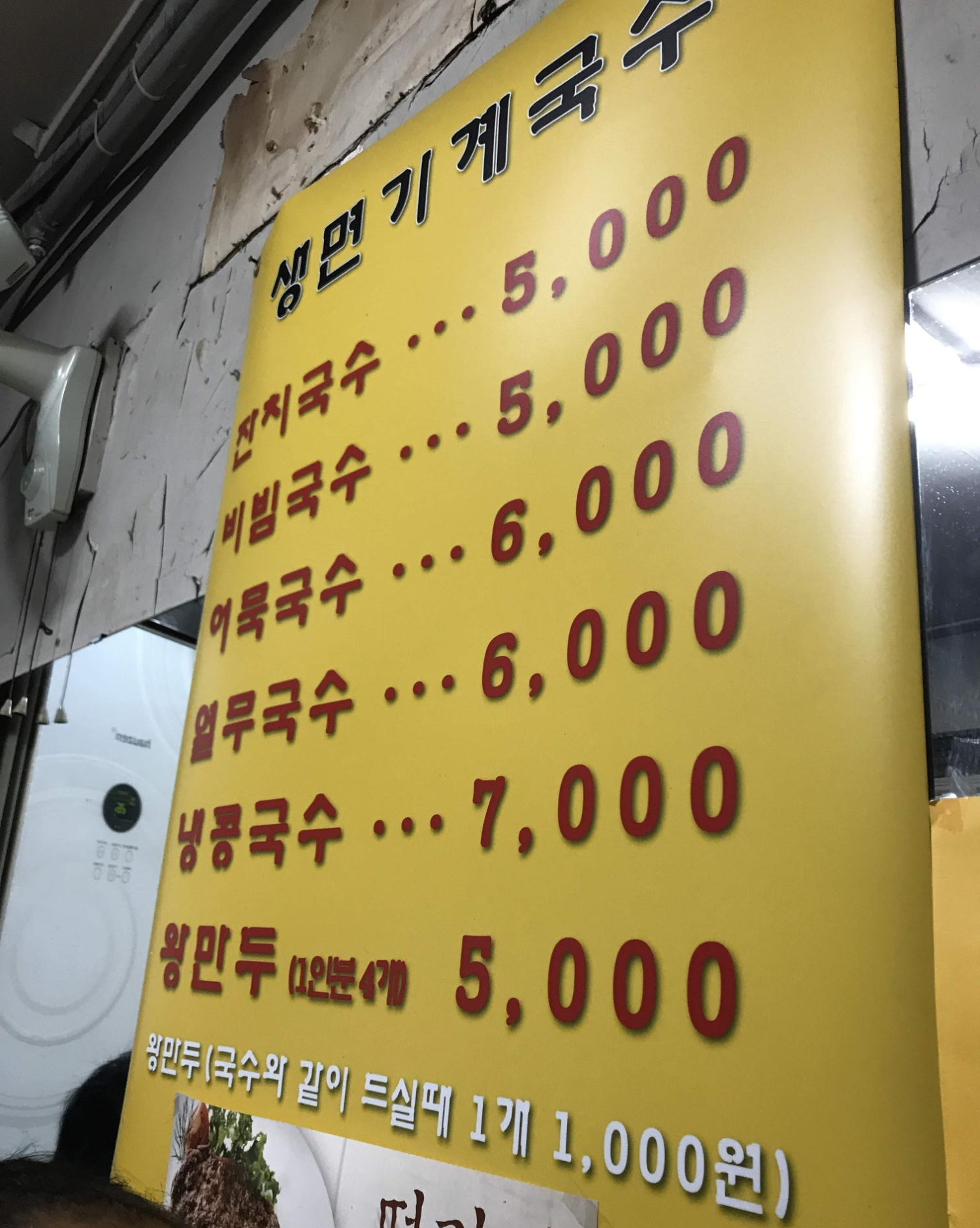 메뉴는 국수 위주의 메뉴이고 만두를 판다. 주의할 점은, 만두를 개별 메뉴로 시키는 것보다 국수를 시키고 만두 한 알을 시키는 게 훨씬 효율적이다. 그냥 만두만 한 접시 시키면 4개에 5천원인데, 국수를 시키고 만두 한 알만 추가하면 만두 한 알에 1천원이다. 따로 밥을 주거나 하진 않기 때문에 만두를 추가해서 먹으면 좋다.