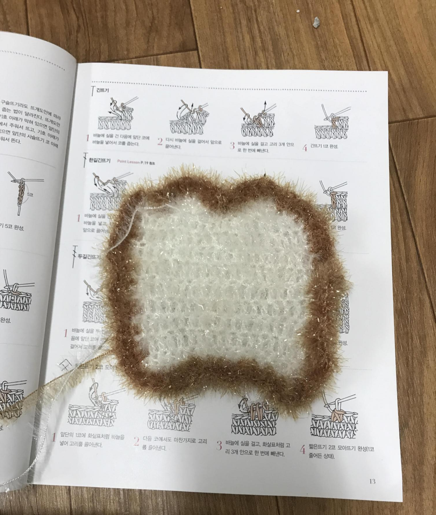 아무튼 그래서 요즘 날마다 식빵 수세미를 만들고 있다. 하나 뜨는 데 2시간 정도 걸리는데 너무 재밌다. 뜨고 나면 식빵이 우글우글쭈글쭈글해서 꼭 무거운 걸로 눌러 주어야 하지만 재밌다.