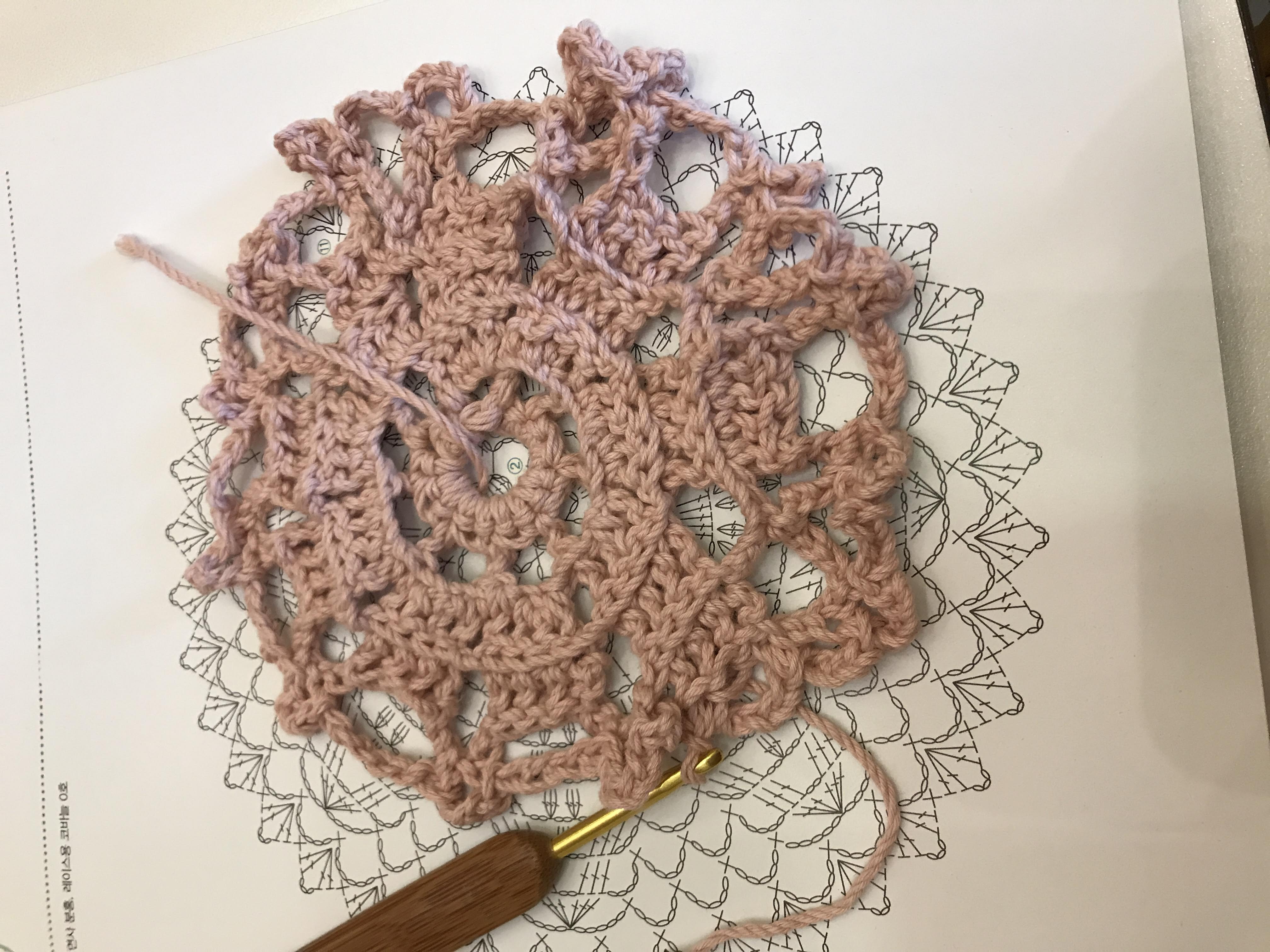 친구에게 빌린 코바늘 실용서를 보면서 열심히 집에서 연습했다. 연분홍 실이 마음에 들어서 죽어라 저 색을 떴다가 풀었다를 반복했다.