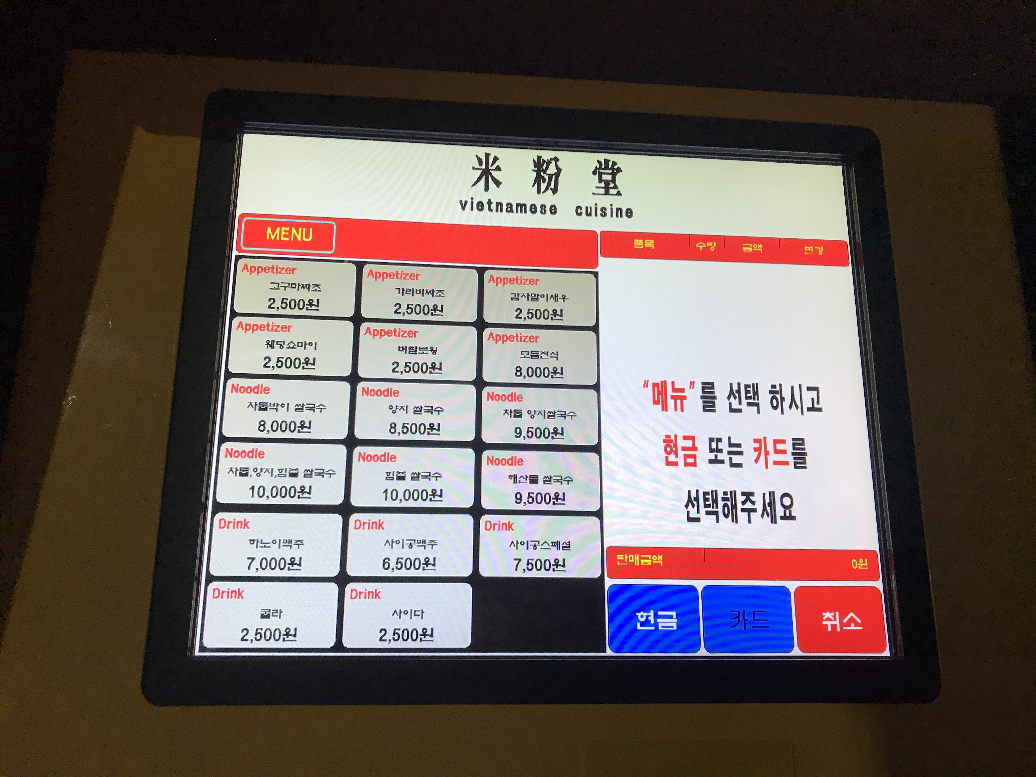 주문은 밖에 있는 키오스크에서 미리 주문하고, 주문표를 직원에게 건네주면 된다. 쌀국수 전문점이라 메뉴도 쌀국수 위주고, 간단한 사이드가 몇 가지 있다.
