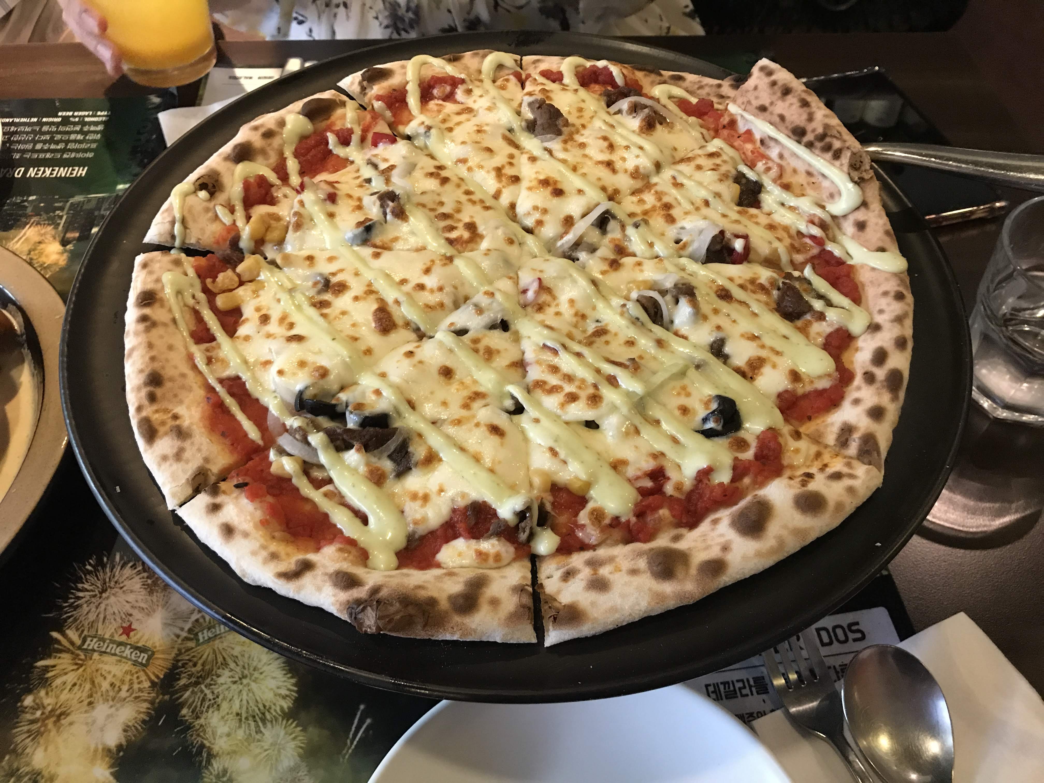 불고기 피자는 끝까지 따뜻하게 먹을 수 있도록 초 위에 올려 준다. 불고기 피자는 불고기 올려져서 무난한 맛이다. 화덕에 구워서 도우가 쫄깃해서 도우만 먹어도 괜찮았다.