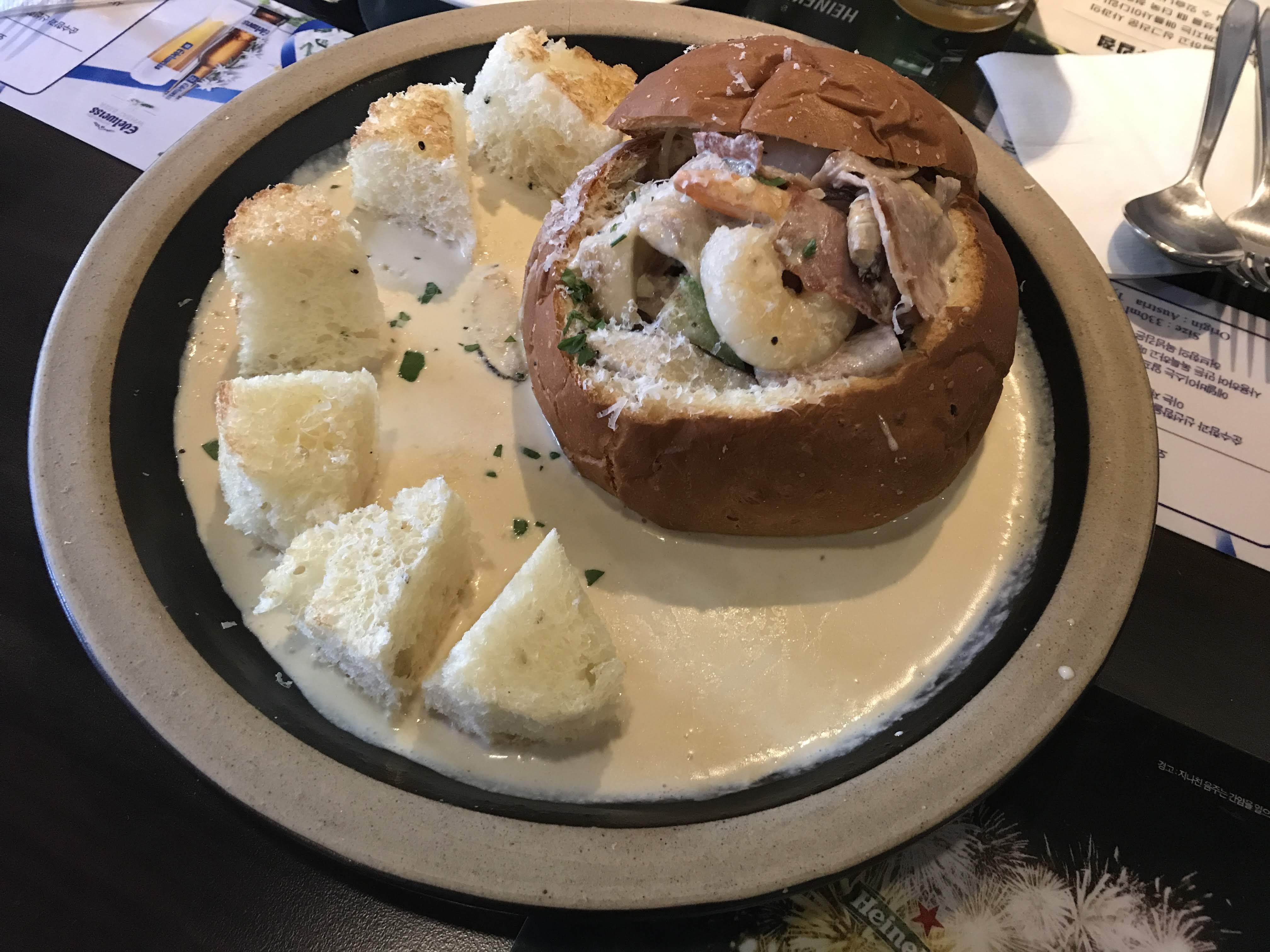 잠시 기다리니 나온 감베리 빠네. 크림소스가 듬뿍 깔린 접시에 빠네 속살들이 올려져 있다. 크림소스를 머금은 빵이 촉촉하고 고소한 것이 일품이다. 안에 든 파스타도 맛있다.