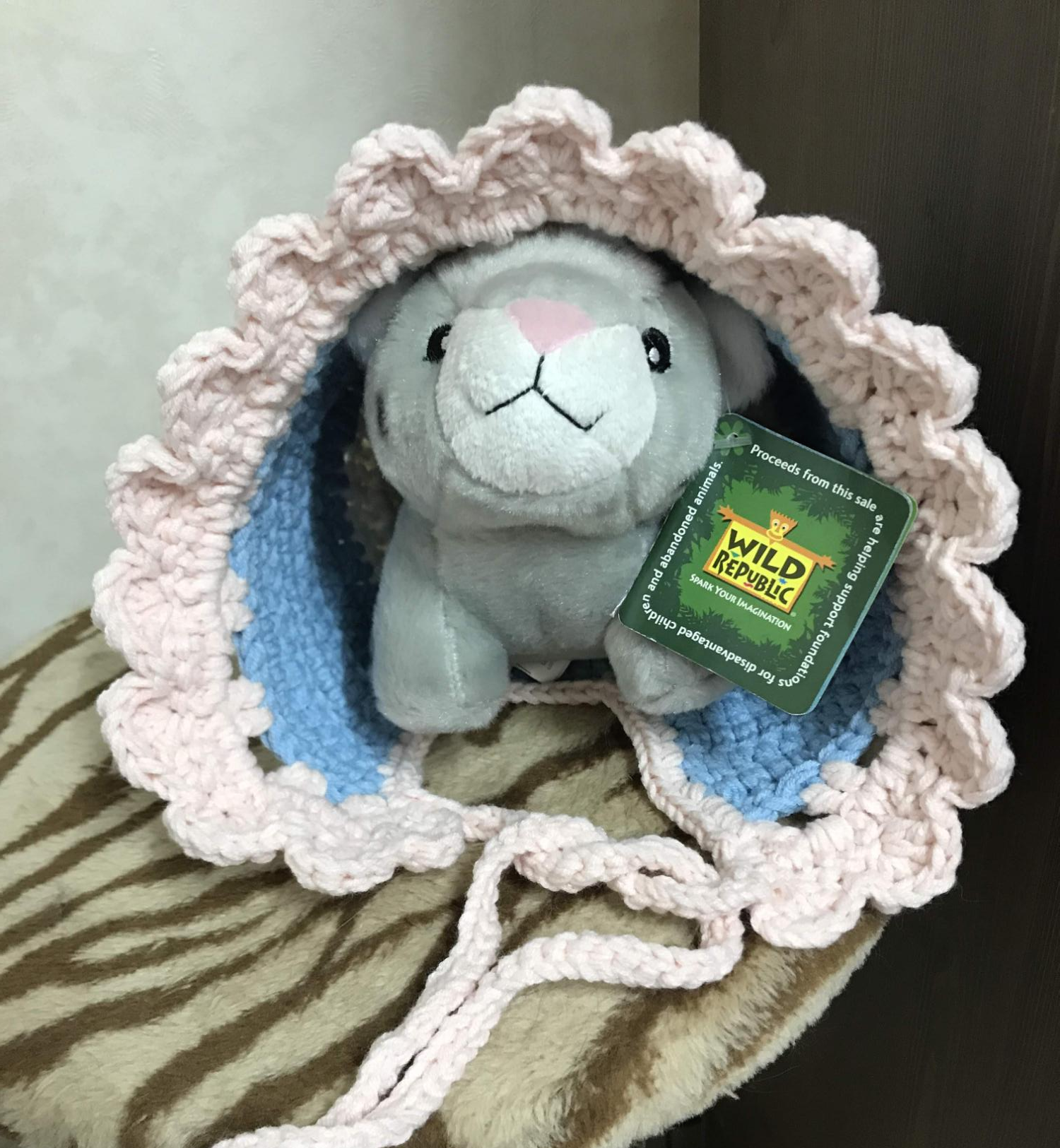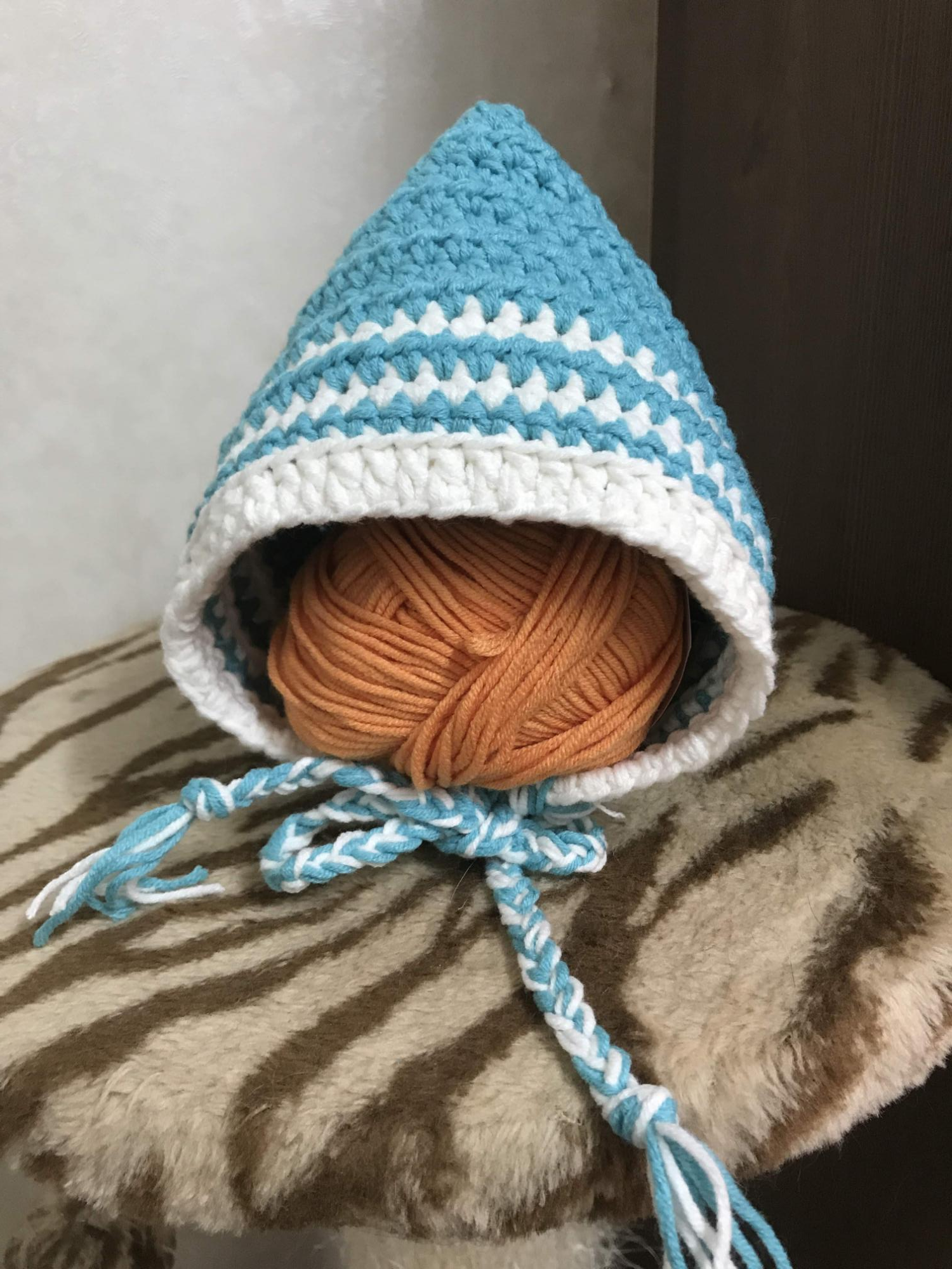 그다음 만든건 보닛. 유튜브에서 릴리보닛 뜨는 법이라는 영상을 보고 만들었다. 이건 48센치로 머리 크기를 잡고 작업을 했더니 실이 더 엄청나게 들어갔다. 그래서 실이 모자라는 바람에 배색을 3번이나 하게 됐다. 그래도 나름 배색이 나쁘지 않다고 위로....