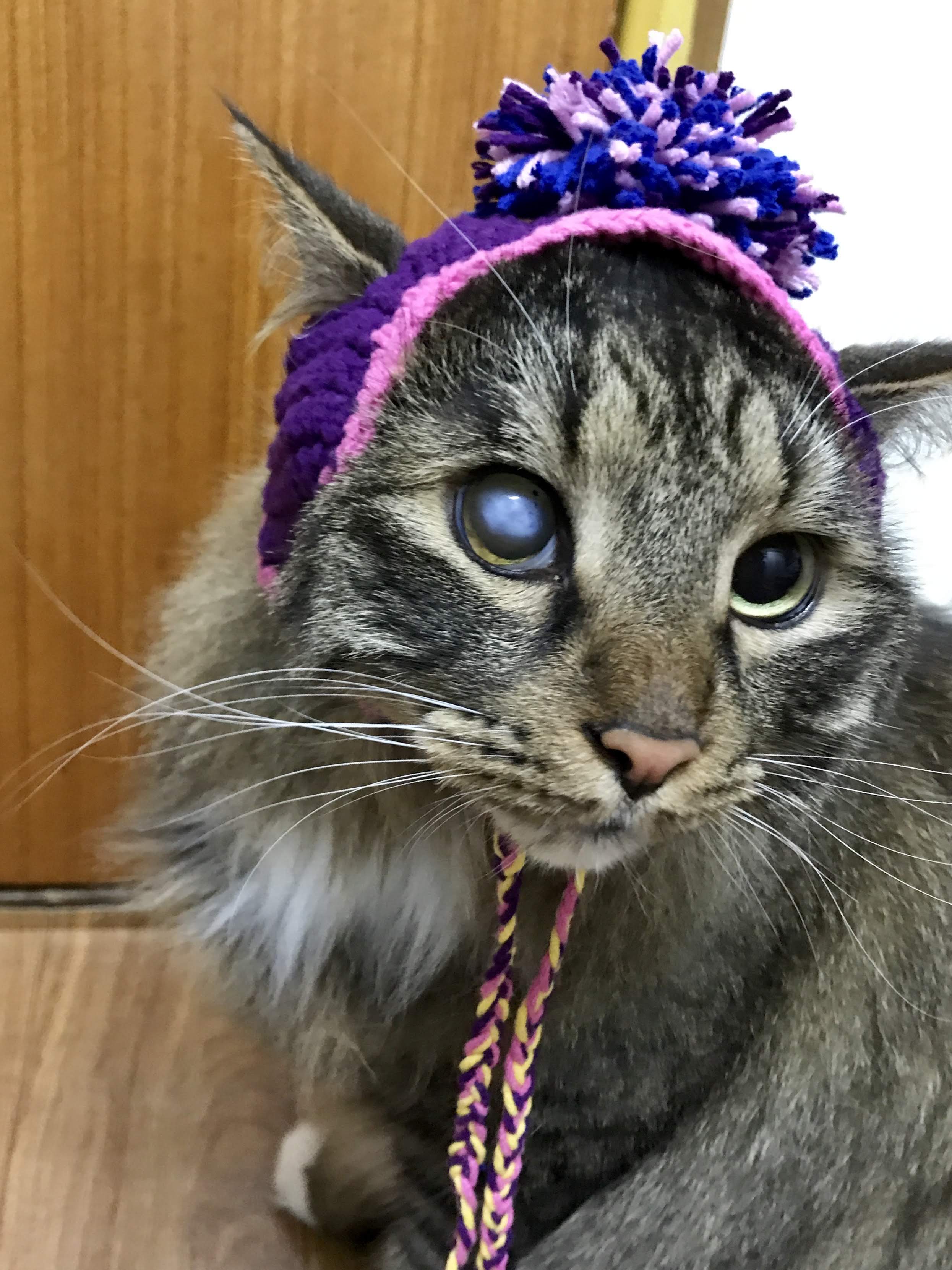 그다음 바로 고양이용 왕방울 모자에 도전했다. 저 왕방울 폼폼은 사는 건 줄 알았는데, 의외로 만드는 직접 만들어 다는 거였다. 아직 도안 잘 볼 줄 몰라서 모양이 좀 이상했지만, 어쨌건 옆에 고양이 양반 앉혀 놓고 귀 나오는 위치랑 보면서 했더니 대충 맞는다. 그러나 엄청 싫어한다. 귀 나올 수 있게 구멍 뚫어 준 의미도 없이 마징가귀를 만드는 바람에 자꾸 귀가 빠져나왔다.