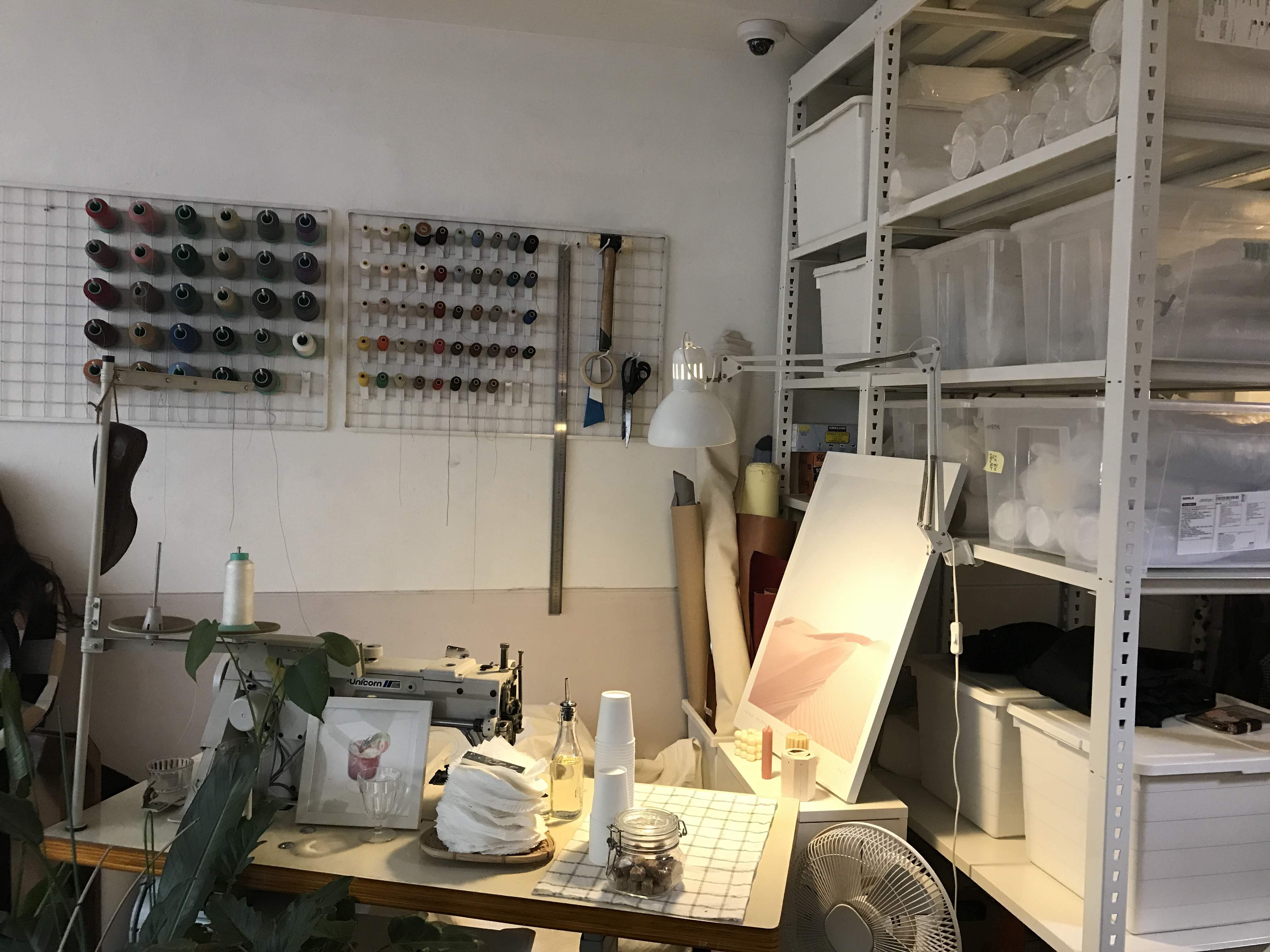 가게 한쪽에 이렇게 실과 미싱 기계가 있다. 방적 공장 같기도 하고 특이하다.