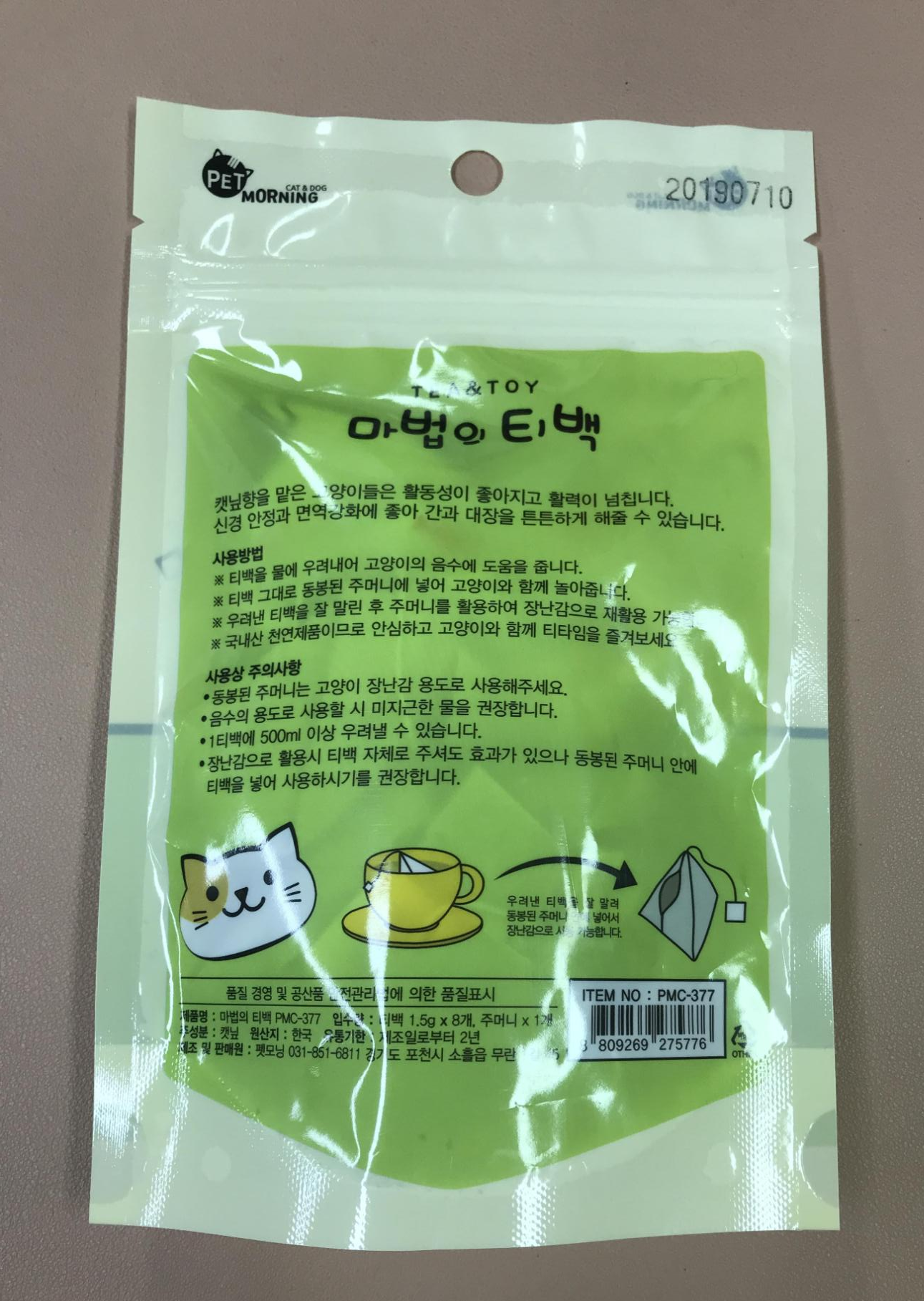 천 주머니에 구멍이 있어서 티백을 넣을 수 있다. 차가운 물에 우리면 한두 시간은 담가야 물색이 변할 정도로 우러난다. 그래서 뜨거운 물에 샥 우린 뒤 찬물을 섞어서 고양이에게 들이밀었다.
