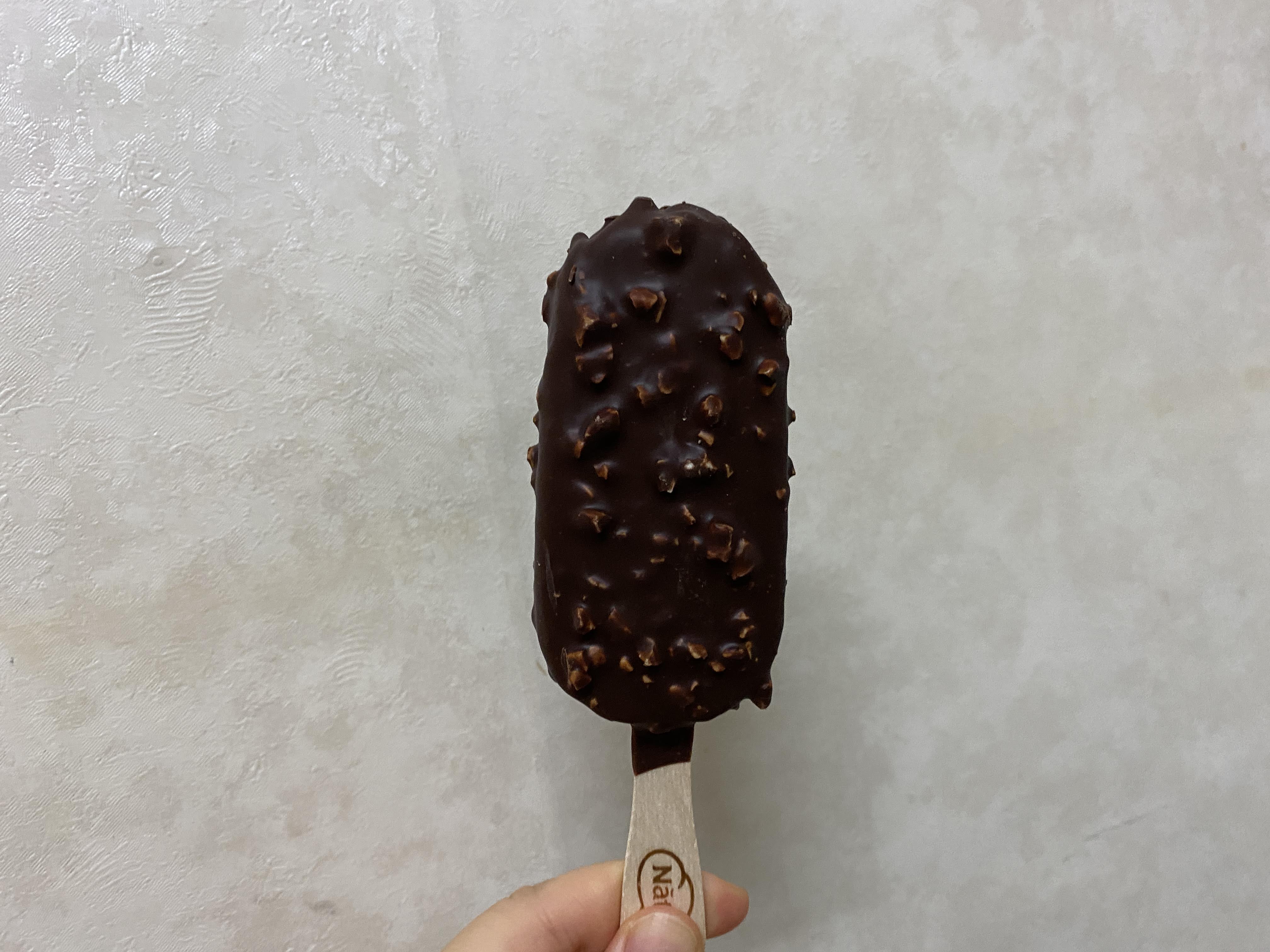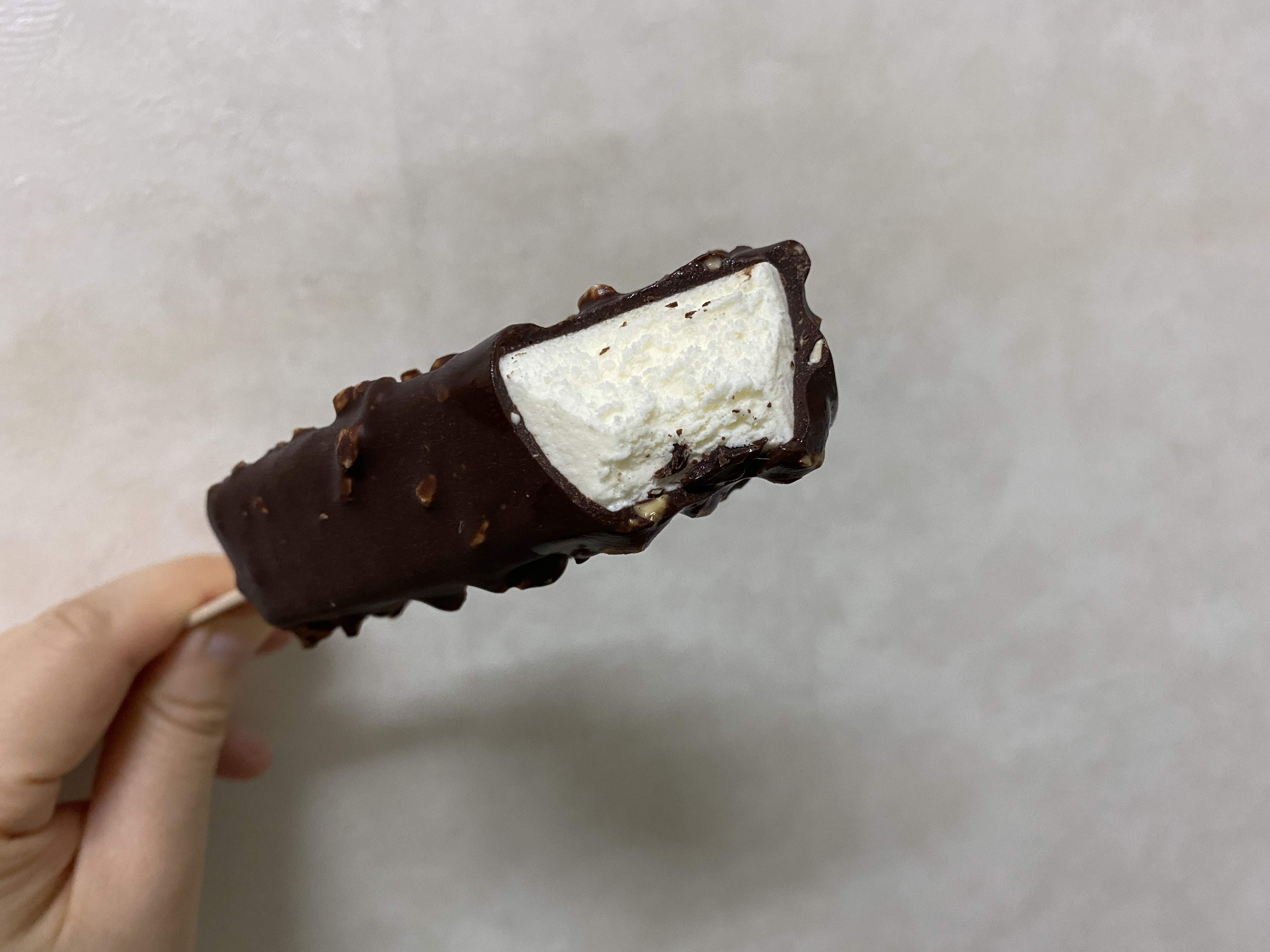 포장을 까면 진한 갈색 초콜릿에 아몬드 조각이 박힌 아이스크림이 나온다.