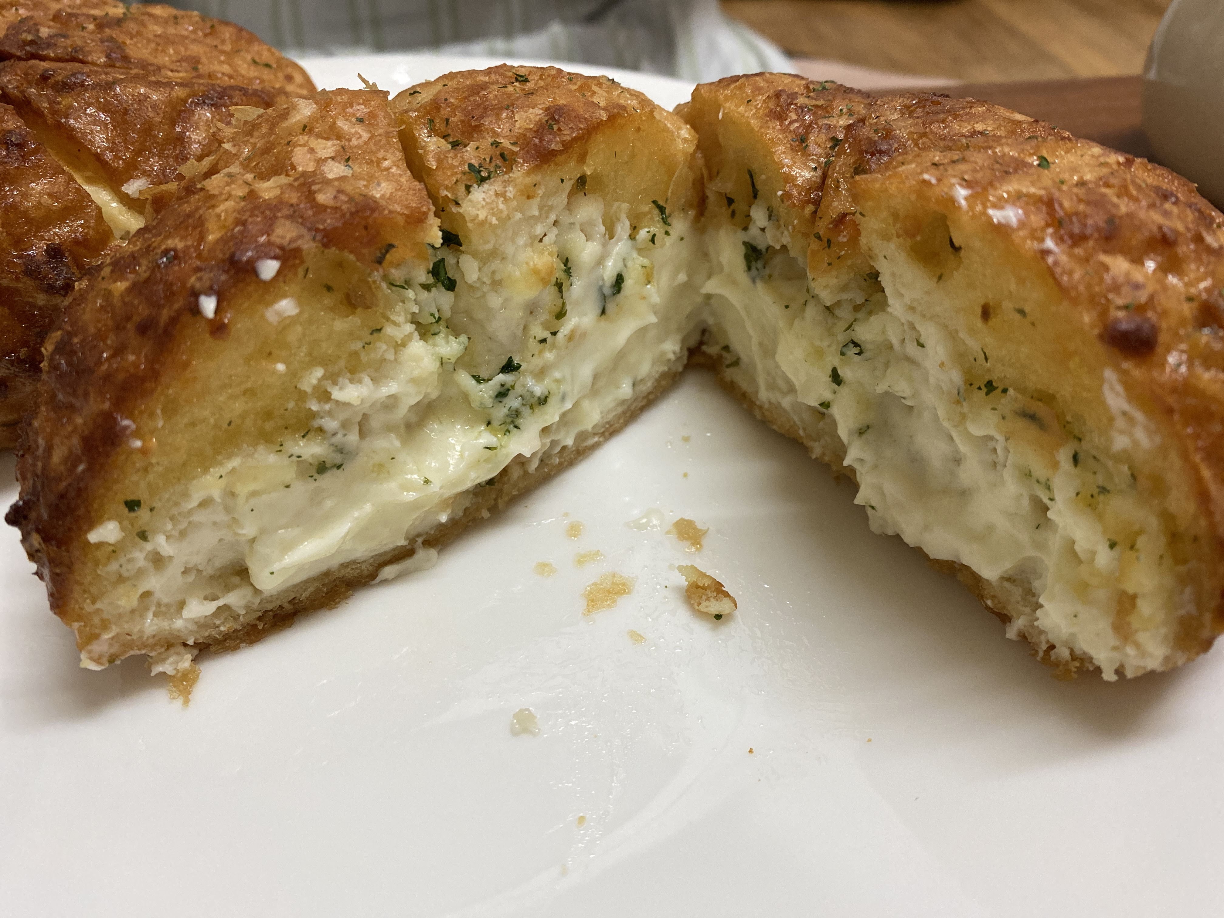 대망의 속살 공개! 안에 든 것은 크림치즈다. 마늘 버터에 푹 절인 빵에 크림치즈를 듬뿍 얹어 먹는 맛.