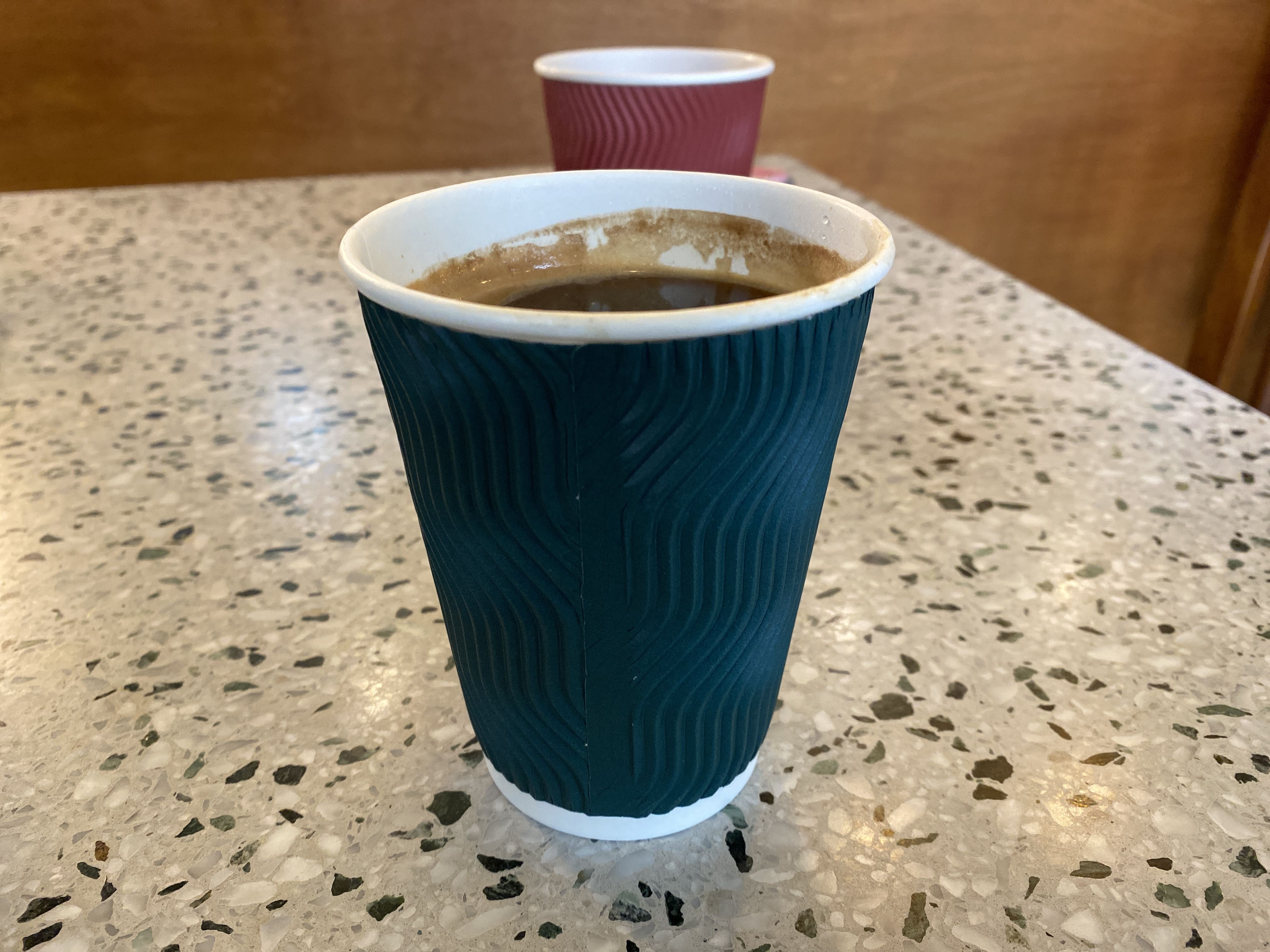 아메리카노를 한 잔 시켰는데 잔부터 무척 마음에 들었다. 홀더 없이도 컵이 충분히 두툼해서 손이 뜨겁지 않았다. 벽지 색과 닮은 예쁜 컵이 마음에 든다.