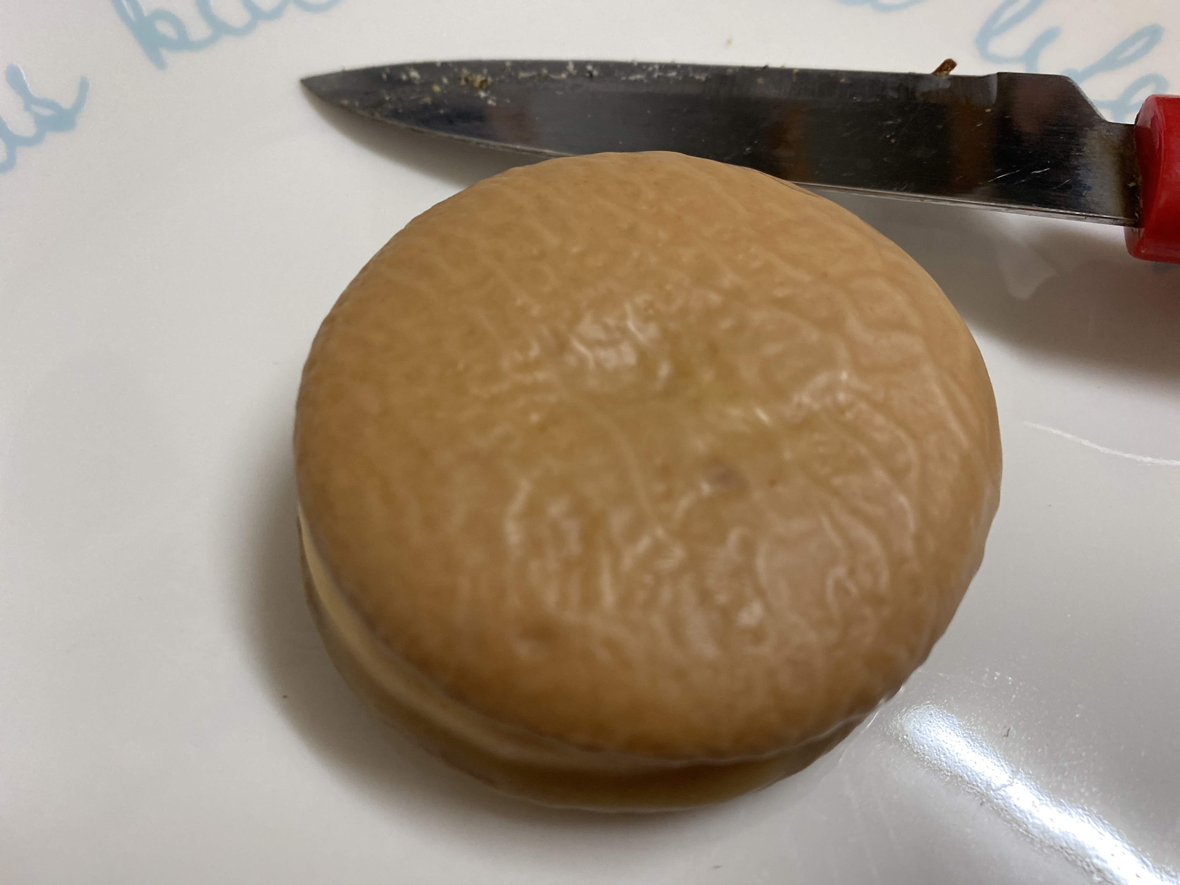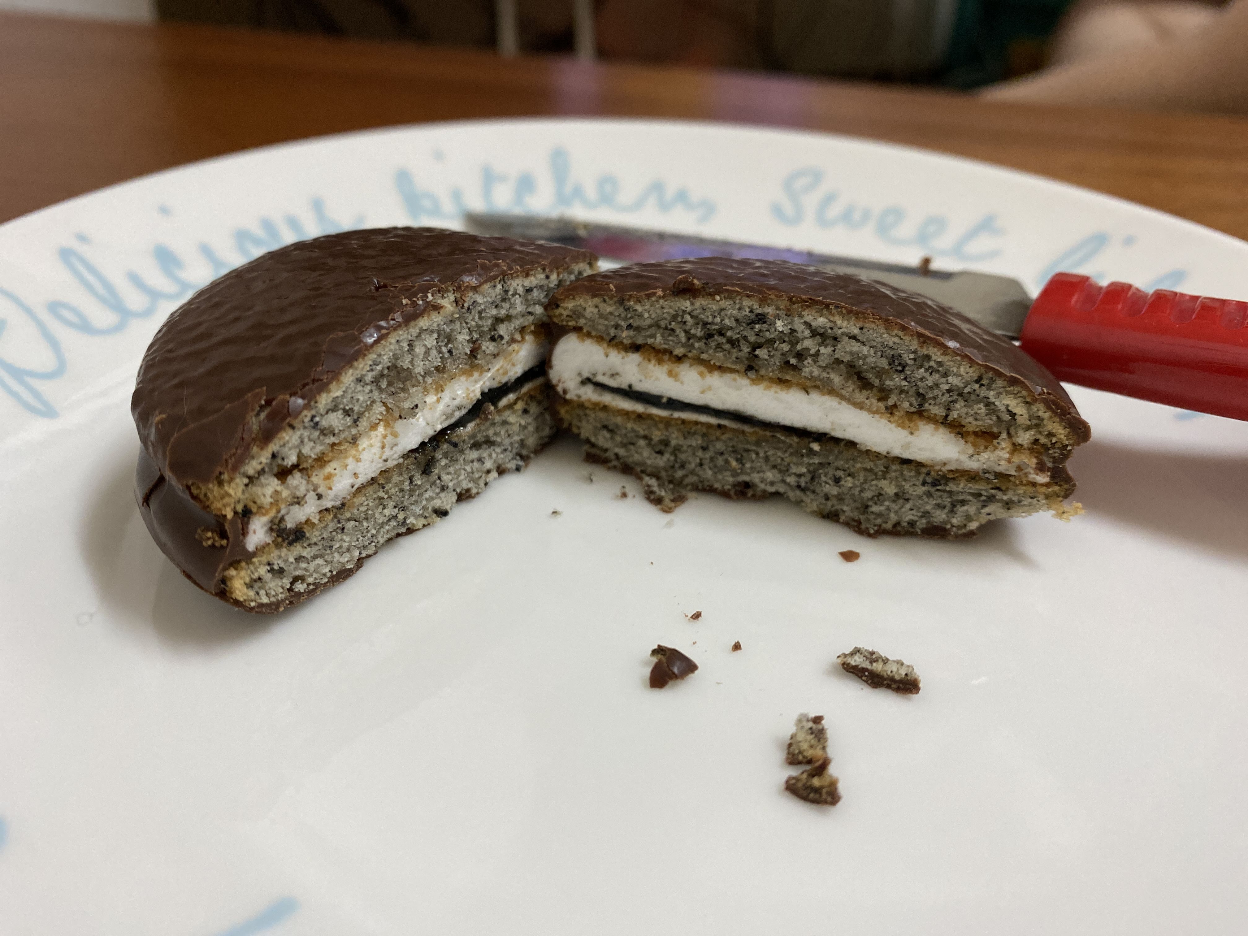 반 갈라 봤다. 흑임자 찰초코파이를 먼저 자르고 잘라서 약간 까만게 묻어났다. 마시멜로우 사이에 살짝 떡이 보인다. 그리고 인절미 맛 페이스트도 보인다.