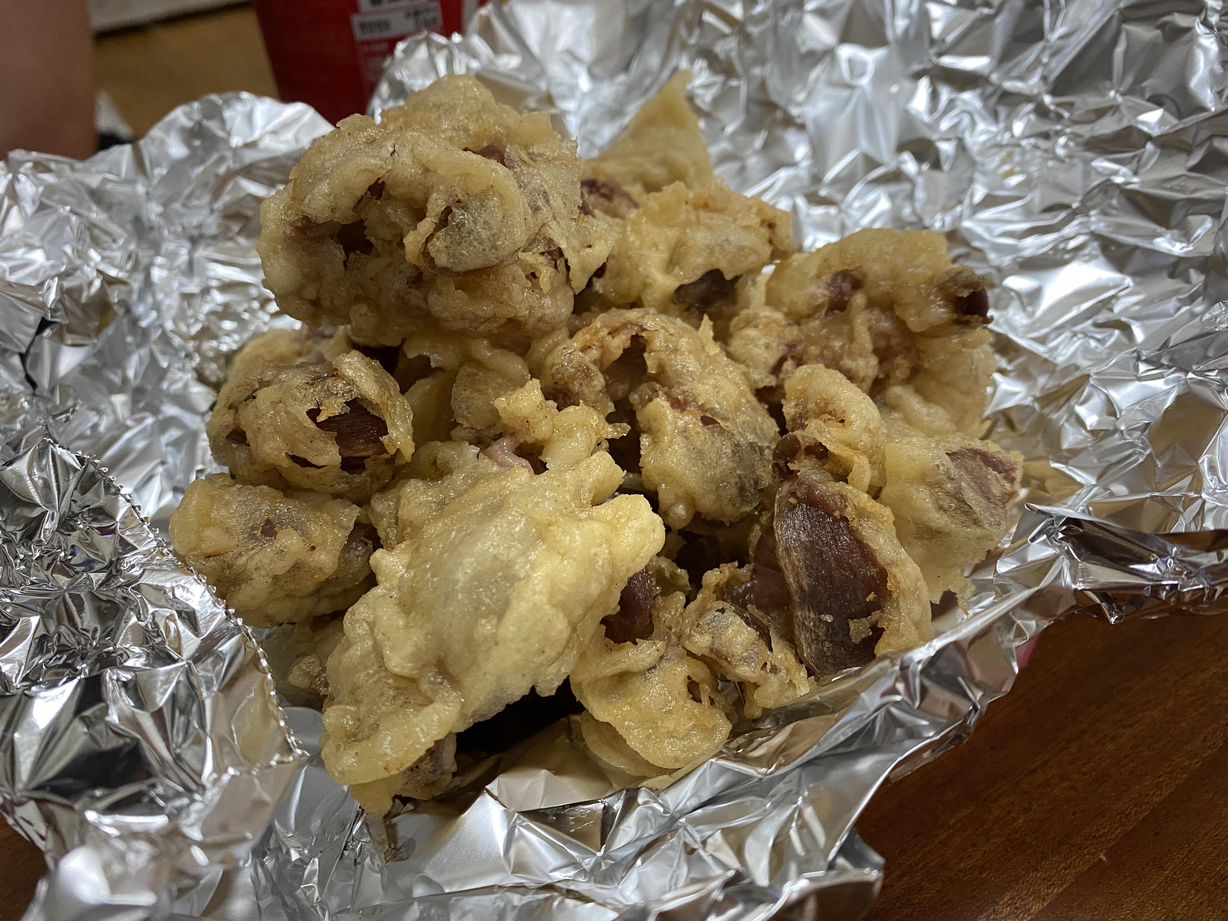 닭똥집 튀김의 비주얼. 이렇게 보면 양이 잘 가늠되지 않겠지만, 생각보다 양도 많고 맛있다. 일단 튀긴 똥집이 크다. 보통 다른 치킨집에서 닭똥집 튀김을 시키면 작게 자른 똥집을 튀겨서 주는데 여기는 큼직한 똥집을 튀겼기 때문에 씹는 맛이 다르다. 쫄깃쫄깃한 닭똥집 식감을 마음껏 즐길 수 있다. 아마 순수 들어간 닭똥집 양만 따져 본다면 다른 치킨집보다 월등히 많을 것 같다.