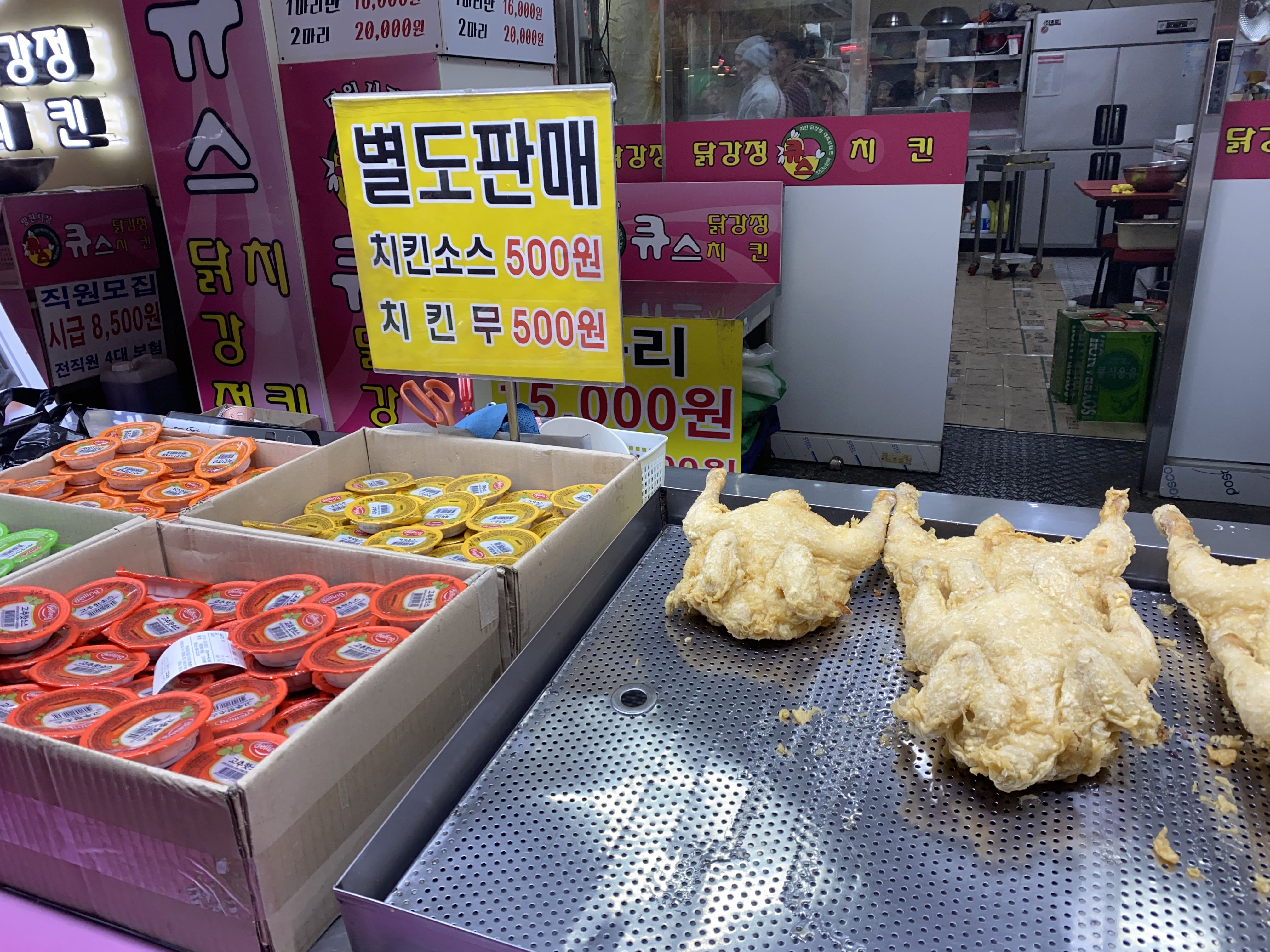 닭강정뿐만 아니라 통닭도 한쪽에서 팔고 있다. 치킨소스나 치킨무는 별도 판매이므로 필요하다면 계산하기 전에 꼭 이야기하자.