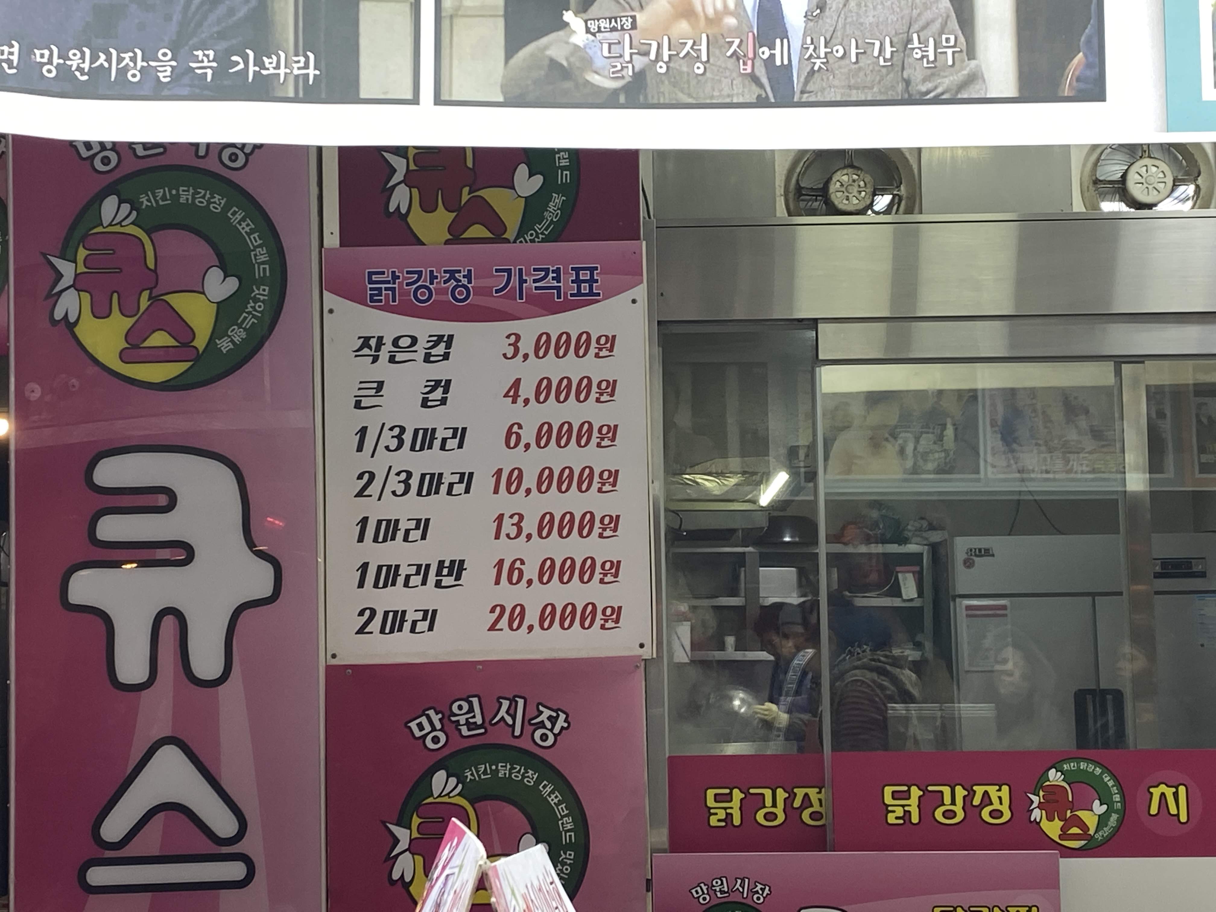 이날도 갔더니 관광객으로 보이는 외국인들이 줄 서 있었다. 닭강정을 사 먹다니 먹을 줄 아는 관광객들인 것 같아서 기분이 좋았다. 아무튼, 큐스 닭강정의 가격표.