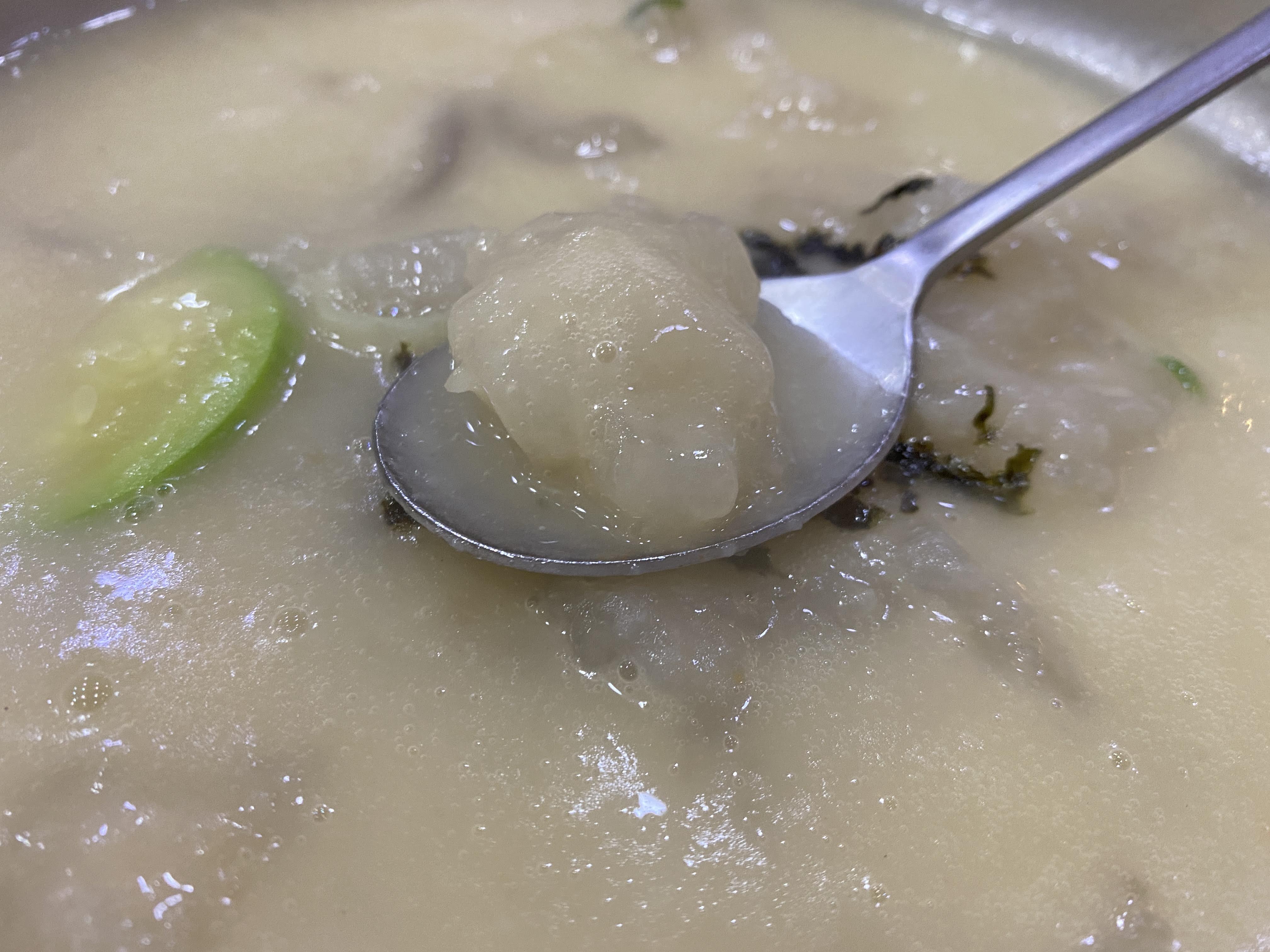 식감도 감자떡이랑 비슷하게 쫀득쫀득하다. 옹심이 맛 자체는 간이 강하지 않고 무언가 특별나는 맛은 없다. 그런데 육수가 굉장히 걸쭉하고 진해서 이거랑 먹으면 삼삼하니 묘한 매력이 있다. 처음에는 되게 낯설었는데 한 입, 두 입 먹다 보면 점점 구수한 것이 자꾸 당긴다.