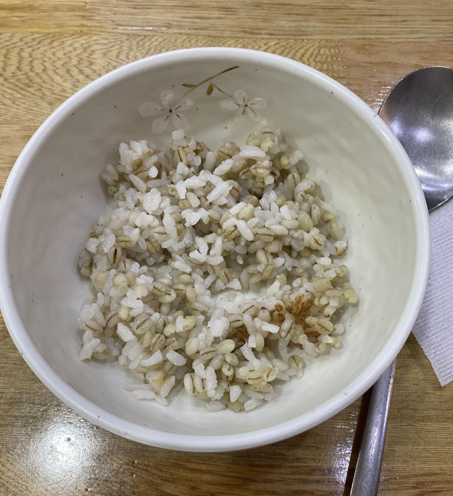 일단 자리에 앉으면 이렇게 보리밥을 조금 준다. 여기에 아까 덜어 놓은 김치랑 고추장을 넣고 삭삭 비벼 먹었다.