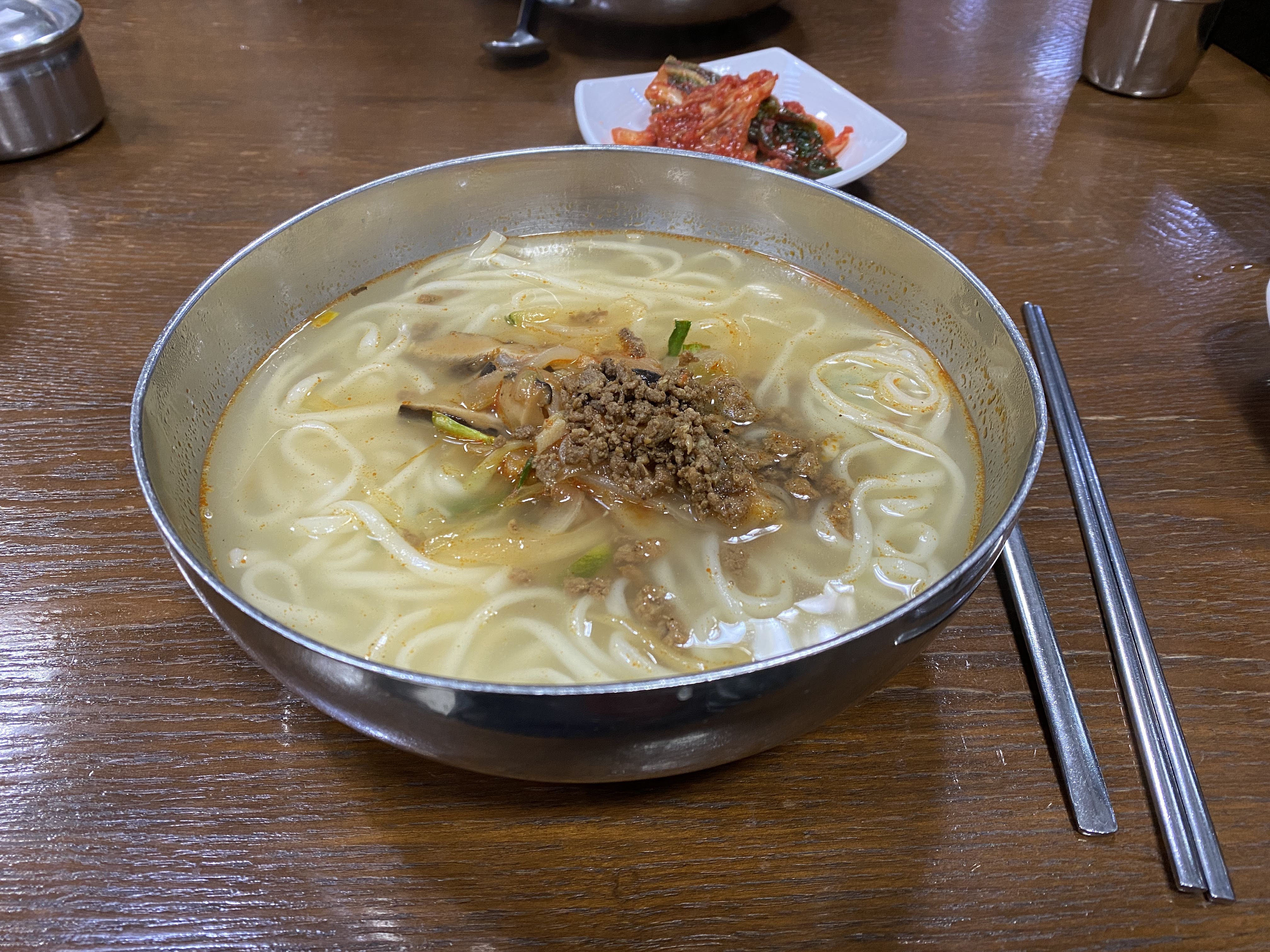 따끈하게 나온 칼국수. 위에 고명이 이것저것 많다. 작은 물만두도 2개 들었다.