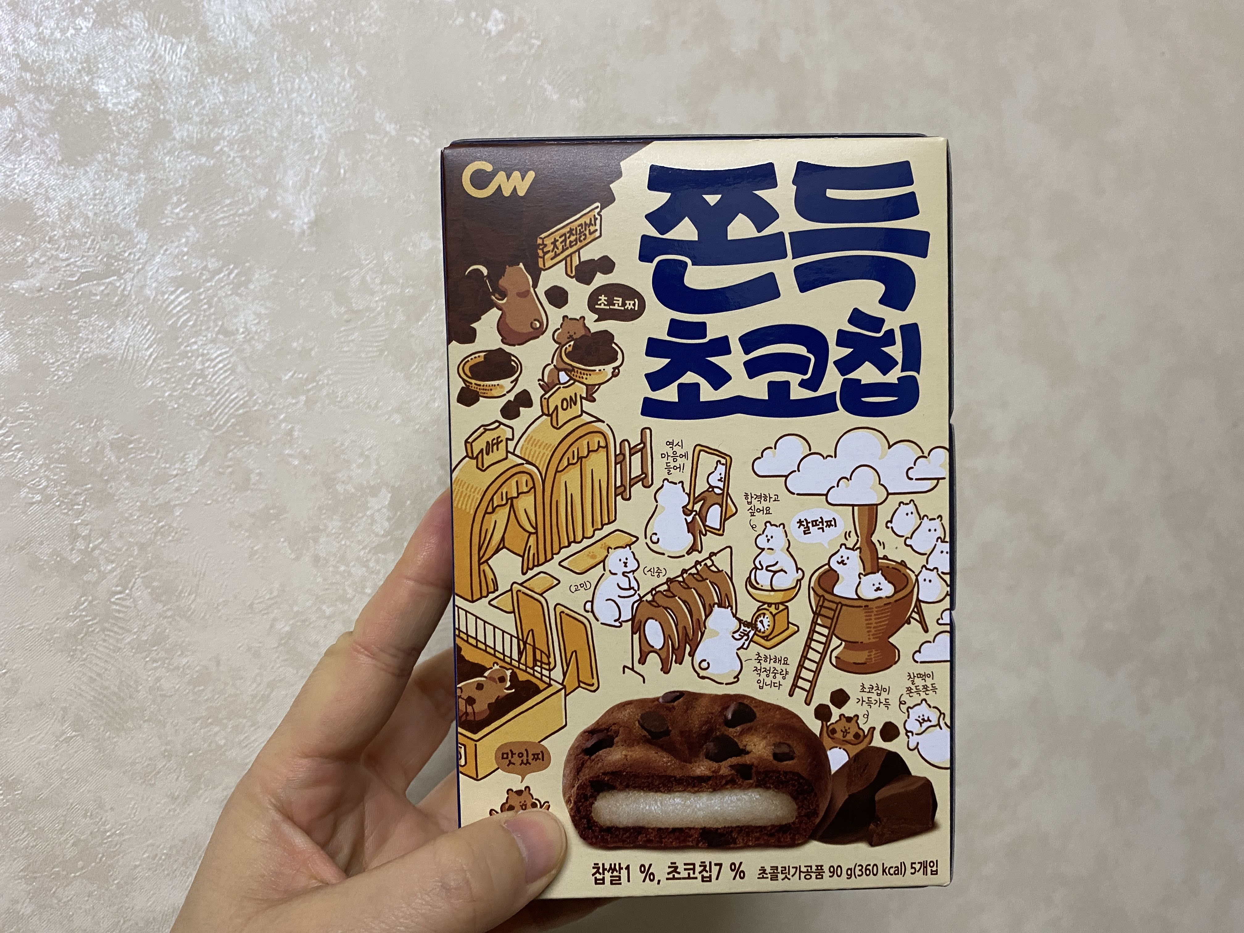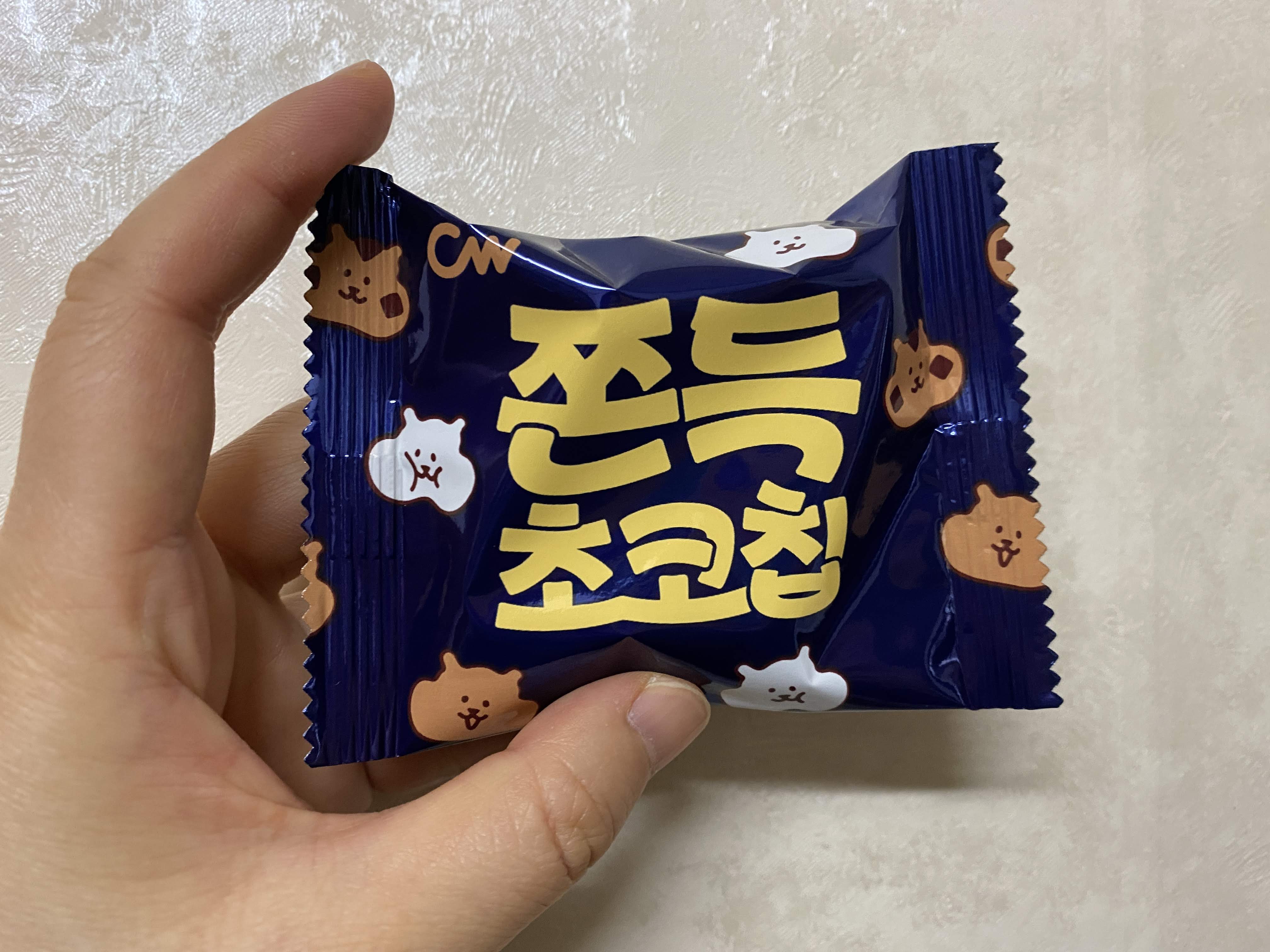 청우에서 새로 나온 쫀득 초코칩. 나온 지는 좀 지났는데 판매처가 내 눈에 뜨인 것은 최근이다. 나왔다는 걸 알았을 때 생김새가 너무 귀여워서 꼭 사고 말리라 다짐했는데 이제서야 샀다. 나는 작은 상자를 샀다. 요런 개별 포장으로 5개가 들어있다.