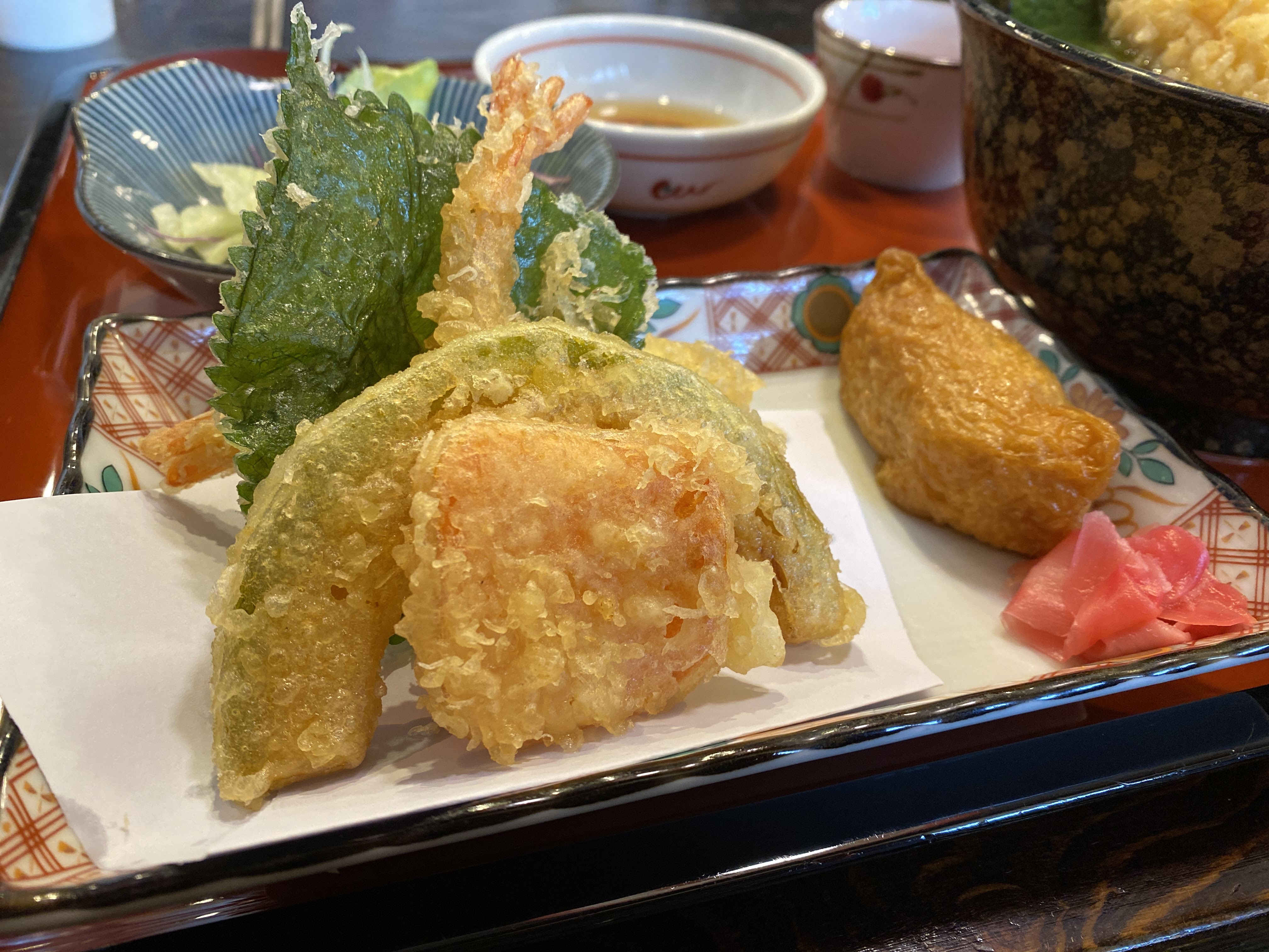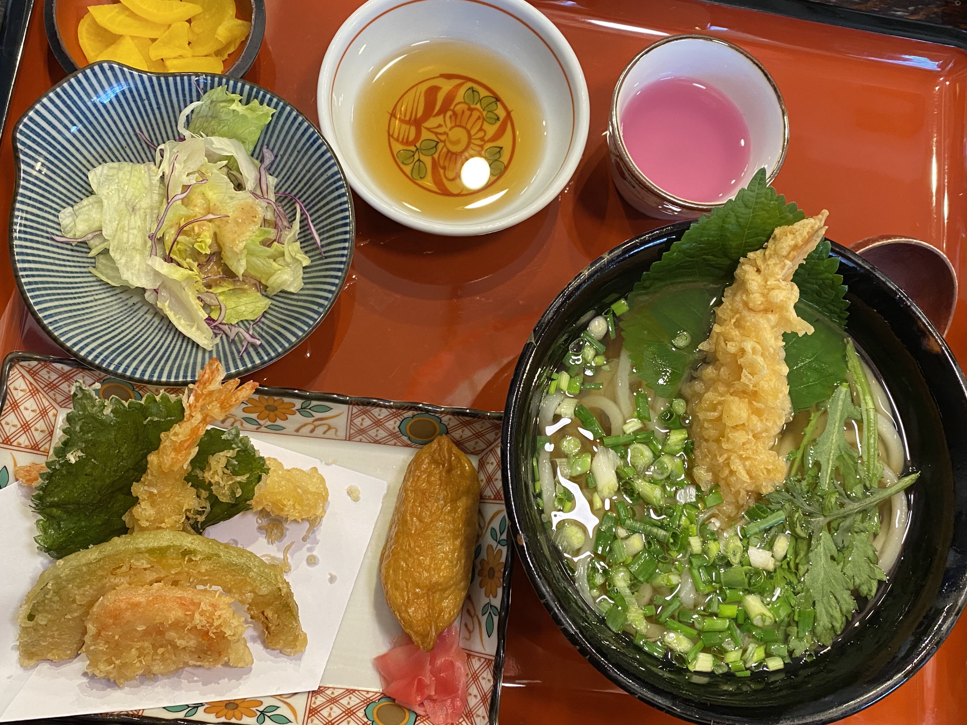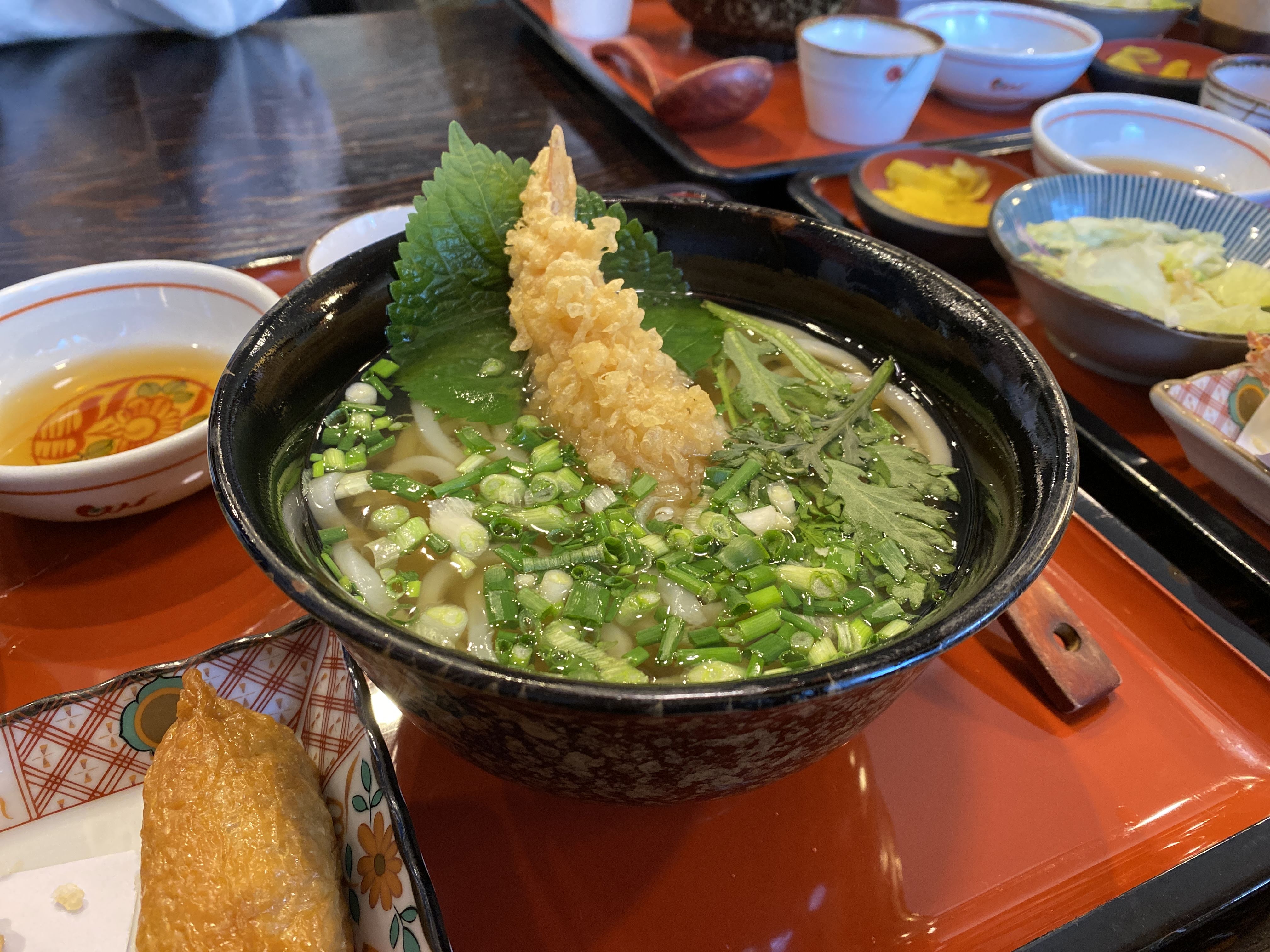 자리를 안내받고 잠시 있으려니 금세 메뉴가 나왔다. 튀김이랑 유부초밥, 샐러드, 단무지, 튀김을 찍어 먹을 간장, 매실차(?)가, 우동이다.