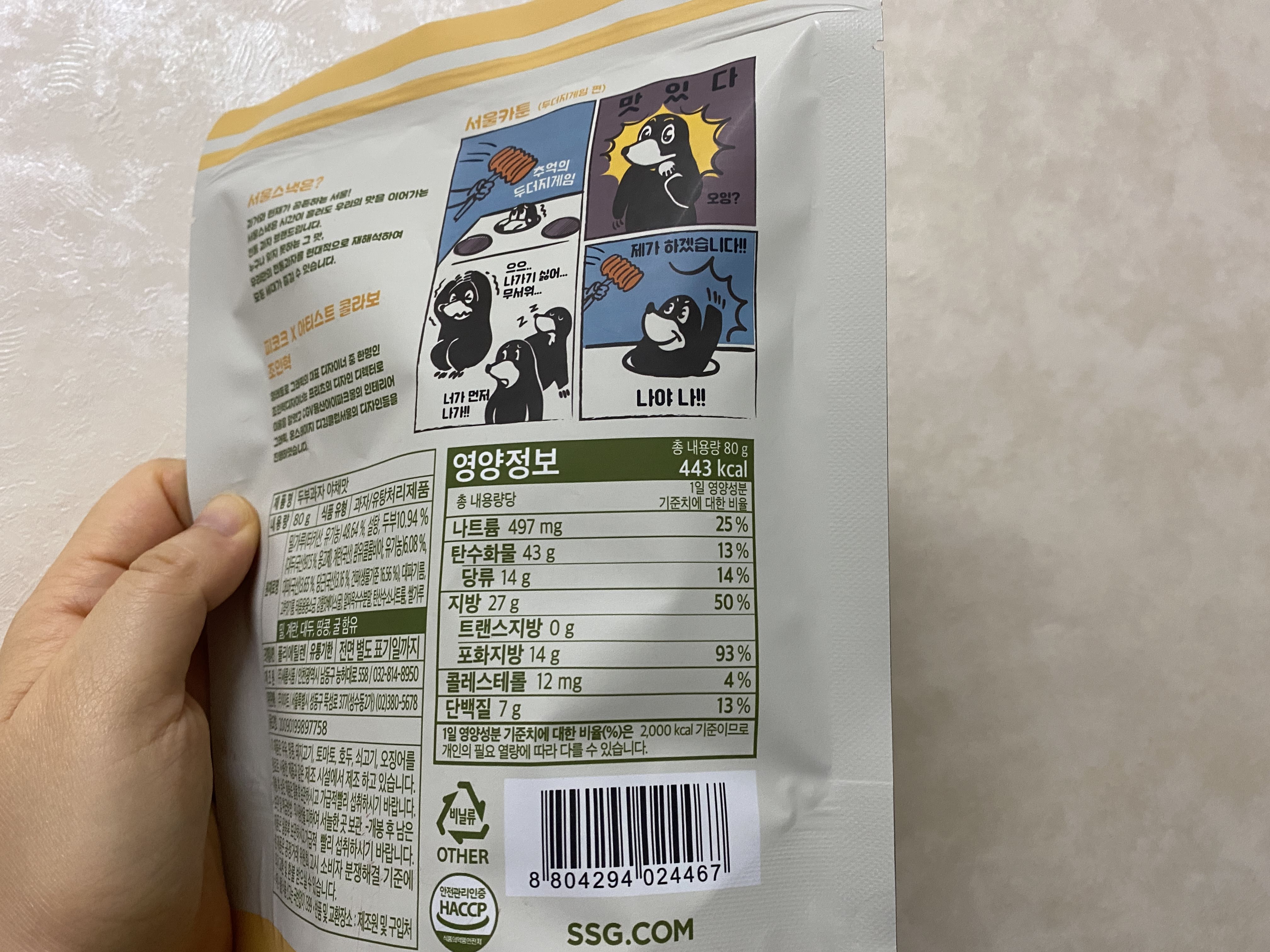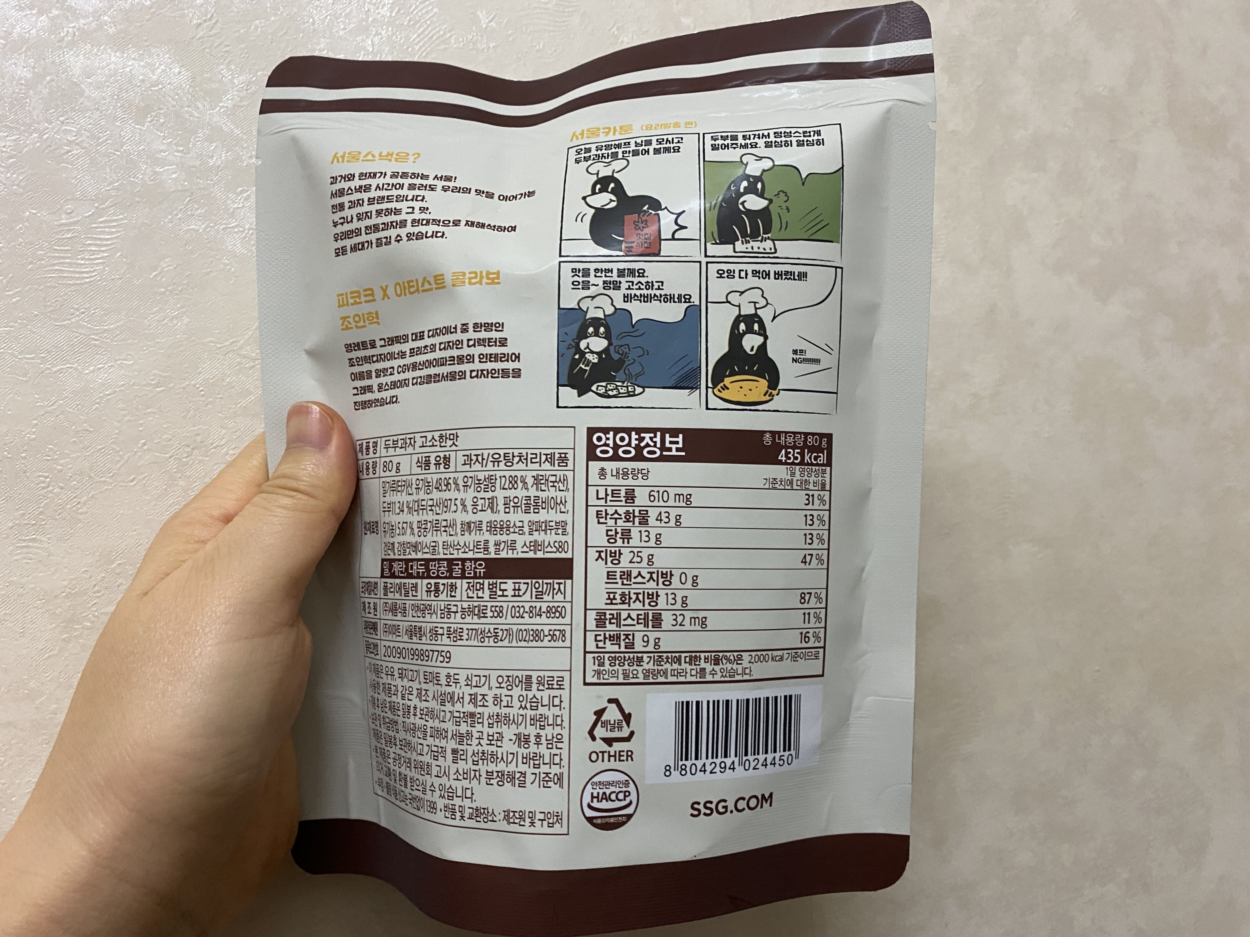 뒷면 디자인도 이쁘다. 예술이란 참 신기한 게 줄 하나 색의 약간의 명도 차이 같은 걸로 촌스럽고와 세련되고가 갈린다. 그리고 그런 감각은 타고나는 부분이 참 큰 듯하다. 영양정보와 칼로리 체크체크.