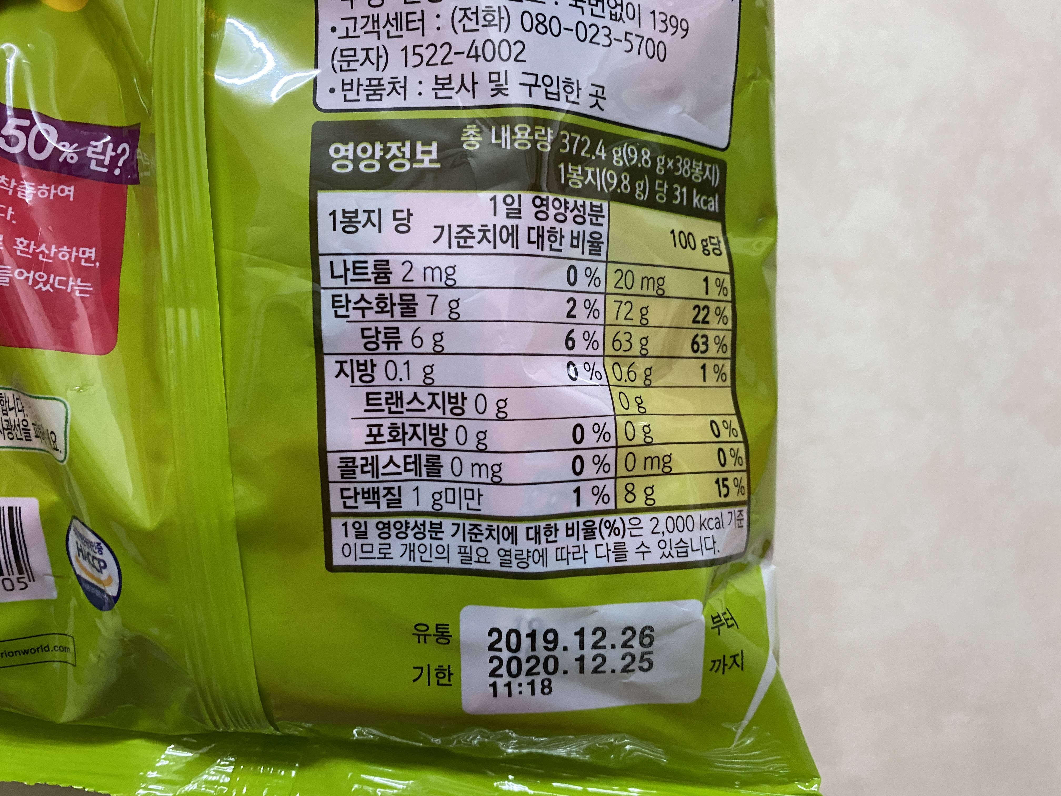 젤리의 영양 정보는 안 보는 게 속 편하지만, 그래도 있으니까 찍어서 올린다. 그래도 한 봉만 먹으면 칼로리는 낮다.