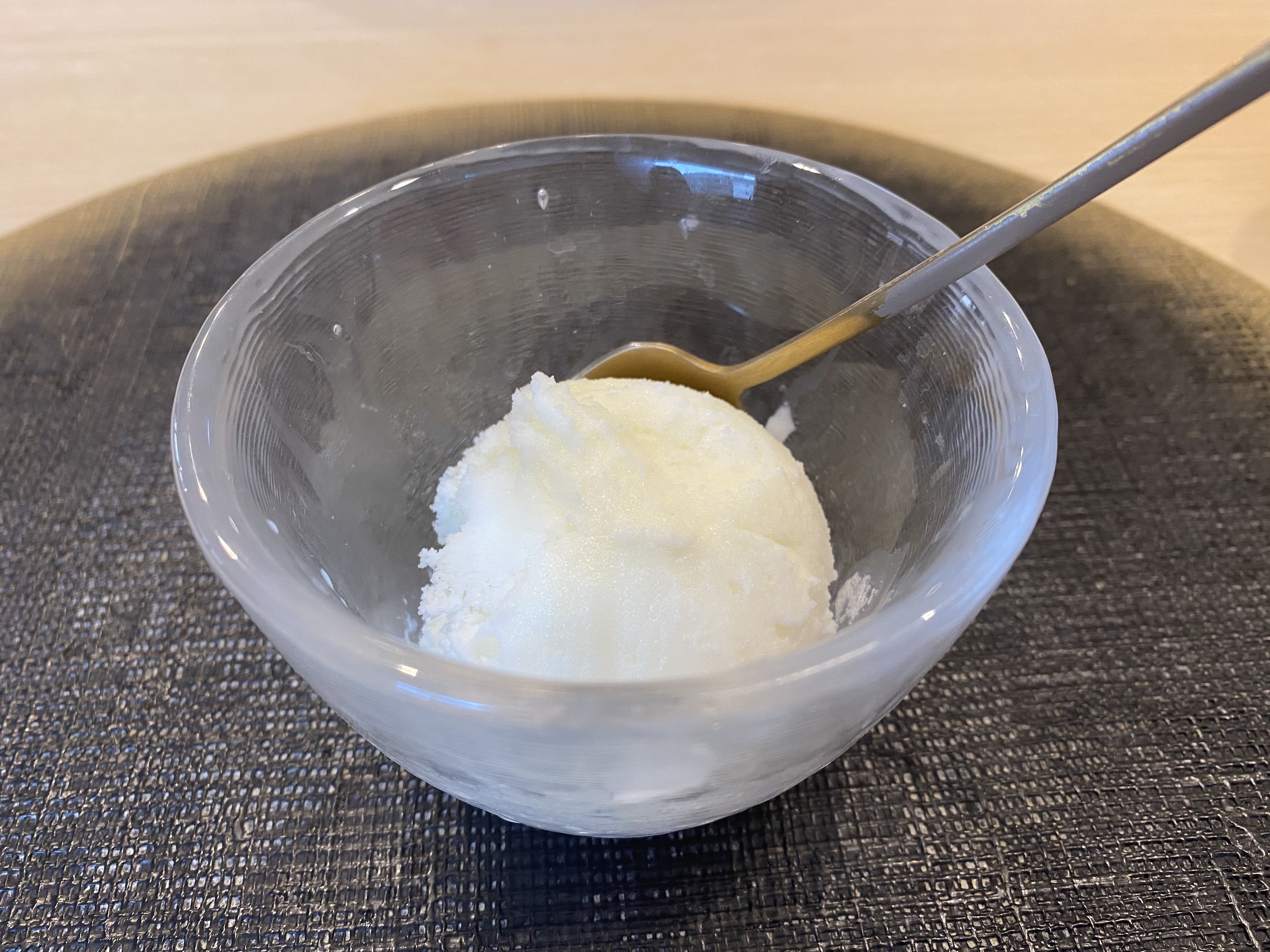 디저트로 나온 소금 아이스크림. 이것도 내 입맛이 아니다. 한 입 먹고 숟가락을 내려 놓으니까 셰프 분이 입에 안 맞냐고 물어보셔서 좀 쑥스러웠다. 하지만 달지도 않고 미묘하게 짜고 그래서 뭔가 치약 먹는 기분이라 더 먹고 싶지 않았다.