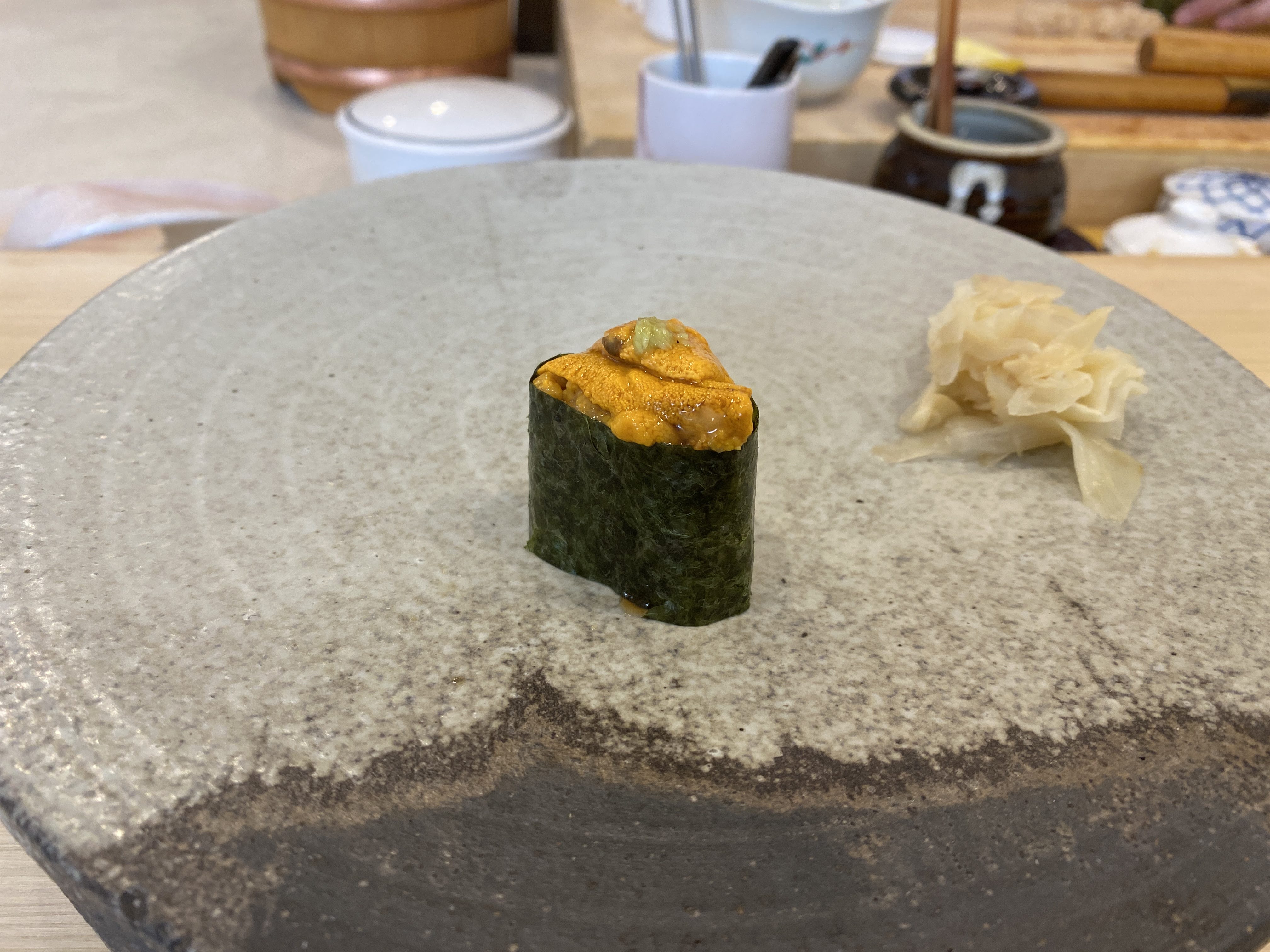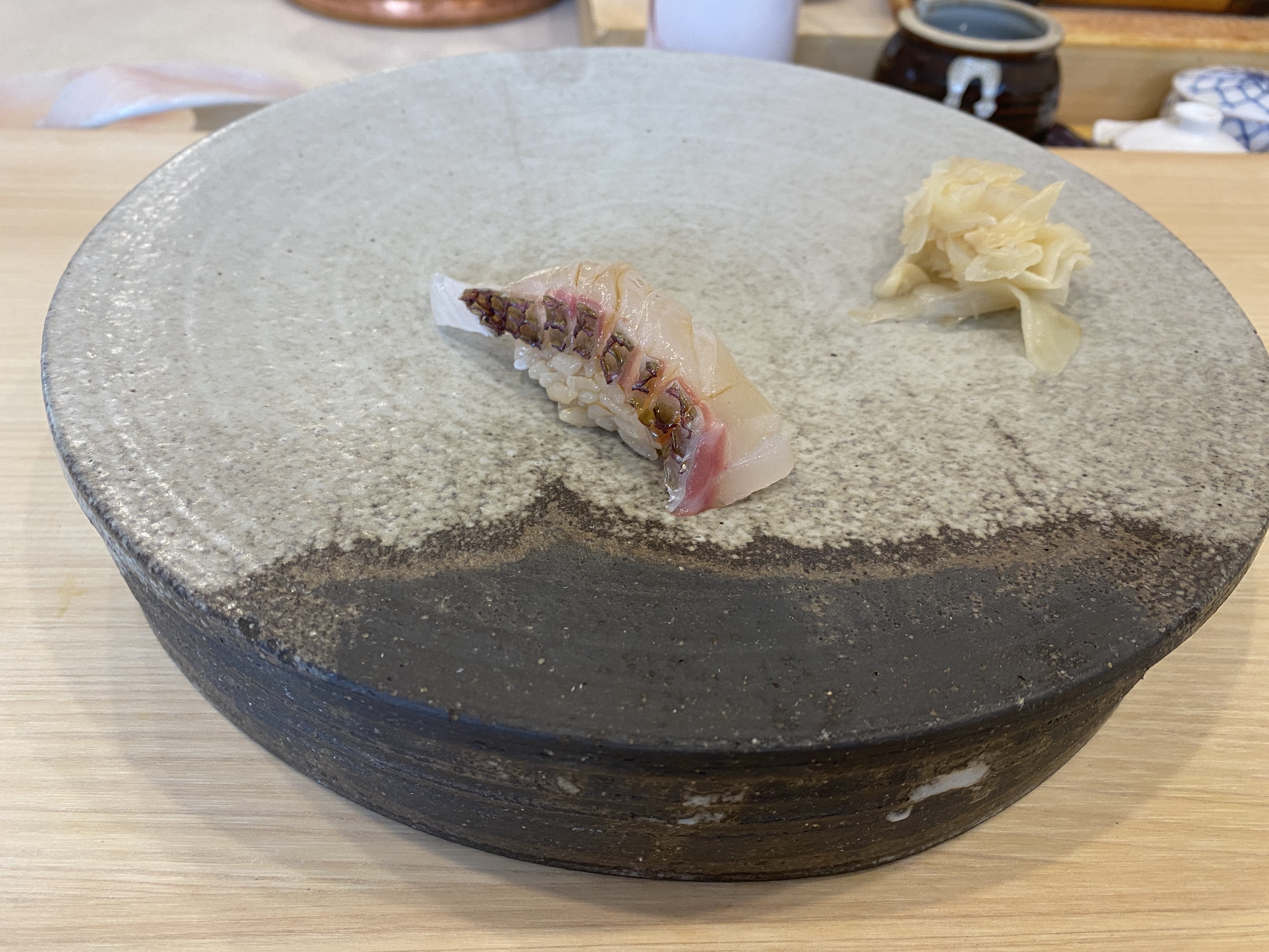 오마카세라서 나는 일부러 하나도 변경하지 않고 다 먹었지만, 코스가 시작되기 전에 못 먹거는 거나 싫어하는 재료가 있는지 물어 보신다. 그때 얘기하면 다른 걸로 대체해서 주신다. 내 친구는 굴과 알을 먹지 않겠다고 했고, 굴과 알 대신에 게살이 올라간 초밥과 농어를 받았다.