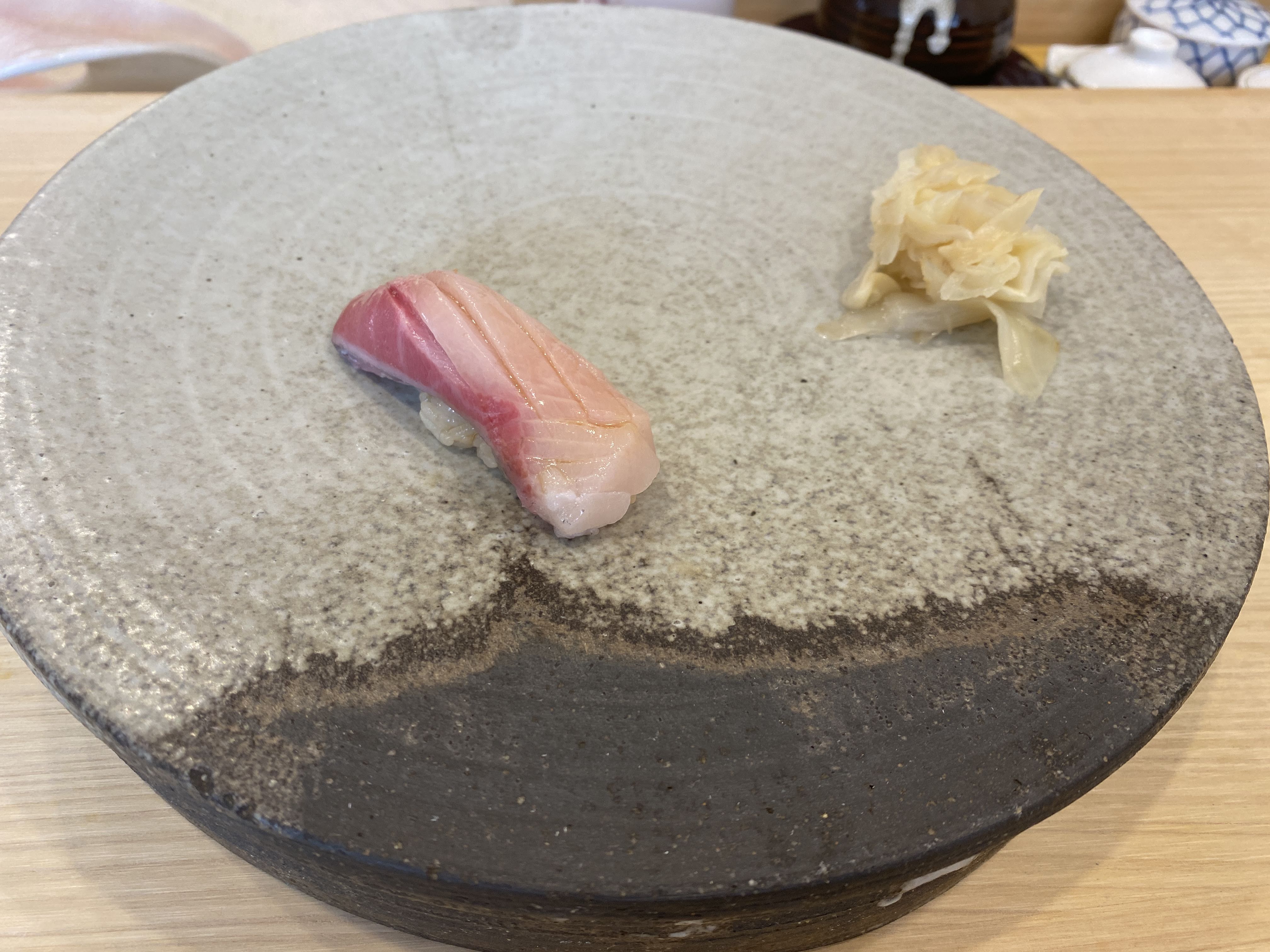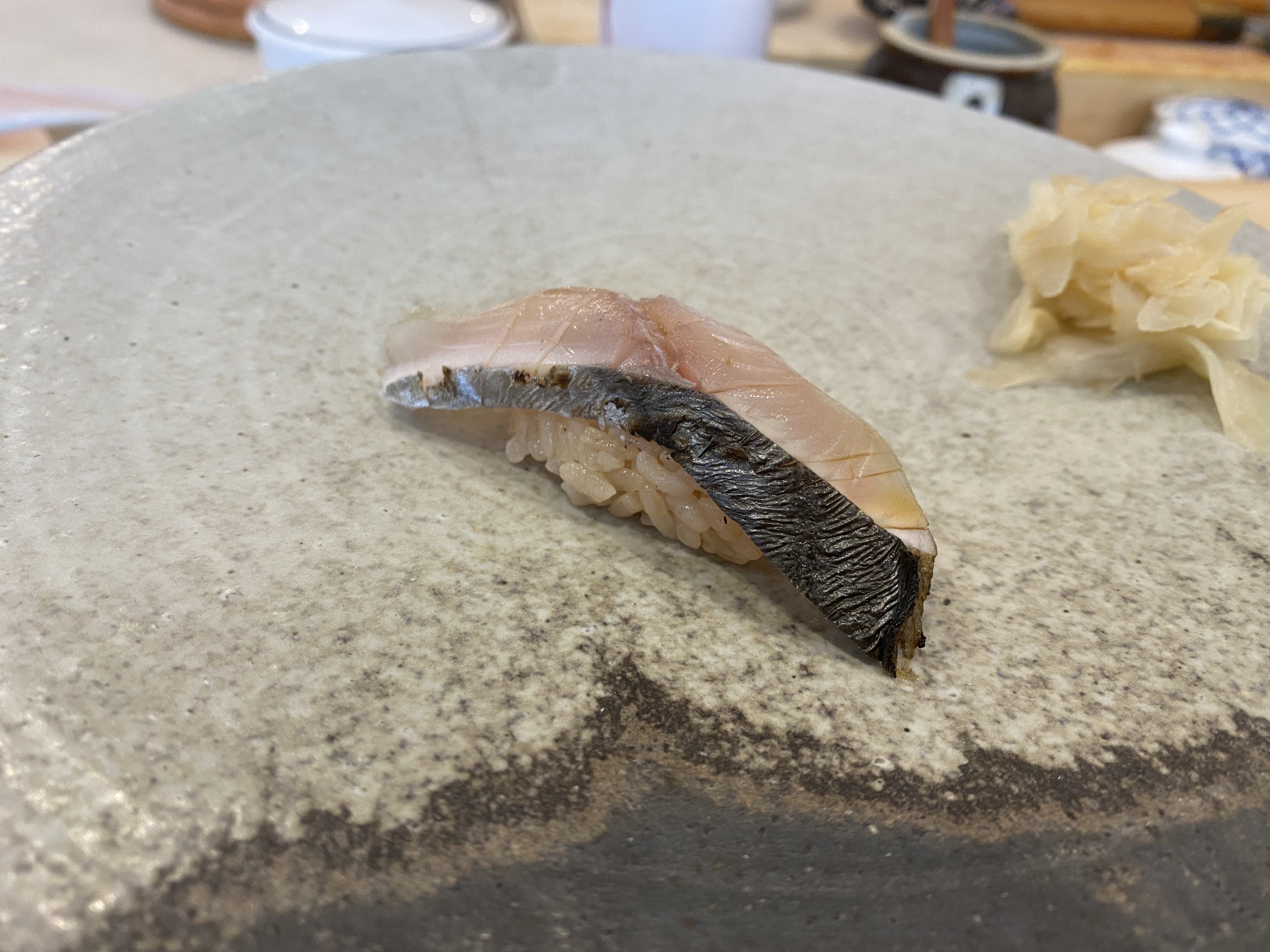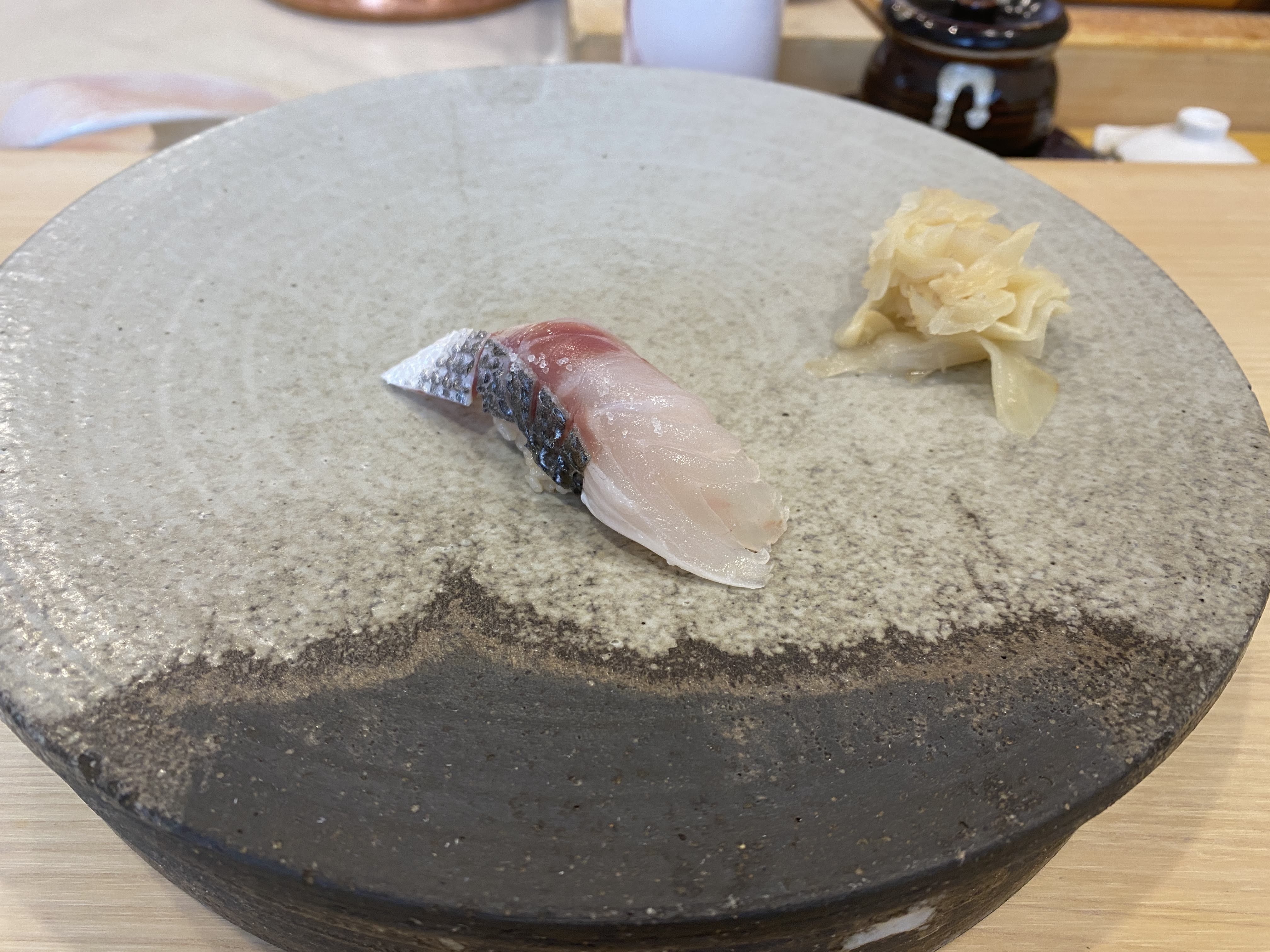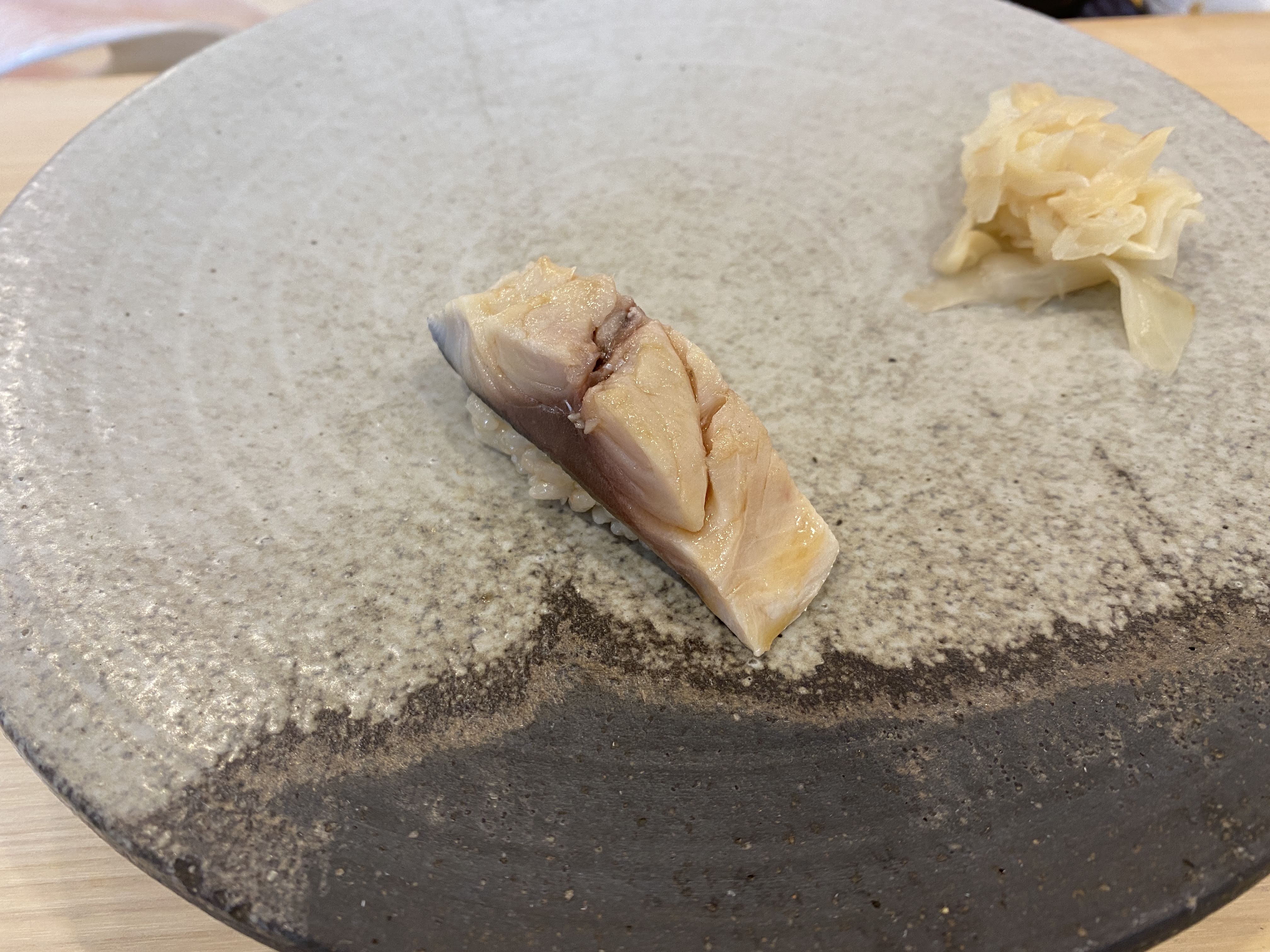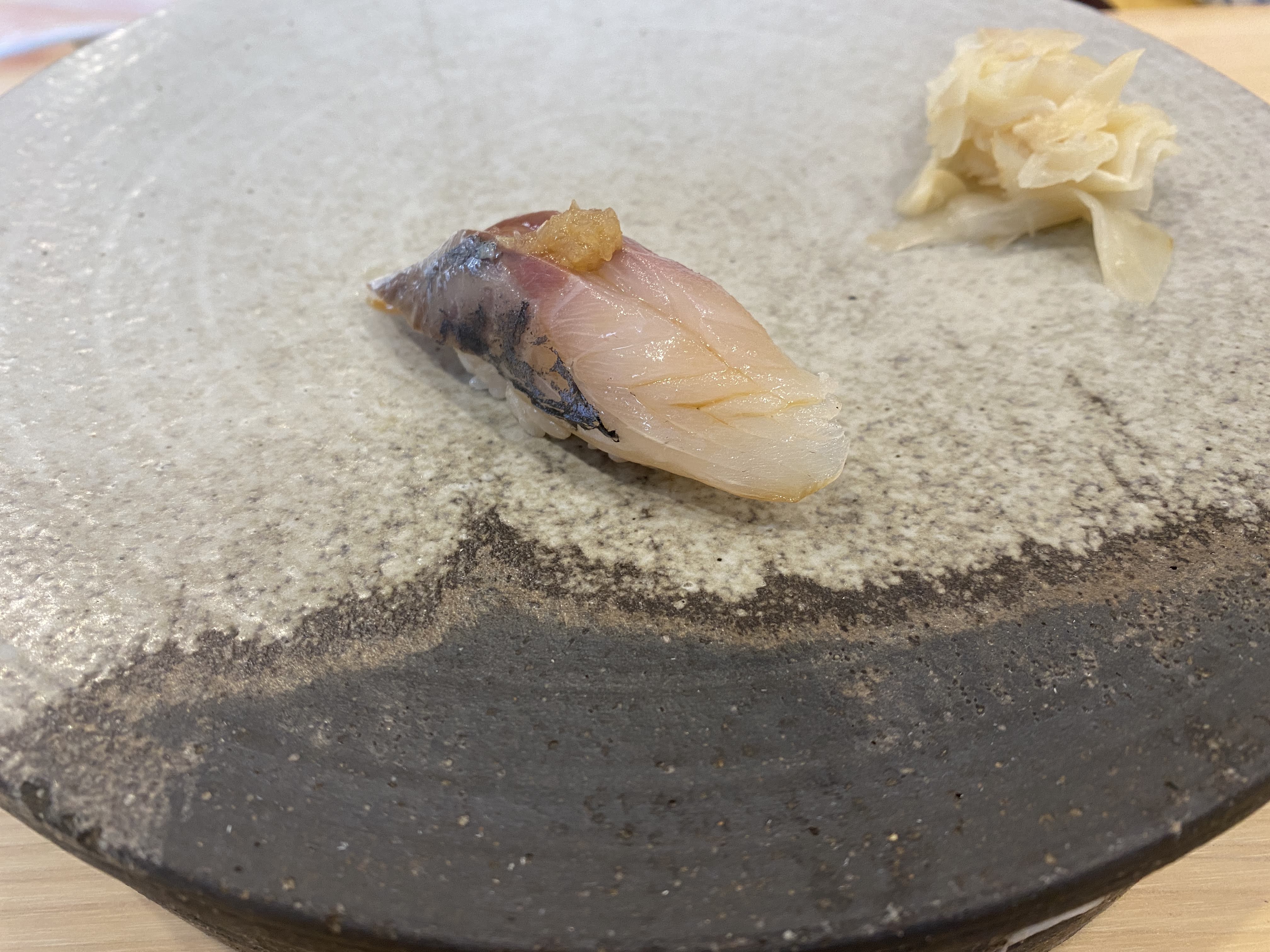이것은 삼치 직화구이 초밥. 구운 삼치를 올렸는데 겉에만 살짝 익혀 올린 삼치다. 항상 삼치구이로만 삼치를 접했는데 이렇게 반만 익은 상태로 만나니 낯설었다. 맛은 잘 모르겠다. 인상적인 맛은 아니었다.