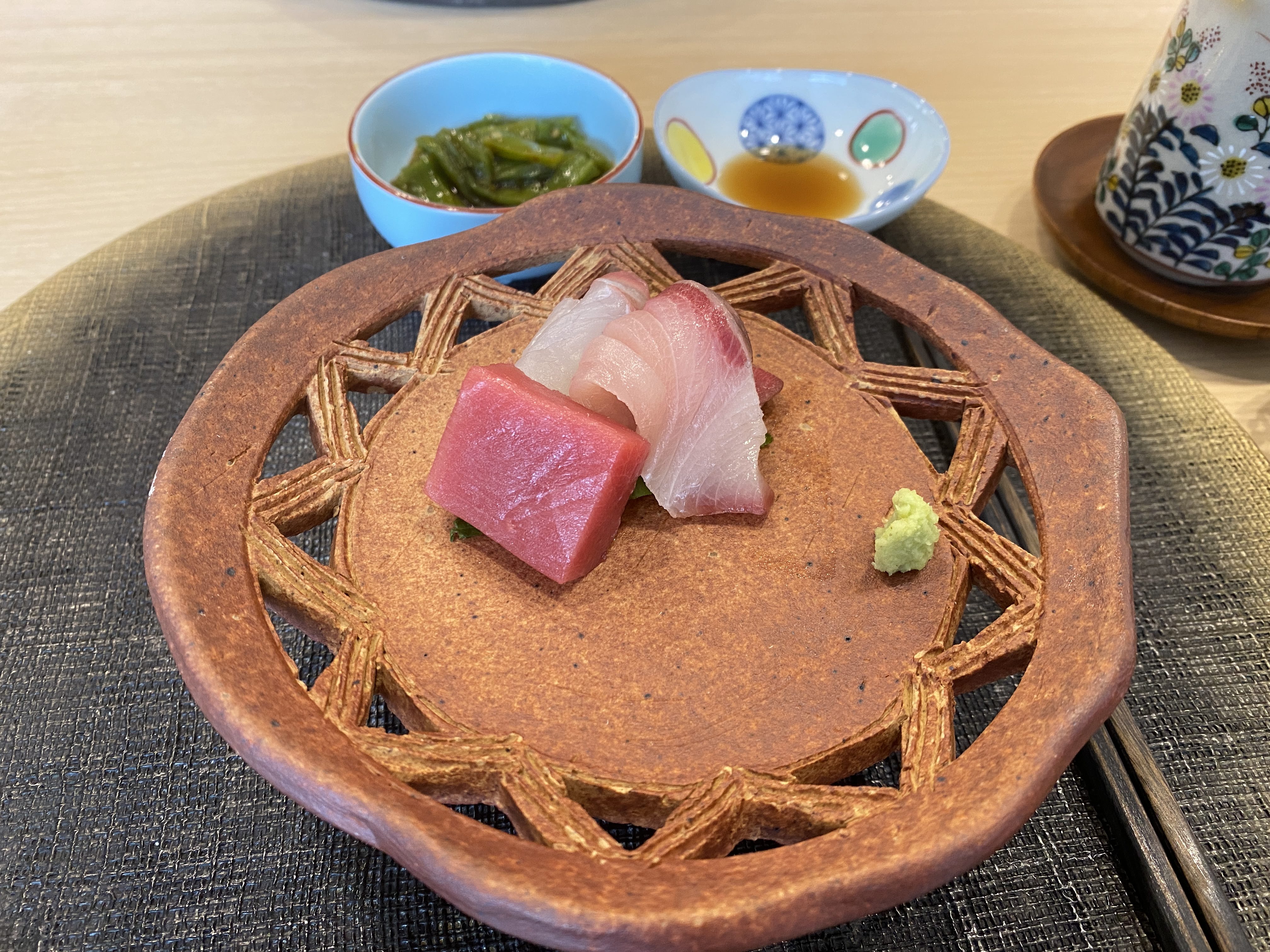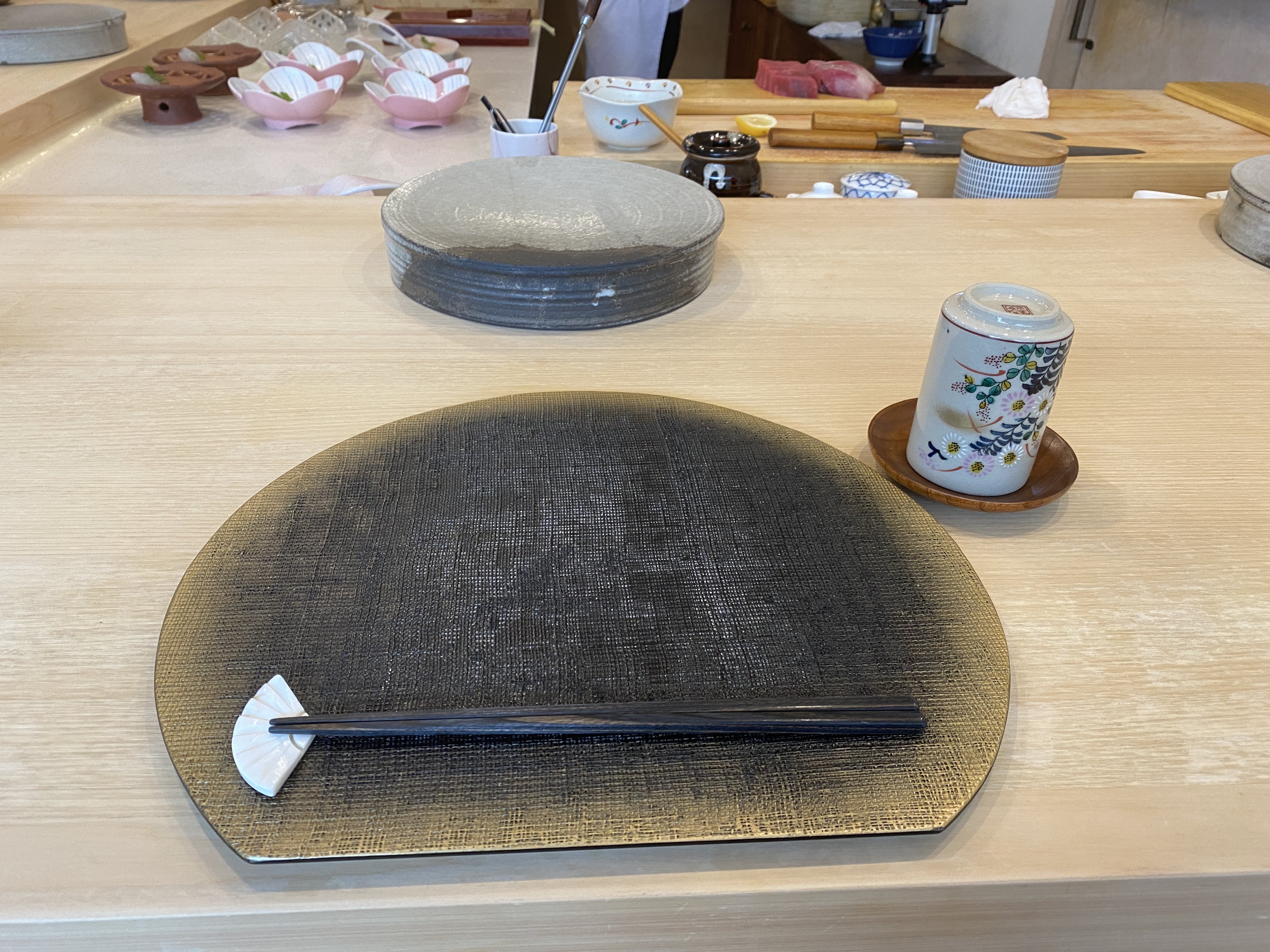 도착한 순서대로 자리를 안내받고 앉았다. 자리에 놓여 있던 말차와 젓가락, 그리고 위쪽에 동그란 접시에 초밥을 놓아 주신다.