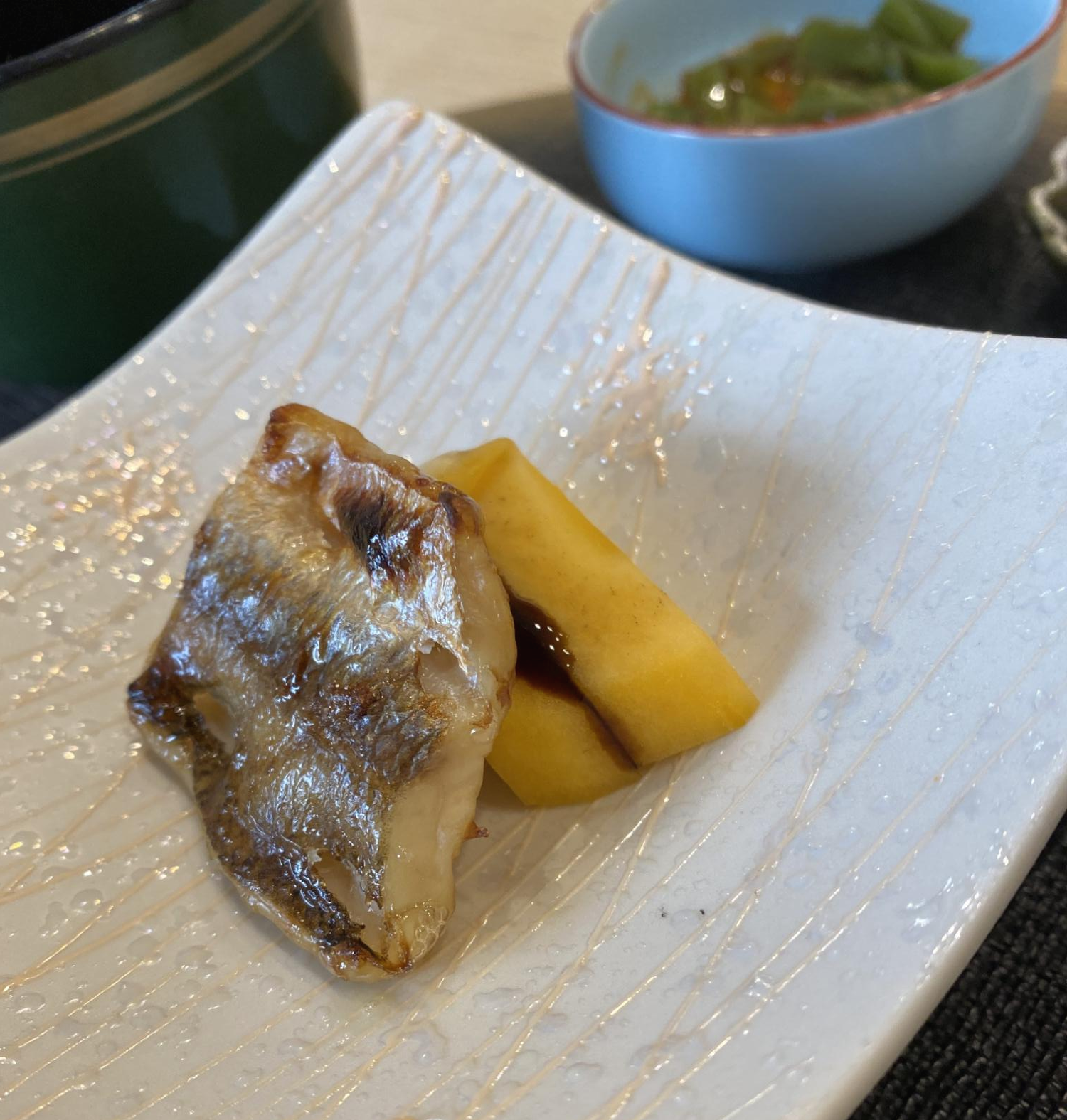 꼬치고기 구이와 단감. 꼬치고기를 구운 것 아래에 발사믹 소스를 뿌린 단감이 있다. 꼬치고기는 약간 반건조가 된 건지 식감이 쫄깃쫄깃했다. 단감이랑 발사믹은 개인적으로는 잘 안 어울리는 것 같다.