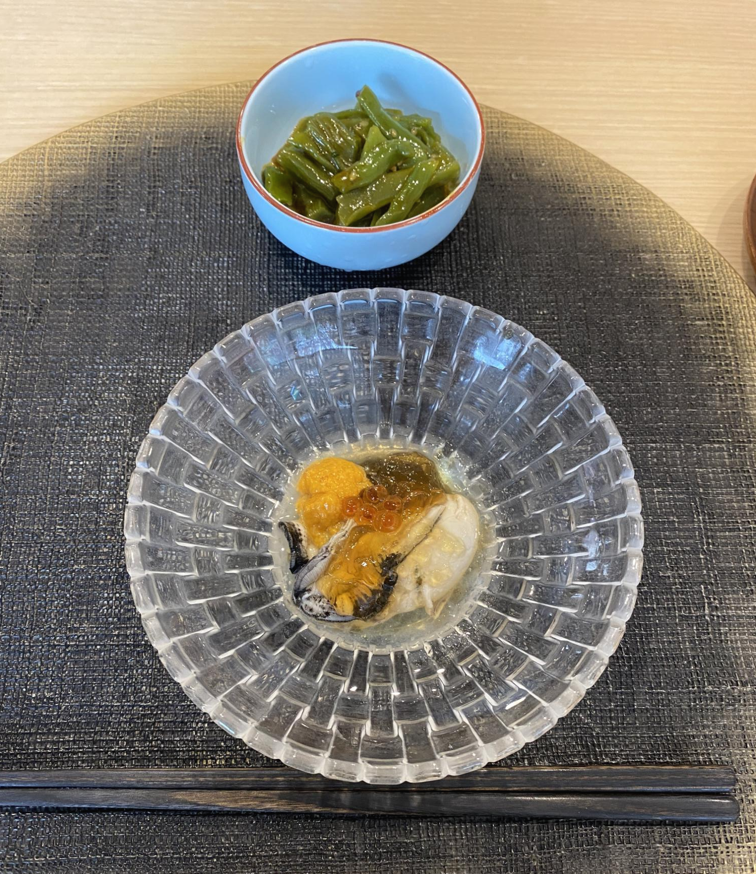 먼저 식전 요리로 굴과 연어알, 성게알, 해초알이 소스와 함께 어우러진 음식. 곁들임 반찬으로는 줄기상추가 나온다.